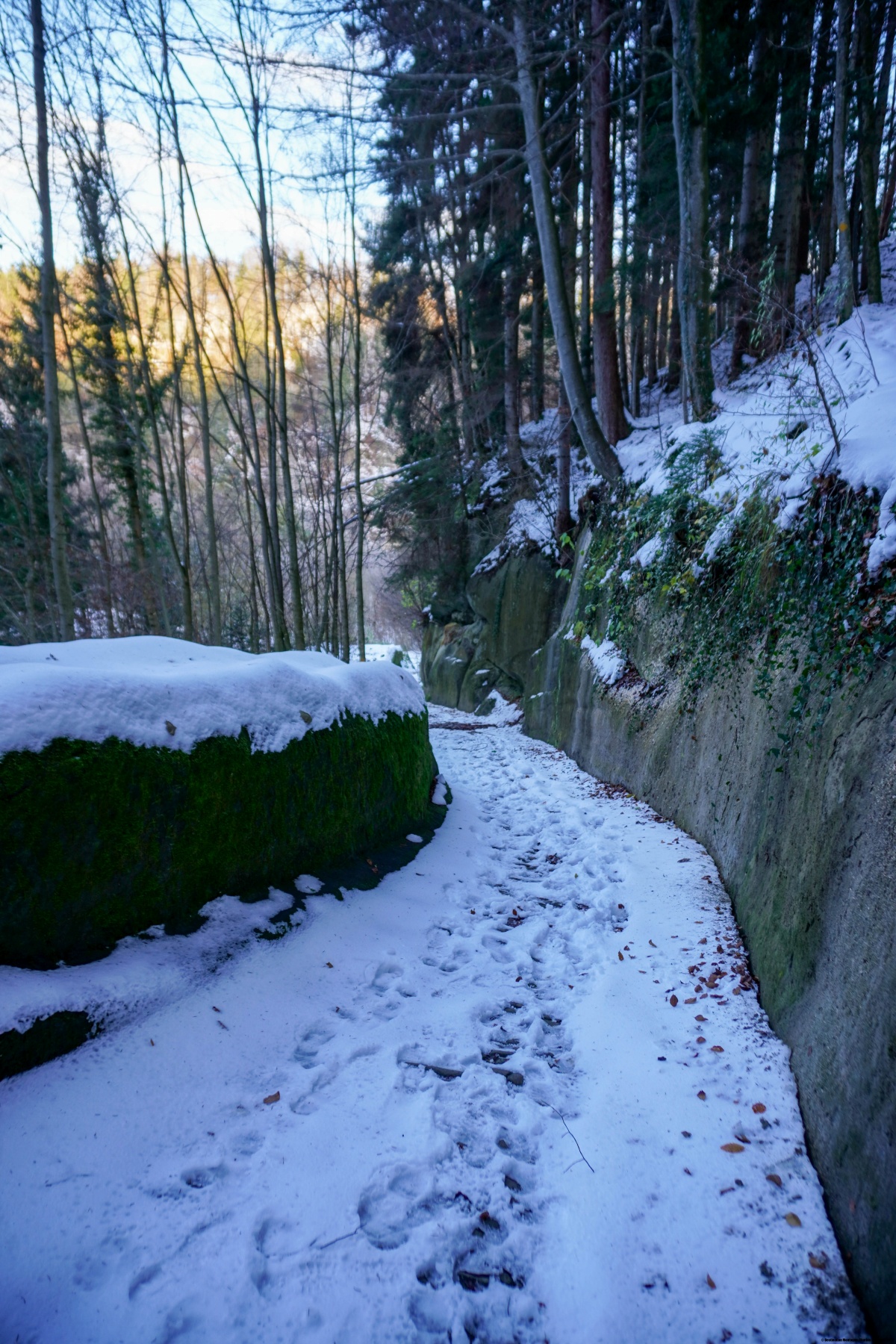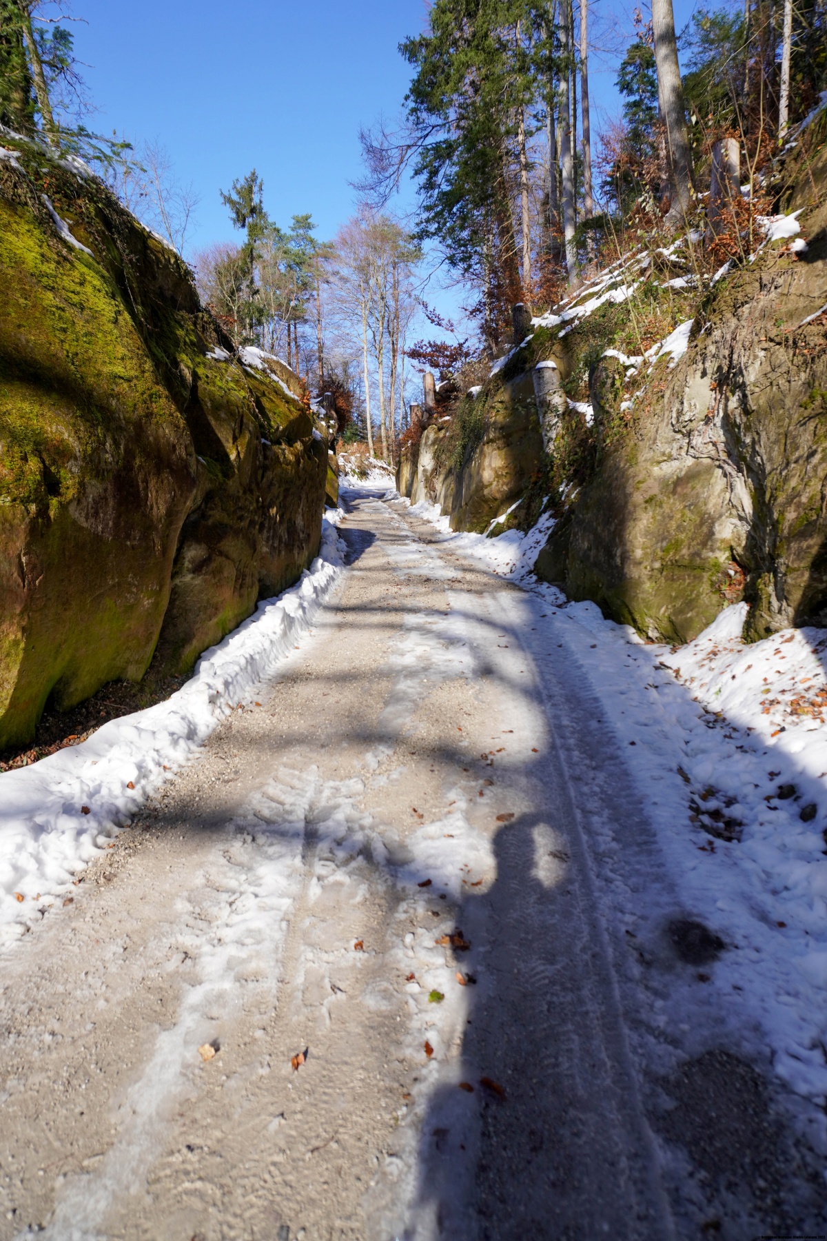 Depuis Schwarzenburg, il s’agit d’abord de traverser un petit plateau avant de descendre sur la Singine. Au bout du plateau, on descend le long d’une route goudronnée assez raide pour atteindre le fond d’une cuvette à partir de laquelle le chemin descend de manière raide en direction de la Singine. Au début de la descente, le sentier est aménagé avec des escaliers. Plus bas, on aborde le cheminement historique entre les parois de grès. Une fois arrivé au bord de la Singine, on remonte un bout le long de la rive de cette rivière avant d’atteindre une route. Cette route traverse la Singine pour rejoindre le territoire de Fribourg à Sodbach.