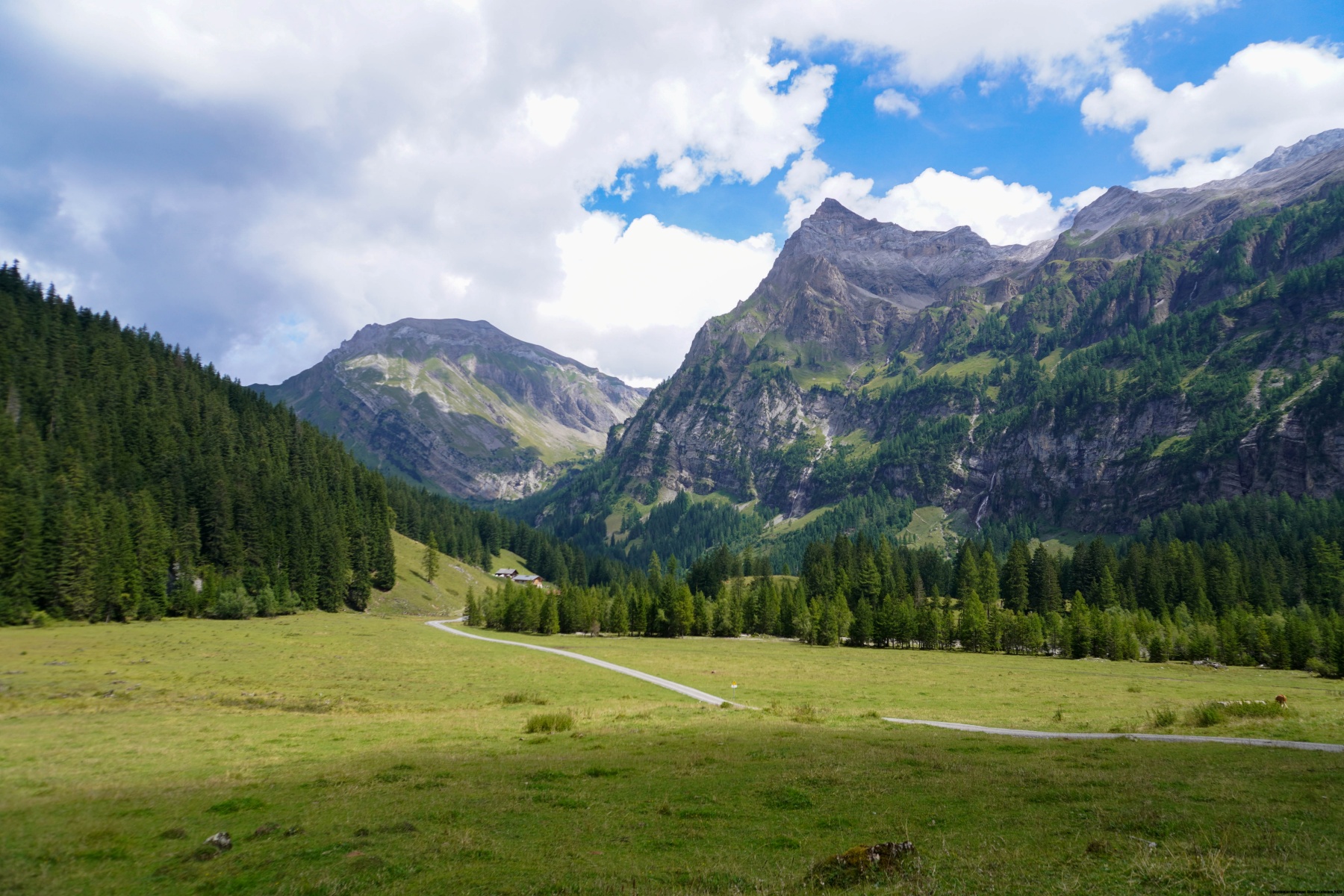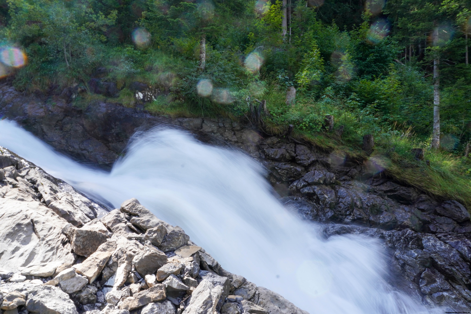 Depuis le bout de la vallée, deux sentiers sont possibles. Mais il est avantageux de suivre celui qui longe la cascade au plus près. On subit alors des embruns assez forts par endroits. Plus haut, à la Barbarabrücke, on se fait copieusement asperger. Après le pont, on retrouve l’autre cheminement, qui suit alors un chemin carrossable assez raide par endroits. Après avoir rejoint une zone bien plus plate, on ne tarde pas d’atteindre la buvette d’alpage du Rezlisbärgli. Il vaut alors la peine d’aller voir les Sibe Brünne (les sept fontaines), où l’eau ressort directement de la paroi de rochers.