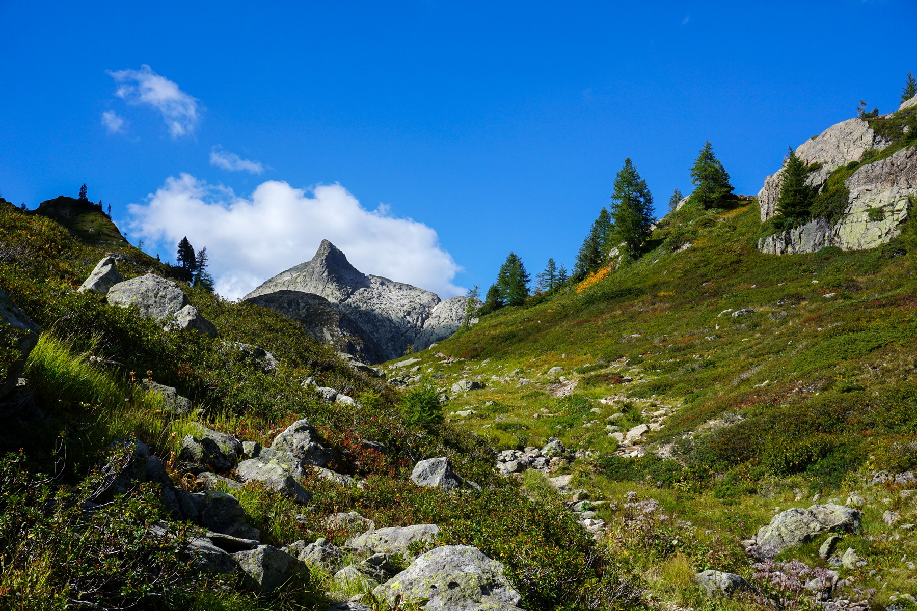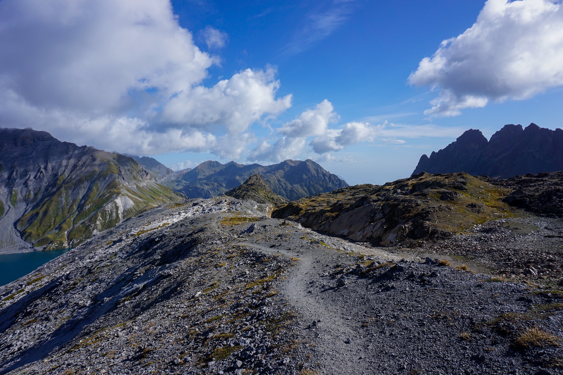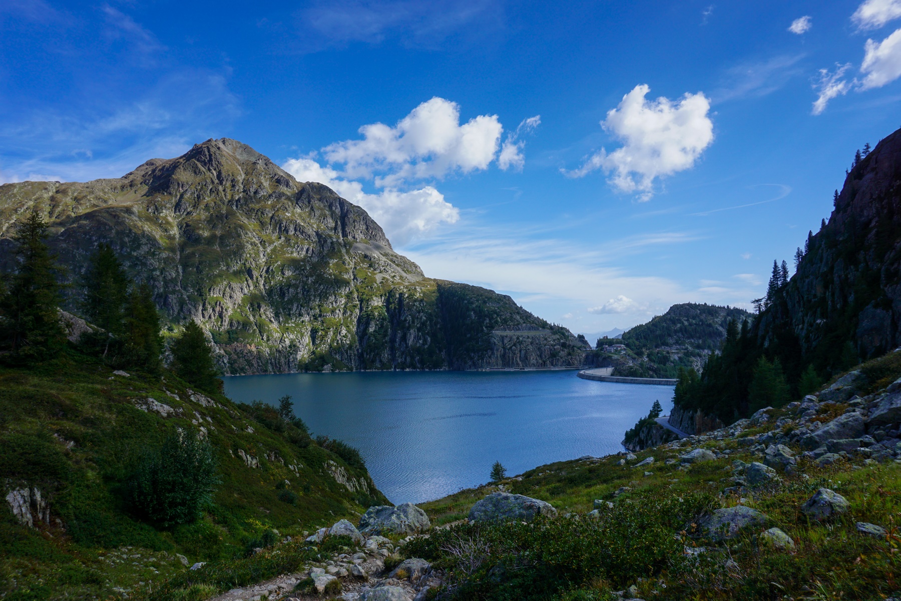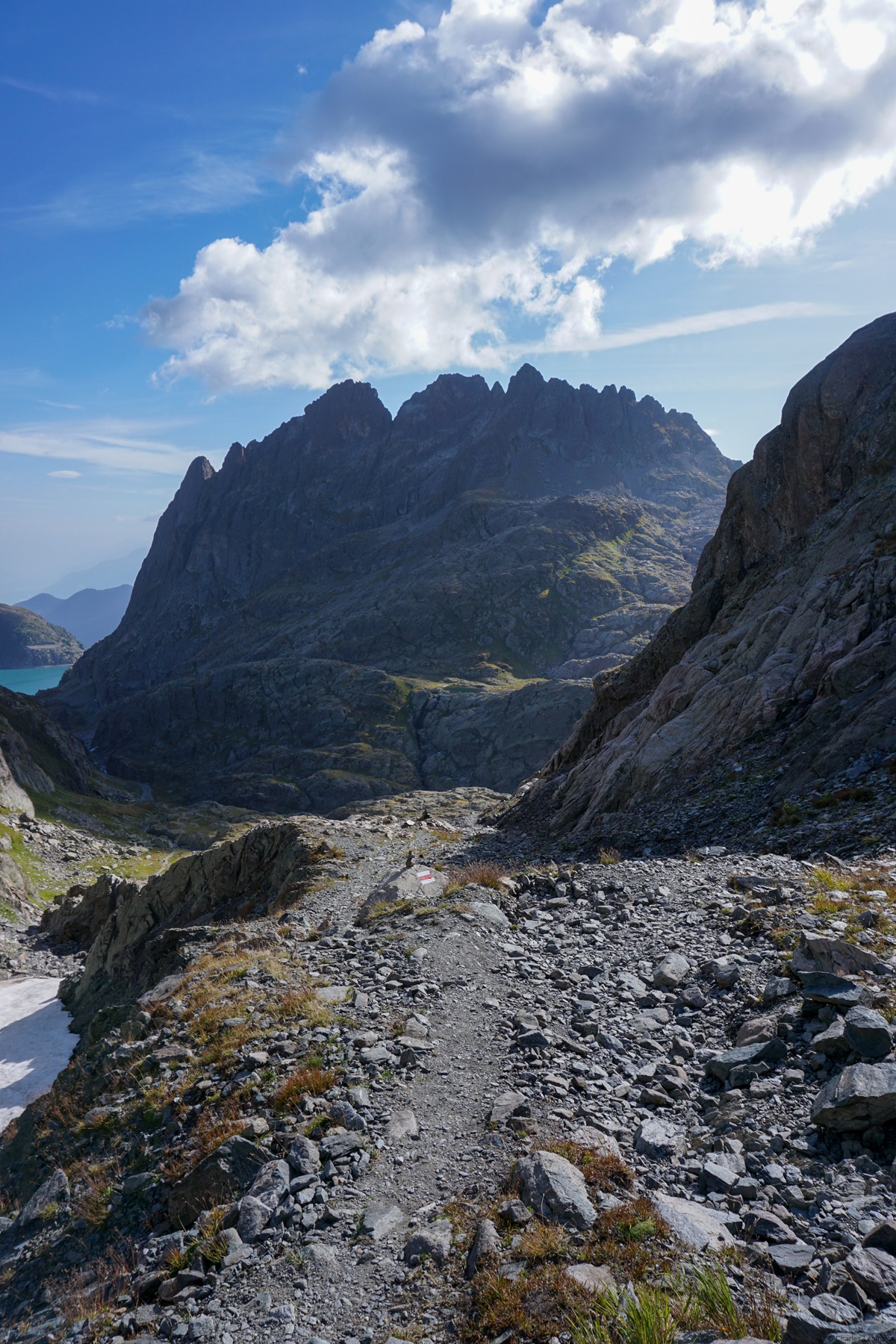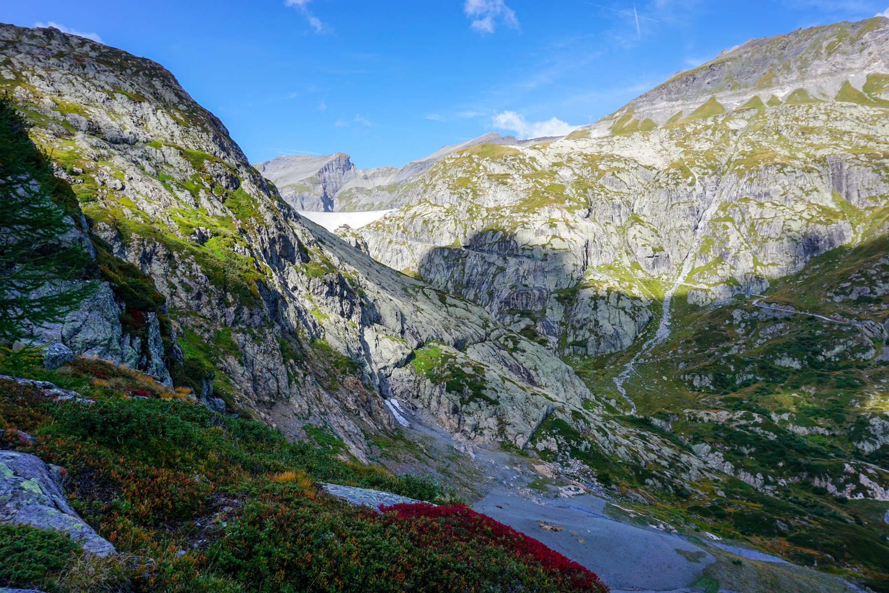 Departing from Col de la Gueulaz, one first crosses the impressive Emosson arch dam and follows a small, paved road which leads to Vieux-Emosson. At one point, it is worth following a small path allowing to cut the lace that the road makes.