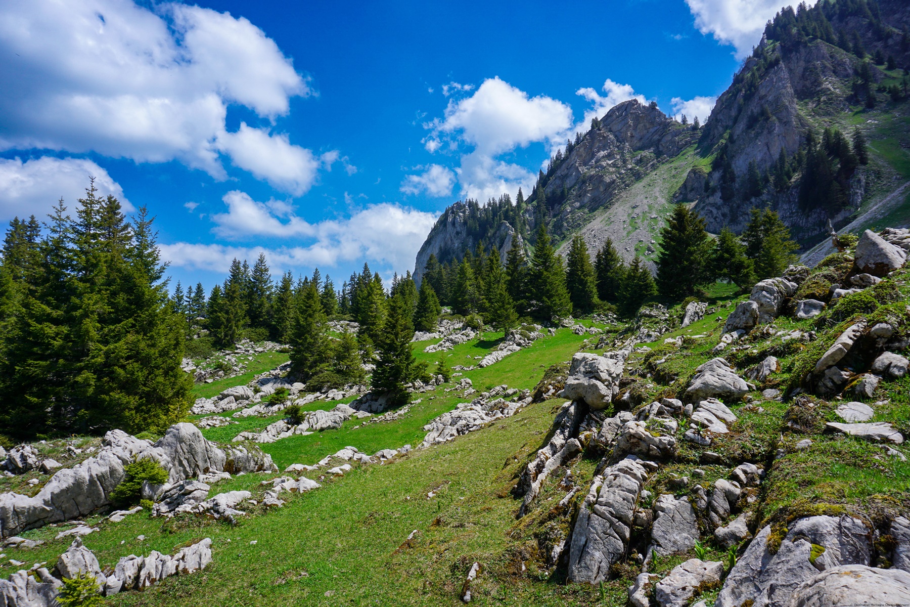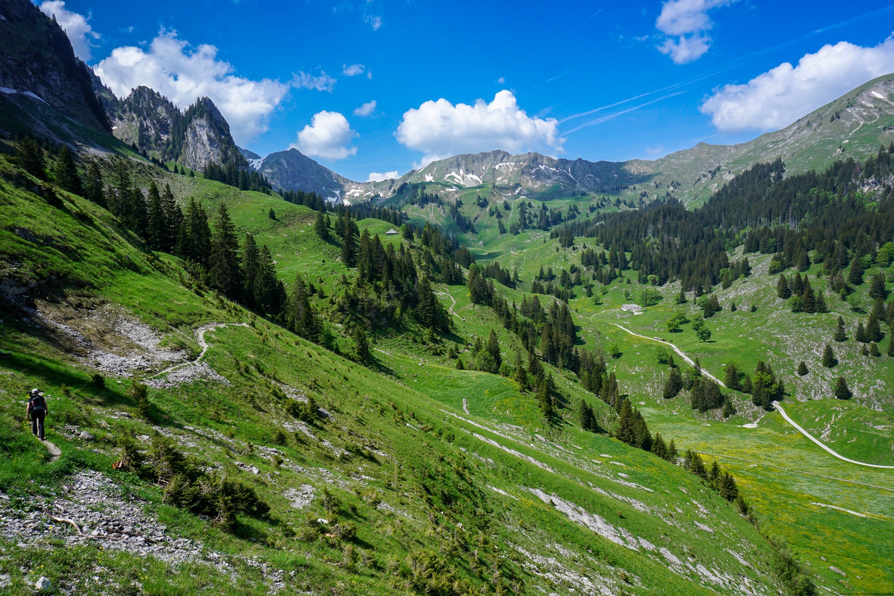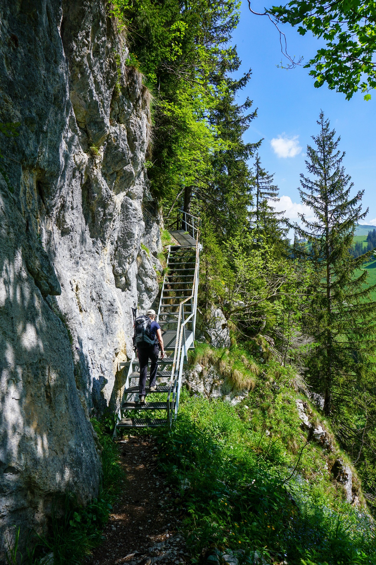 Von der Bergstation geht es dann durch den Hang über zur Untere Euschels-Hütte. An dieser Stelle verlassen wir links den Weg, der zum Col des Euschels hinaufführt, und folgen zunächst eine Schotterstrasse, die in der Talsohle eine weite Kurve macht. Im weiteren Verlauf verwandelt sich die Strasse in einen Pfad und überwindet mithilfe einer Metalltreppe eine kleine Stufe. Nach einem kurzen Abstieg erreichen wir die Stierenberghütte, wo der Weg wieder ansteigt, hinauf zum Rippetli. Hier bricht der Bergweg ab, führt hinauf und überquert die Hänge unterhalb der Spitzflue.