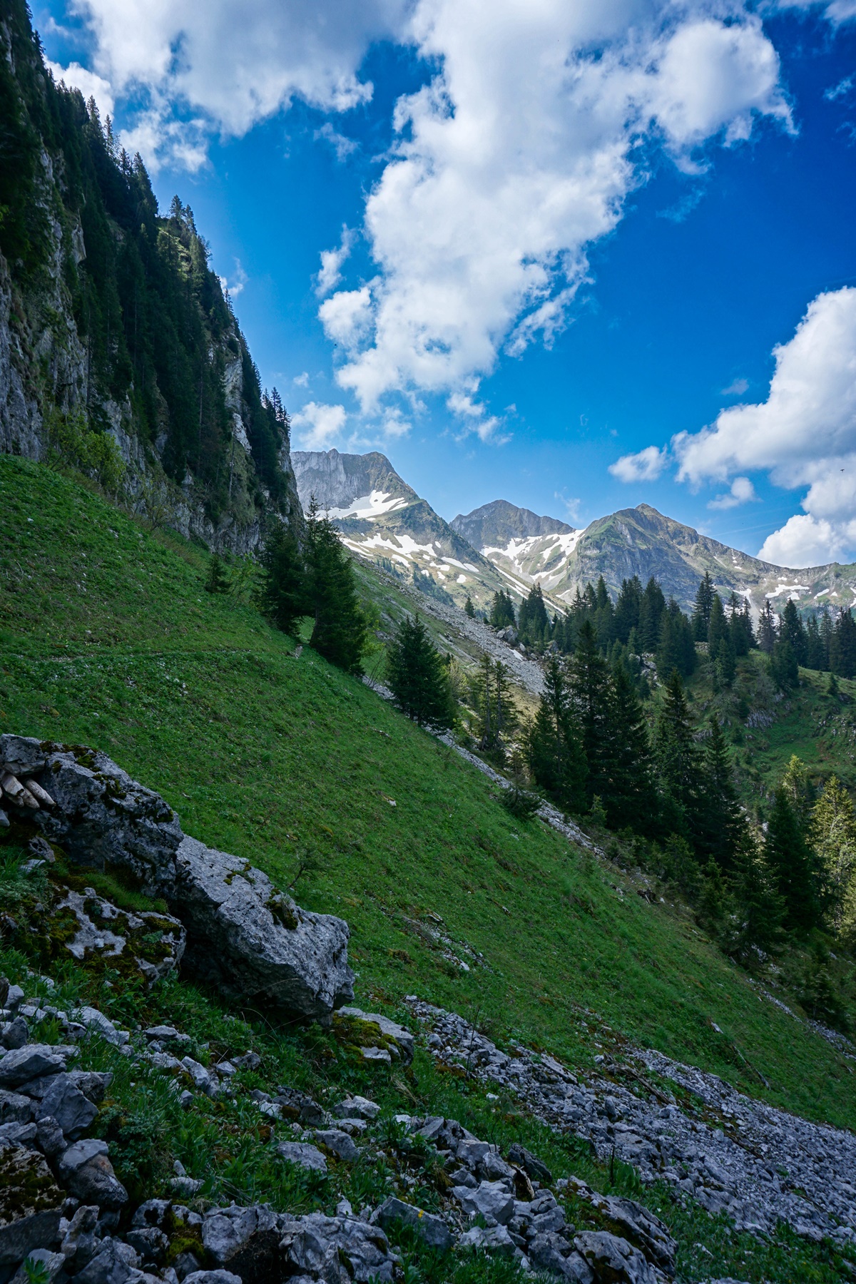 Nachdem Sie an einem Stall vorbeigekommen sind, steigen Sie erneut auf und erreichen den Fuss des Türmli. Anschliessend überqueren wir die steilen Hänge, die von hohen Mauern dominiert werden. Die Schlagmarken rund um den Weg deuten darauf hin, dass es hier regelmässig zu Steinschlägen kommen muss. Es ist also wichtig, nicht zu lange zu verweilen. Am Ende der Querung müssen wir noch eine unangenehme Geröllstelle durchqueren. Glücklicherweise ist diese Querung sehr kurz.