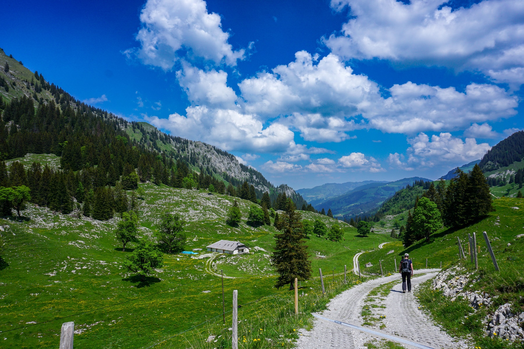 Wenn man den Schotterweg folgt, der teilweise sehr steil abfällt, dauert es nicht lange, bis man die Cerniets-Hütte erreicht. Ab hier wird der Weg etwas flacher. Erst nachdem man die Hütten Brecca und Steinige Rippa vorbeigegangen ist, wird der Hang steiler und man biegt in einen Pfad ab. Obwohl die Knie ein wenig leiden, ist es wegen der Steilheit möglich, schnell an Höhe zu verlieren. In der Nähe der Wälschi Rippa finden wir die Schotterstrasse, die wir oben verlassen haben.
