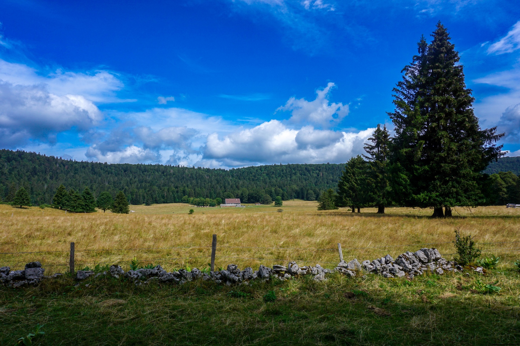 From Les Pâquiers, we followed the road to Môtiers for a long bit, until we found the signposted path that goes up towards Mont Aubert. We then crossed the Joux de Corcelles diagonally to reach the Serroliet pastures. There, the heifers, who must have been bored not to see anyone during the day, followed us to the passage through the fence beneath Mont Aubert.