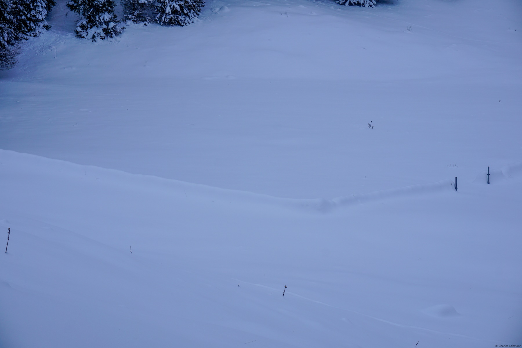 After the chalet, one can also cut through the meadow to reach the Pré Nouveau. This requires crossing a small stream where water flows, even in winter. Crossing it is not always easy. After the stream, one climbs the meadows before crossing a fence to reach the Pré Nouveau. From this chalet, there are several possibilities. In winter, however, it is advantageous to follow the forest path starting above the Pré Chaumé to reach Mont Roux directly.