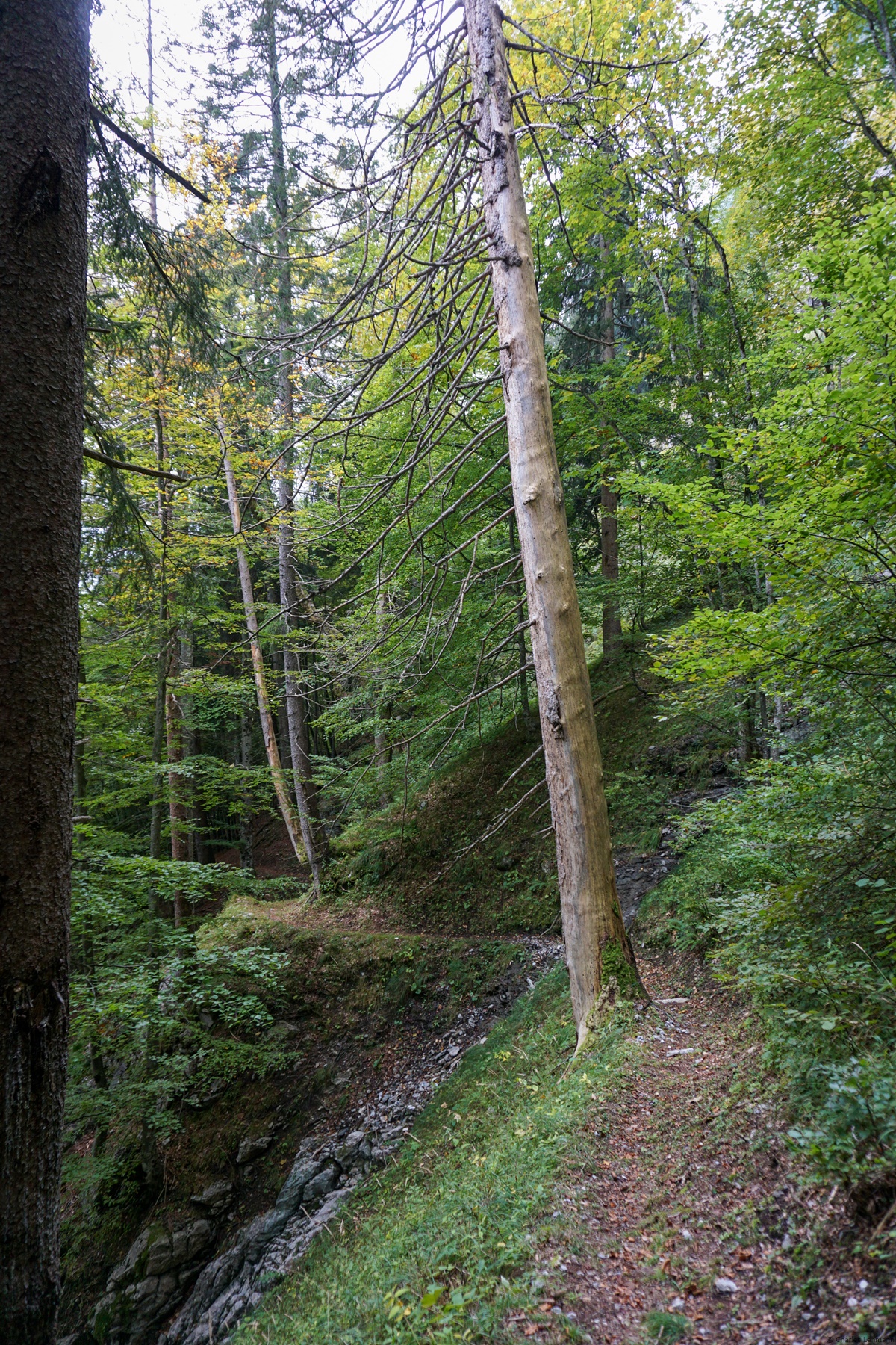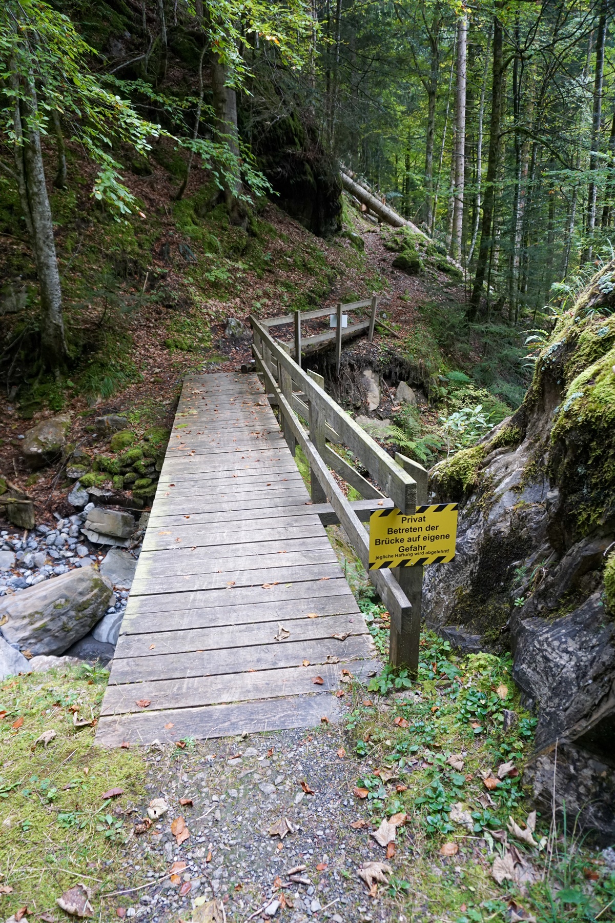 Deswegen hatte ich die Absicht wieder einmal durch die Schlucht aufzusteigen. Von Engelberg aus geht es über Espen und Örtigen bis unterhalb Eggli. Beim Eingang der Schlucht stand einen Hinweis, dass der ganze Weg wegen Forstarbeiten gesperrt war. Ich tat es ungern hinwegzusetzen, aber die Neugier war zu gross. Deswegen ging ich trotz der Sperre weiter. Zum Glück waren die Forstarbeiten auf die ersten hundert Metern des Weges konzentriert und niemand vor Ort.