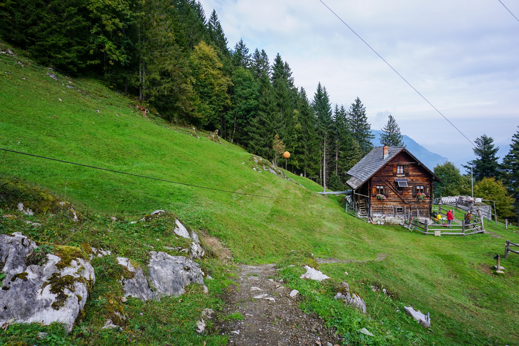 Vom Chrämergaden geht es dem breiten Weg leicht hinauf bis zur Haarnadelkurve. Dort trifft man die erste Markierung (rote Punkte), die nach Unter Zingel führen. Der Abstieg zur Hütte Unter Zingel ist zwar teilweise steil, aber gut gepflegt.