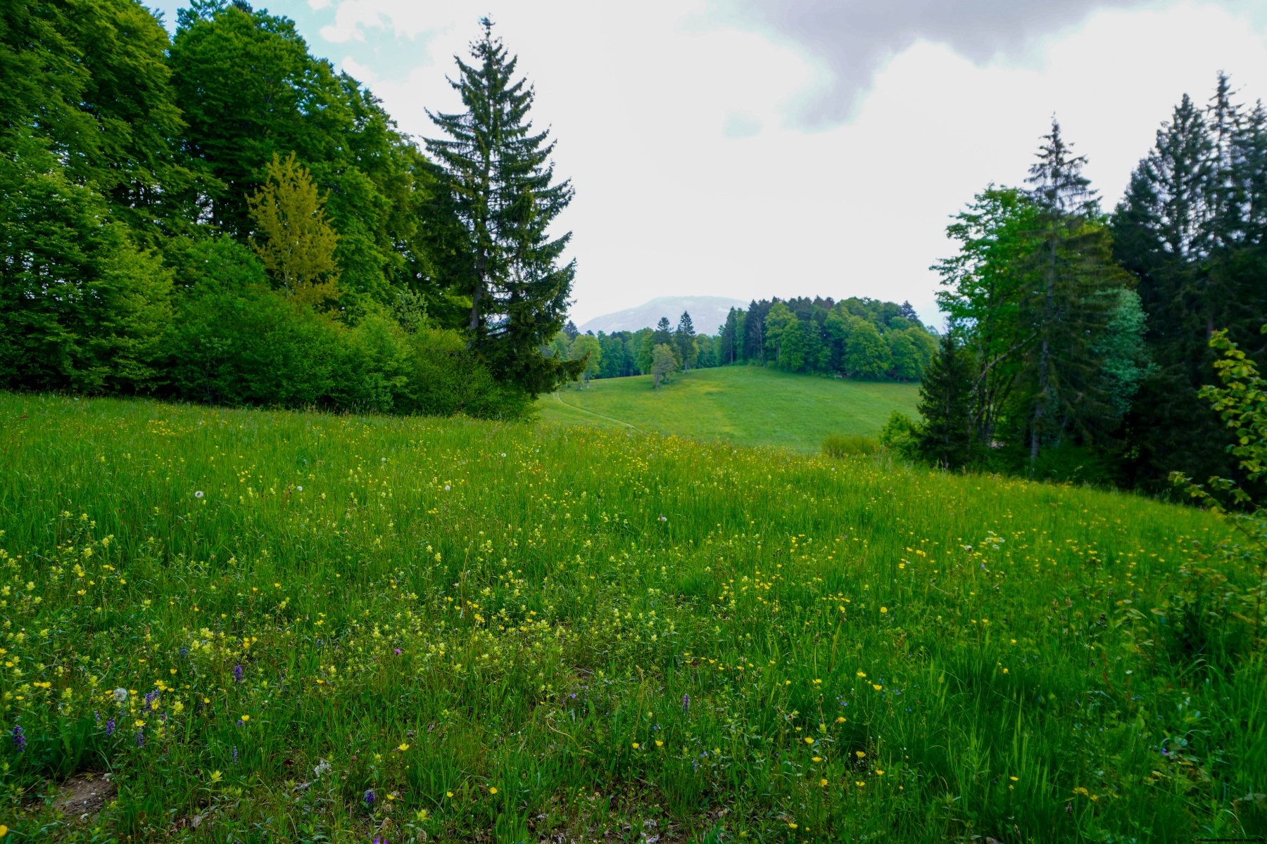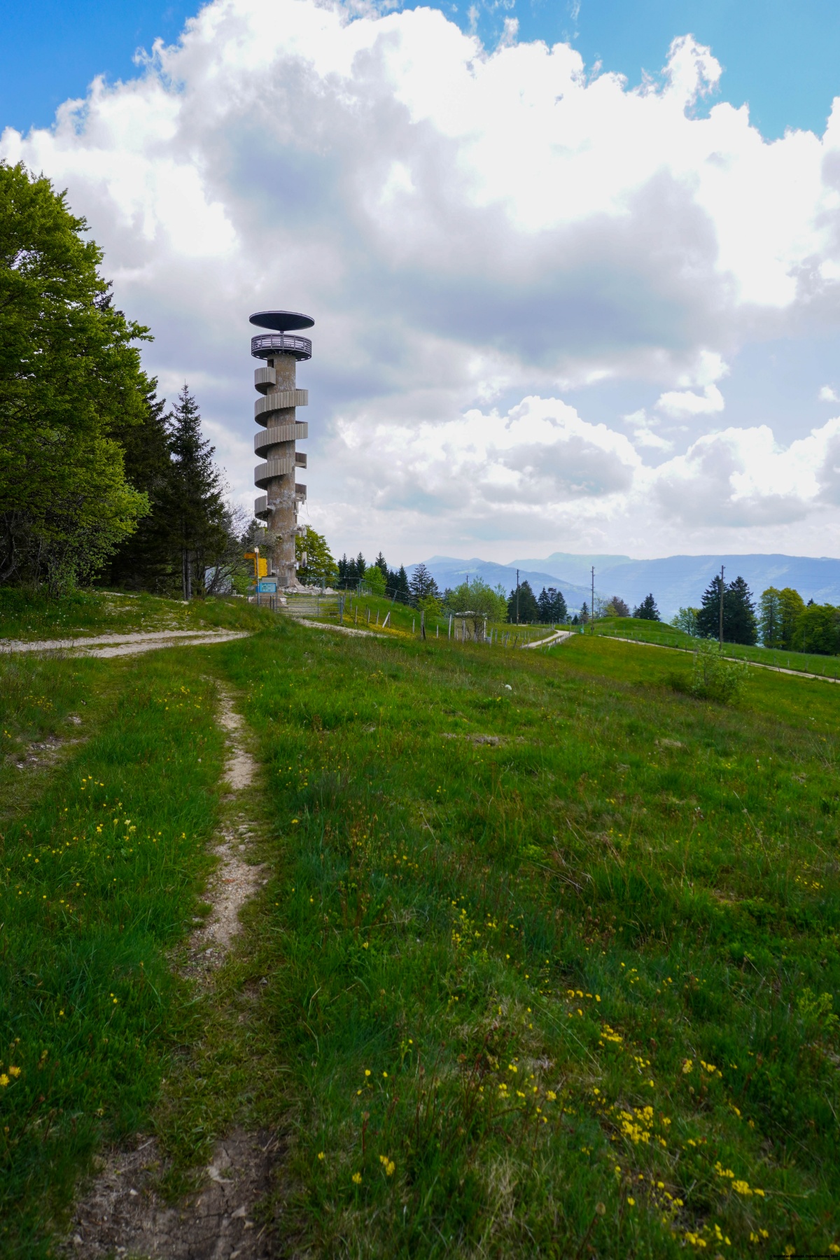 Wir sind also vom Bahnhof Moutier aus bis zum Perrefitte-Eingang gewandert. Dort hatten wir zwei Möglichkeiten: Entweder über die Combe Fabet oder über die Montagne de Moron. Da wir die Combe Fabet schon einmal gewandert waren und obwohl der Weg sehr interessant ist, haben wir uns für die zweite Variante entschieden. Dabei hat man einen Blick auf die Stadt Moutier und auf das Raimeux. Obwohl der Hang insgesamt nicht sehr steil ist, gibt es doch einige steilere Abschnitte, vor allem oberhalb der Montagne de Moron und auf dem Weg zu den Prés du Haut de la Charrière. Eine schöne Sache ist, dass man den Turm erst sieht, wenn man ganz nahe ist. So hat man nicht das unangenehme Gefühl, dass man nicht vorwärtskommt.