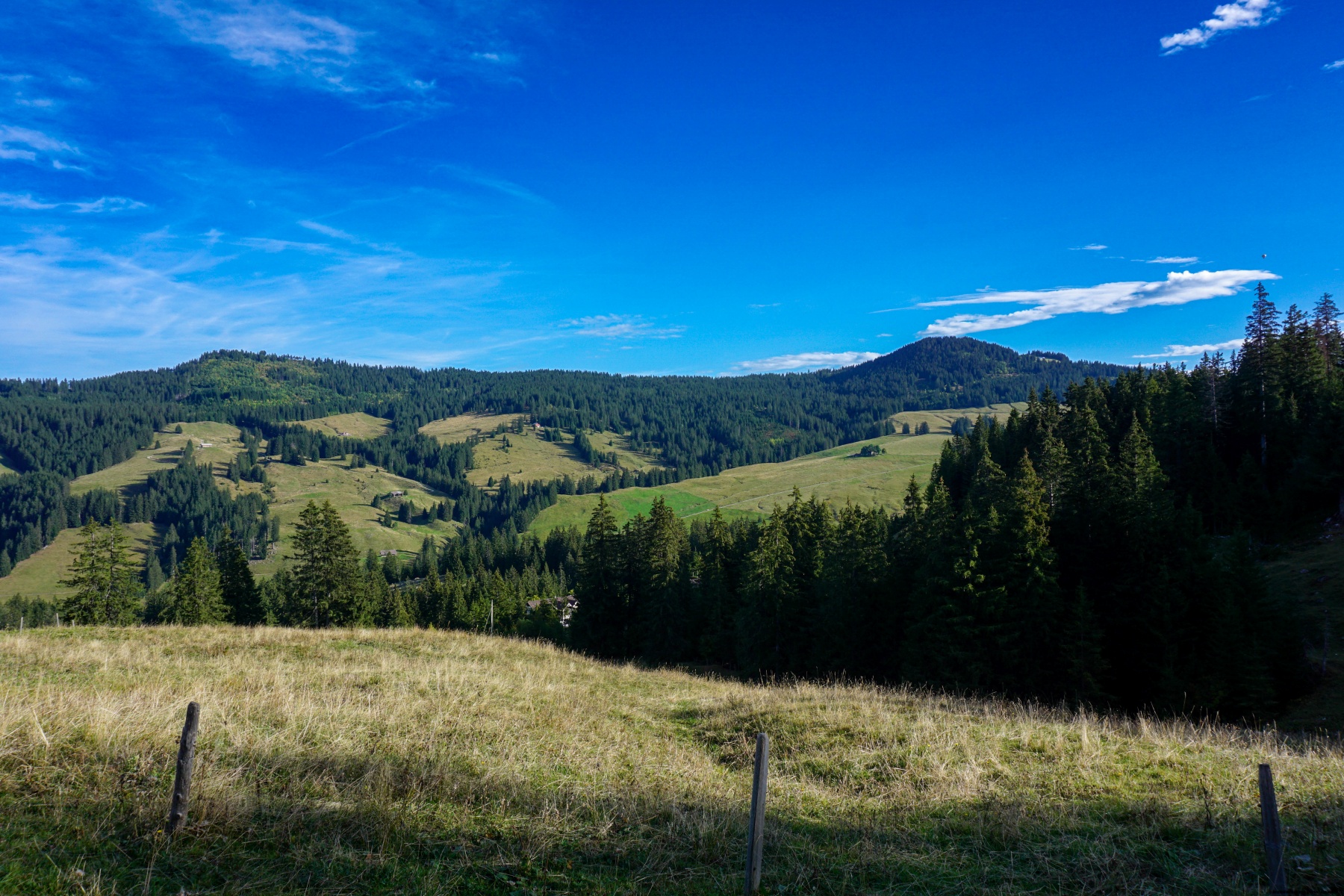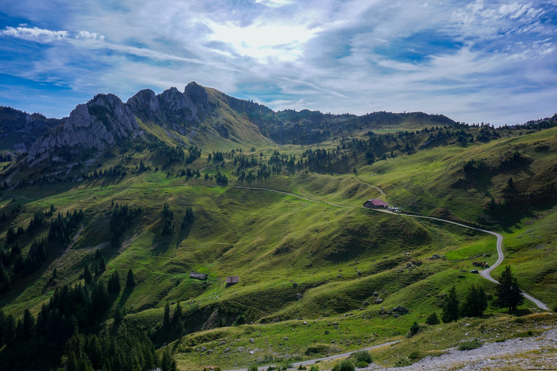 After passing by the hotel, we begin to climb up the hill towards the Louigrat. At some point, we pass through a rather humid area where the smell of rotten egg is very pronounced. This is probably where the bathwater is collected. More than half of the minerals in this water are in the form of sulphates, with the resultant smell. A little further up, you follow the ridge to the Louigrat. There, the trail doesn’t follow nice serpentine, but goes straight up the slope. It’s quite steep and difficult until you reach the top of the ski lift. After that, you continue to climb along the ridge to the Hürlisbode. At this point, you change sides of the ridge and cross the hillside to reach the Alpiglegalm. A small trail would allow you to continue along the ridge from the Hürlisbode, but the slope remains steady, and the trail is not very clear.
