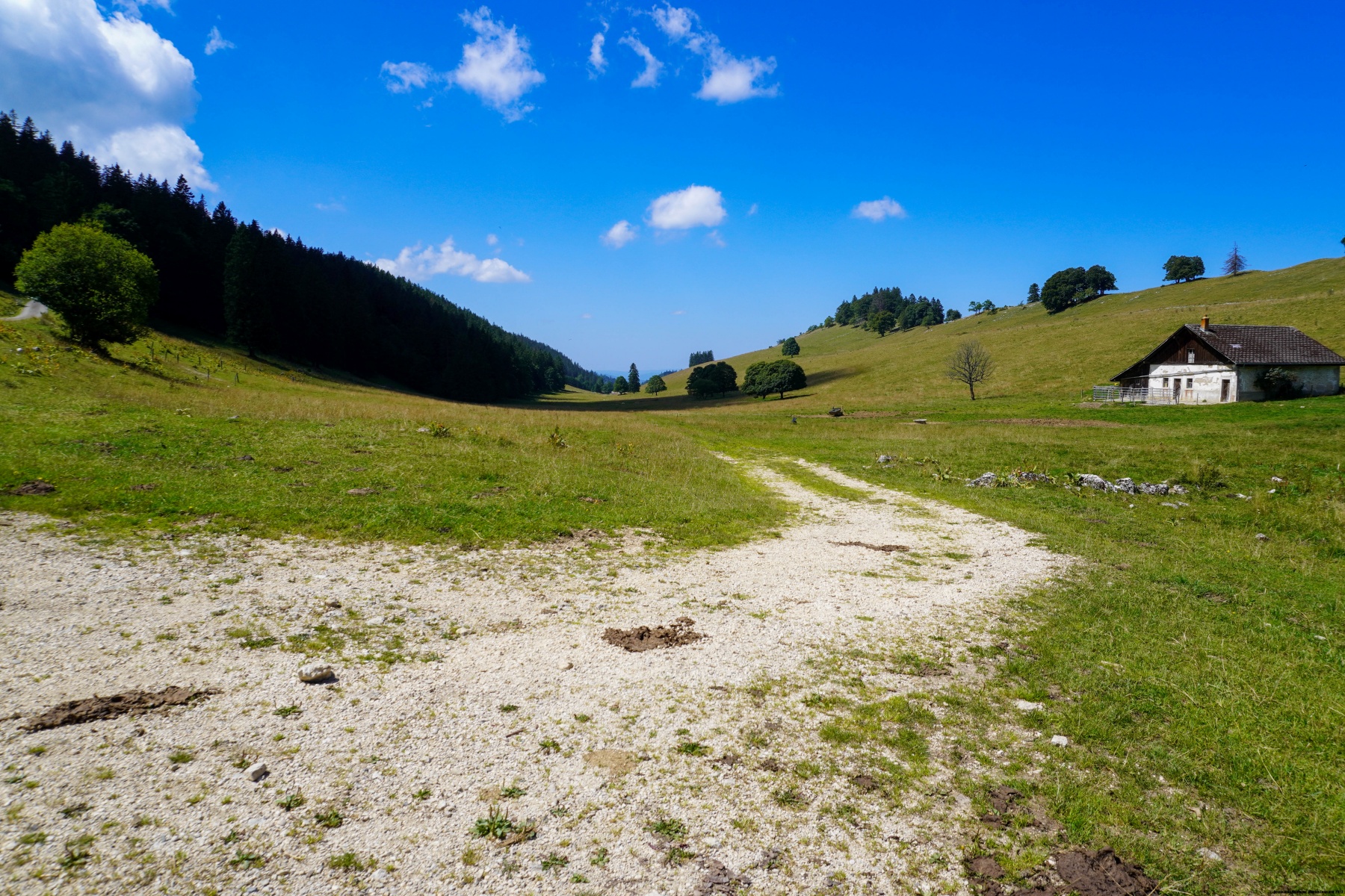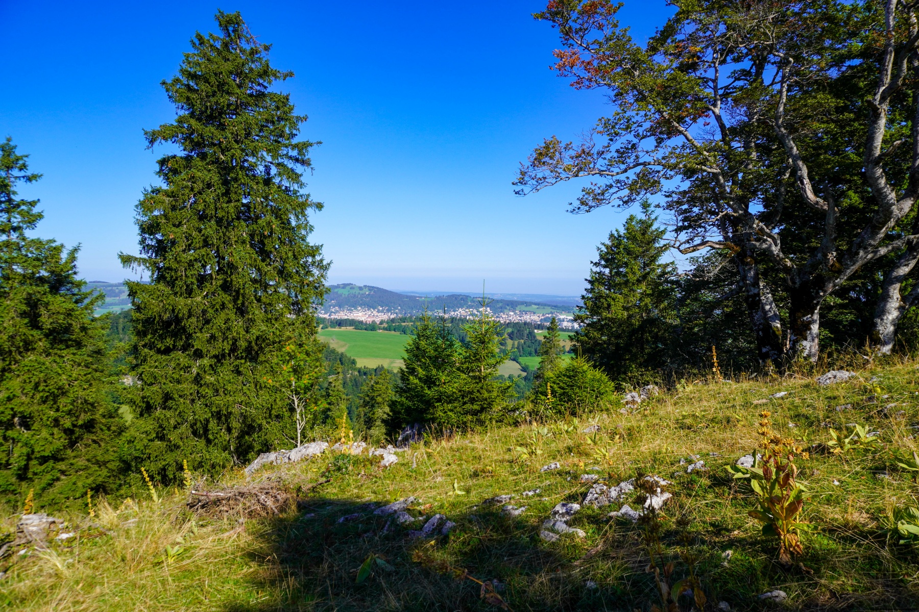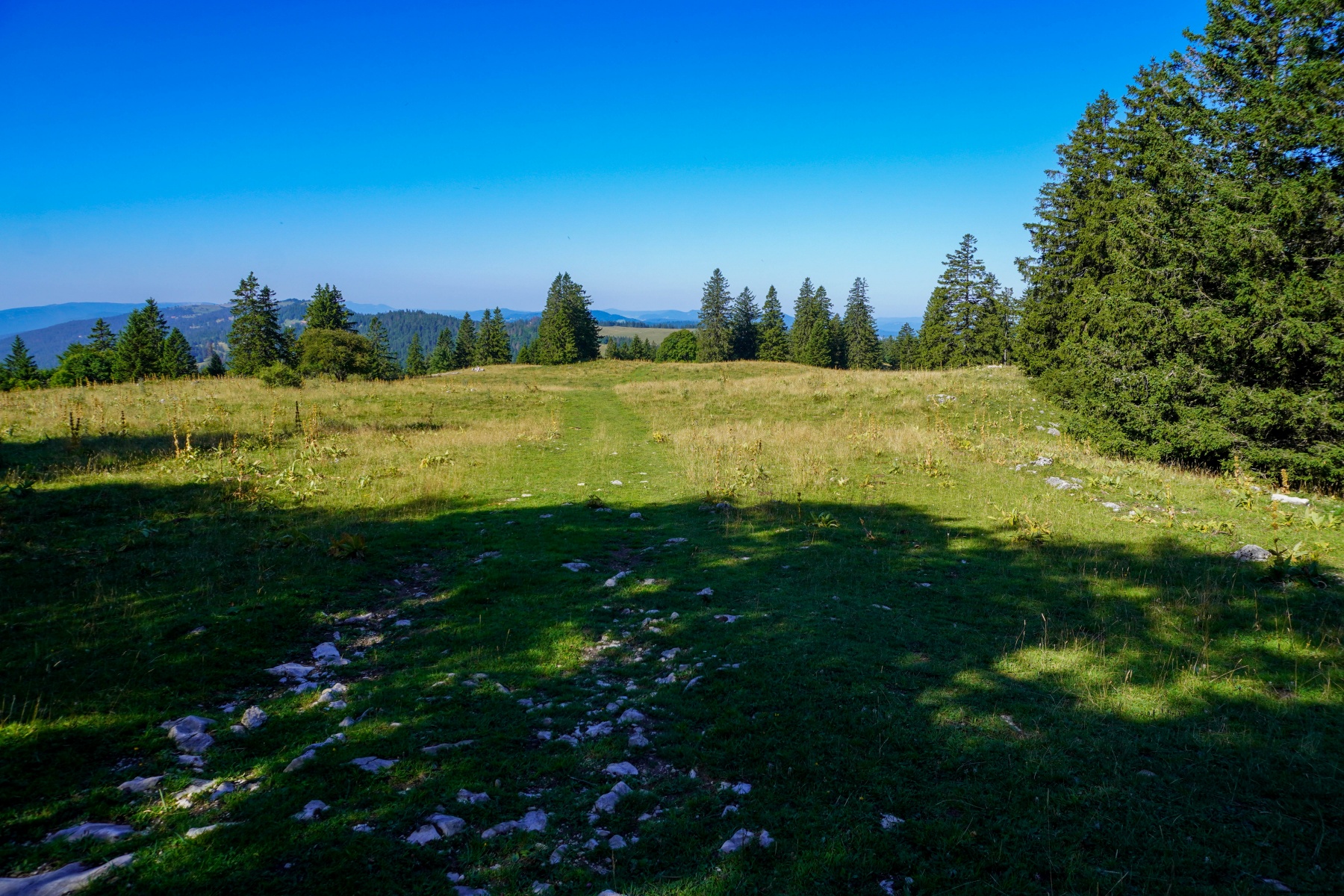 An diesem Tag waren wir überrascht, wie wenig Leute am Parkplatz des Col de la Vue des Alpes waren. Wir hatten erwartet, dass es viel mehr Leute geben würde. Ebenso waren beim Aufstieg vom Col nur wenige Leute auf dem Weg zum Mont d’Amin, aber sie hielten am Waldrand des Gipfelgrats nach den ersten Weiden des Petit Mont d’Amin an.