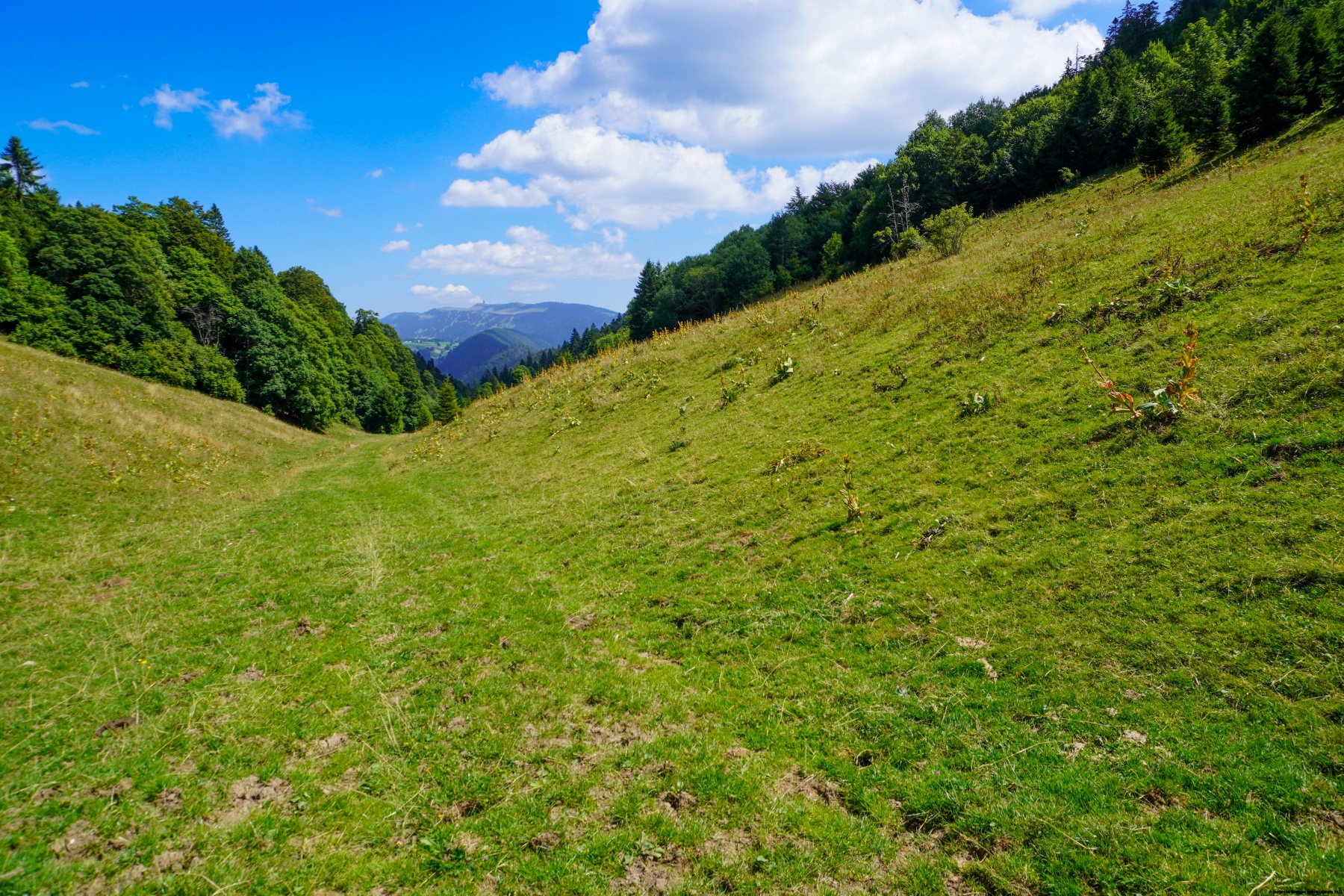 Nachdem wir den Gipfelgrat überquert und am Putteret abgestiegen waren, gingen wir durch die ziemlich überraschende Schlucht des Pertuis, bevor wir der langen Combe folgten, die zur Grande Berthière führt. Diese Combe ist ziemlich lang und eintönig (sie hat eine Länge von 2 km), aber sie hat den Vorteil, dass sie schattig ist. So wanderten wir im Schatten, bevor wir in die viel trockeneren Weiden der Chaux d’Amin gelangen. Wir waren überrascht, dass der Boden nach den Regenfällen im Juli noch immer sehr feucht war.