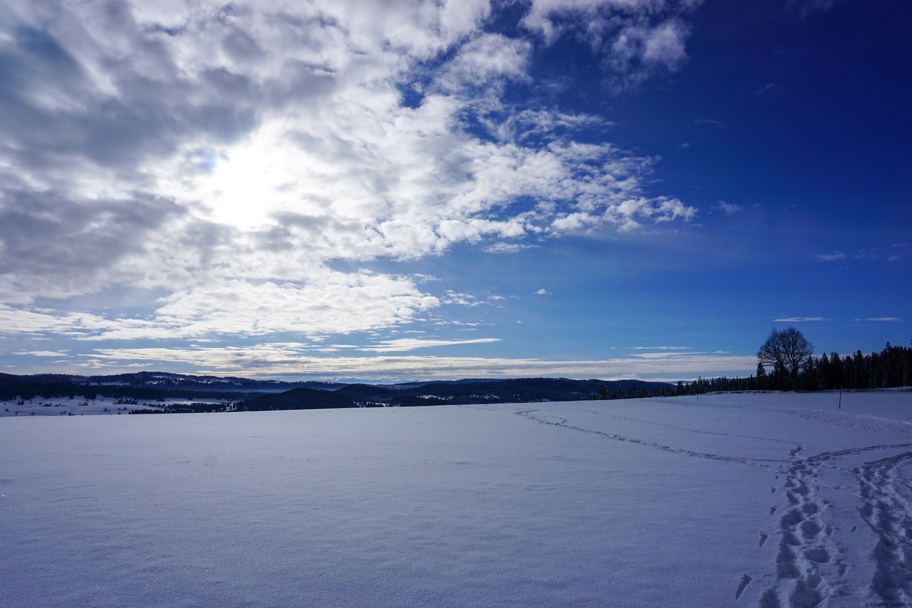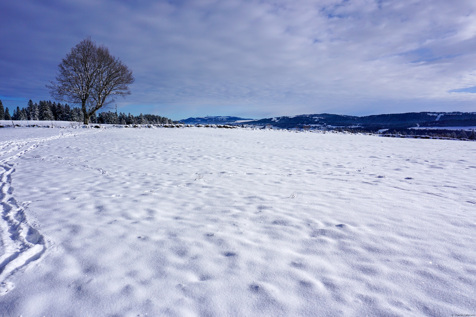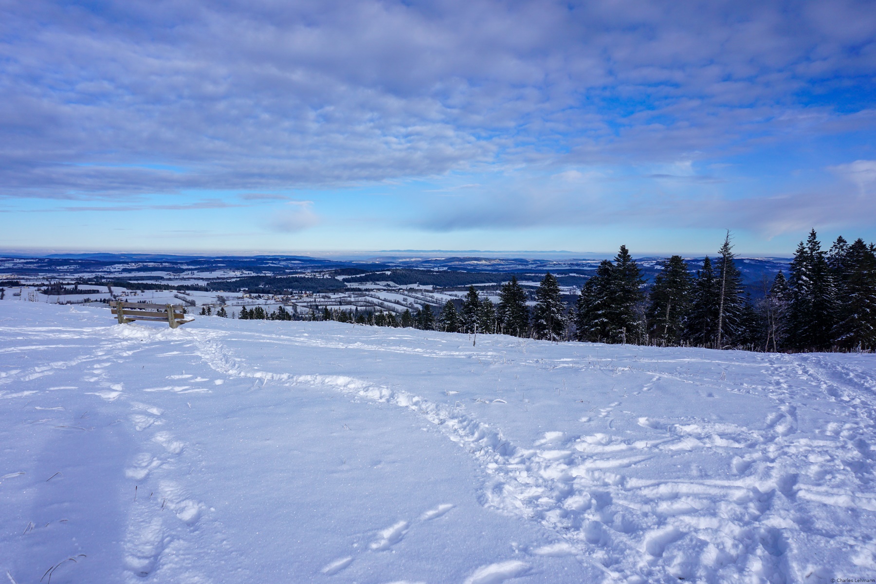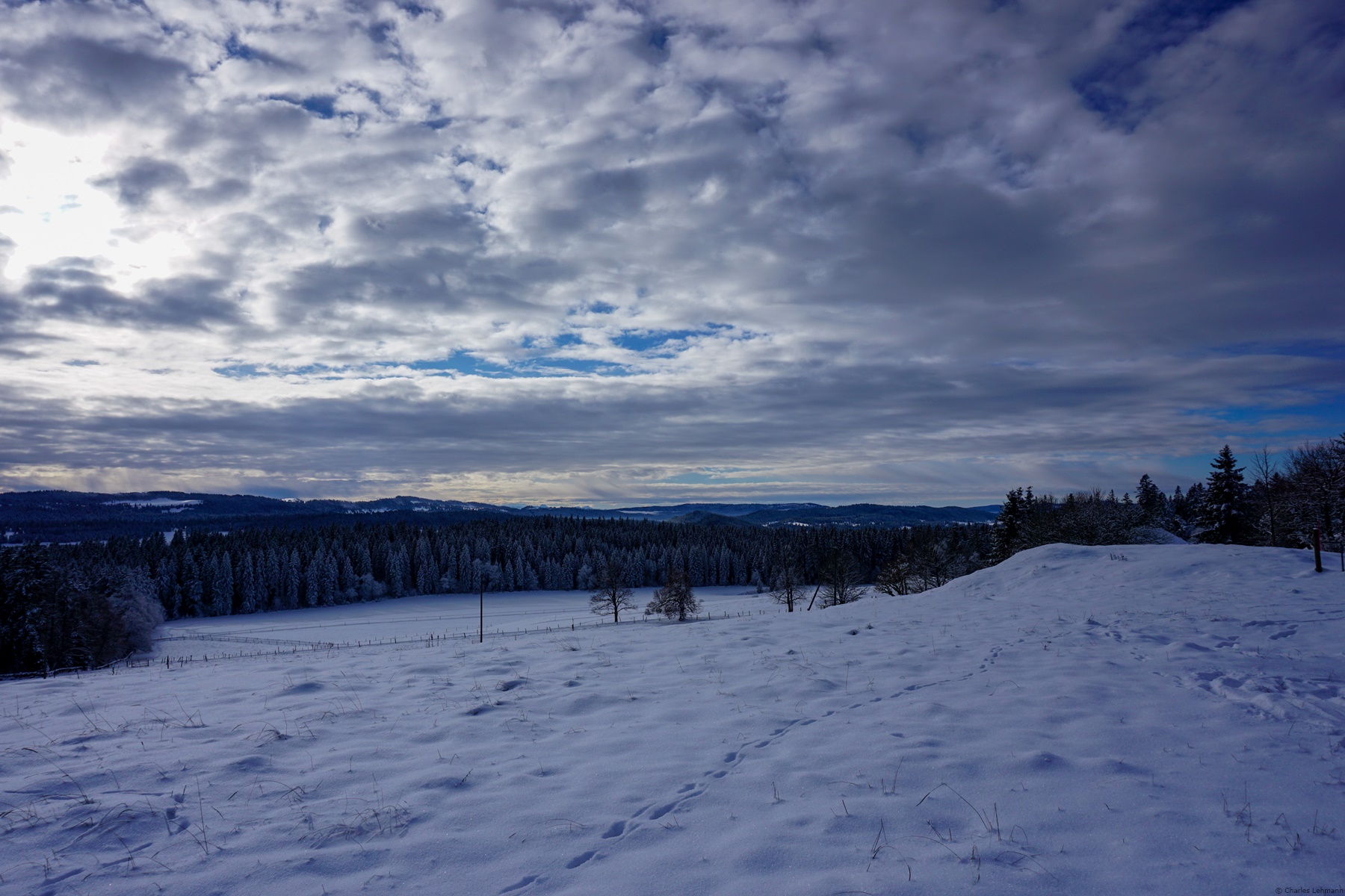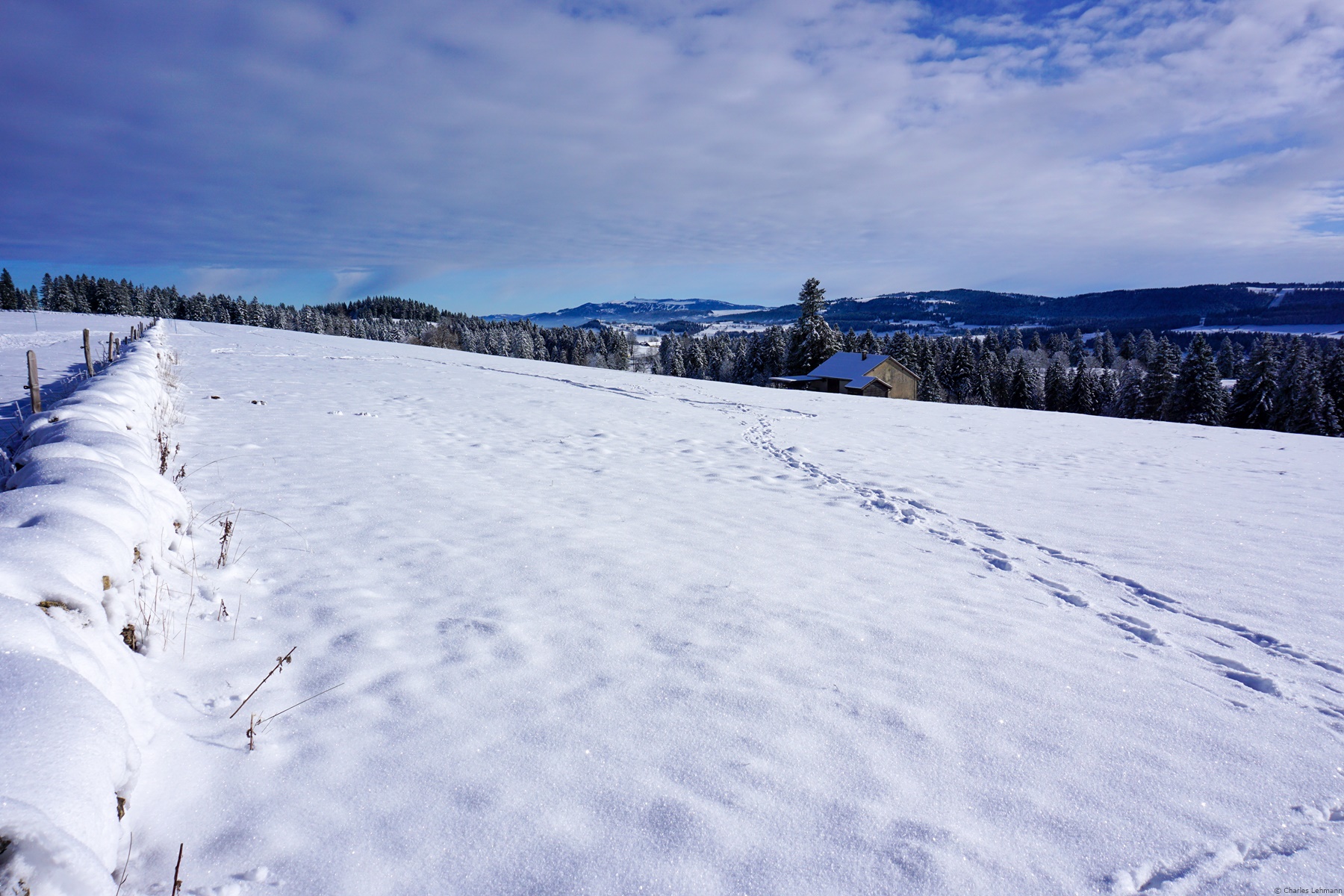 Beyond the Maillard, after leaving the forest and crossing a dry-stone wall, one enters a completely open pasture. The marked path runs a little below the mound and descends in the direction of Galandrue. This course is very regrettable, because one has no view, except beyond the Doubs in the direction of France. Therefore, it is advantageous to follow the top of the large bump and pass above the Saignolet. One can then enjoy a view looking beyond the ridge line of Mont Racine towards the Alps.
