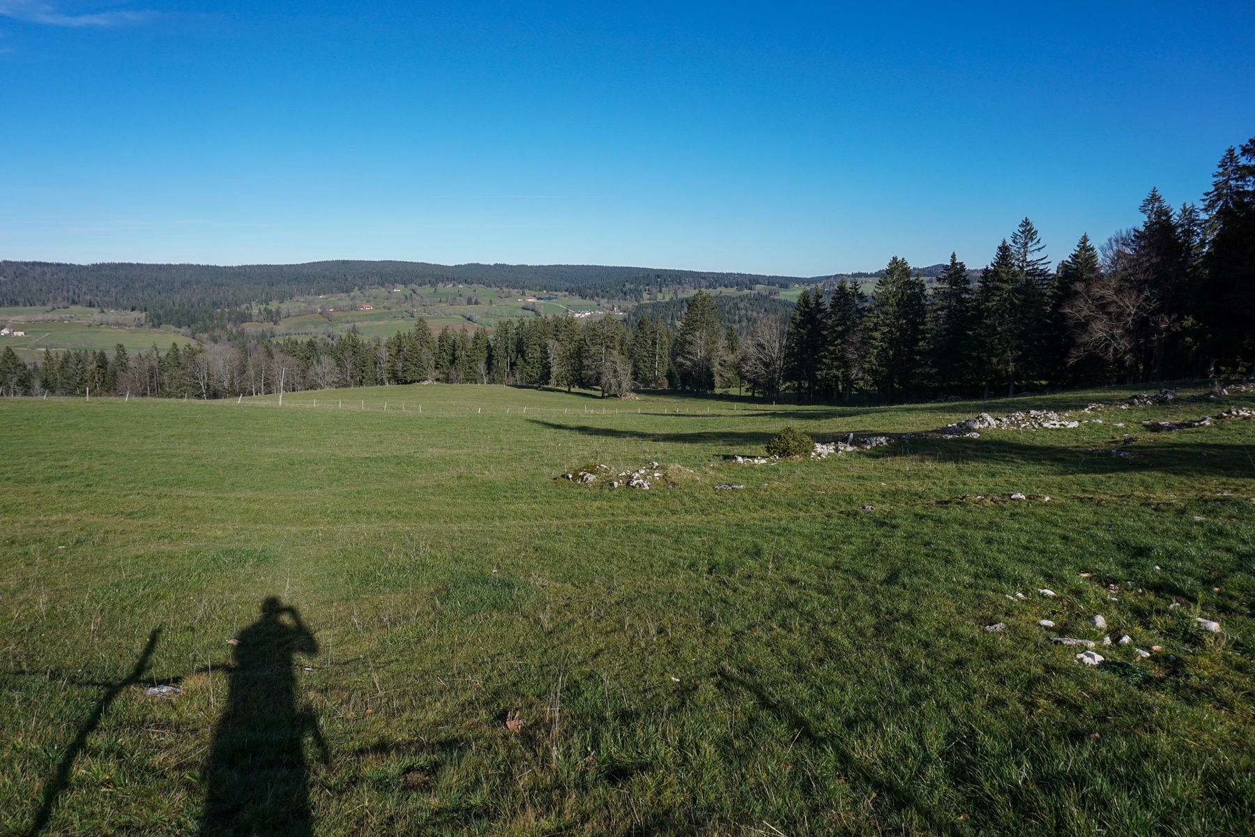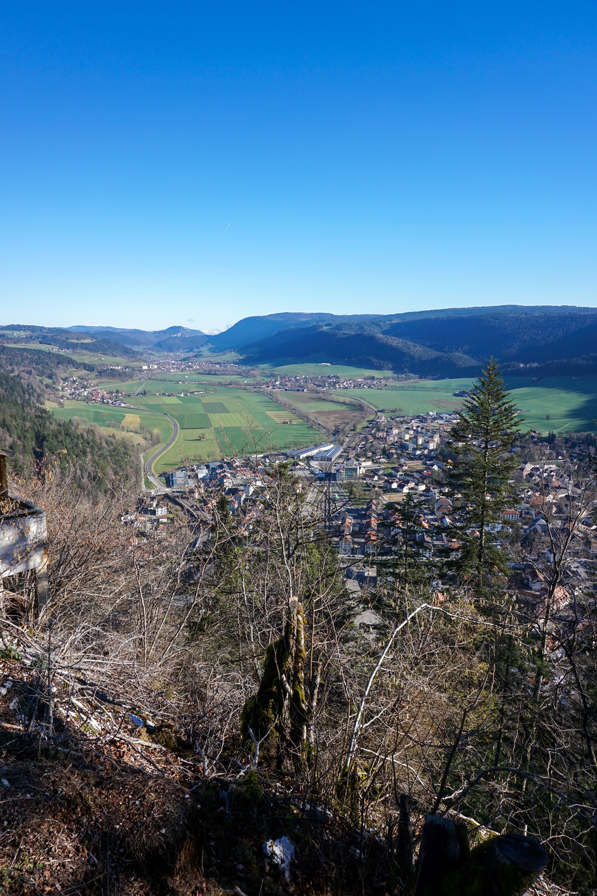 Après la montée, on débouche au-dessus de l’esplanade où se trouve le bâtiment du Chapeau de Napoléon. Il s’agit d’un ancien restaurant qui a entretemps et récemment été transformé en atelier d’horloger (il doit y avoir pire comme situation pour travailler). Quoi qu’il en soit, ni le parking, ni la terrasse ne sont accessibles pour profiter de la vue. Il faut, pour la vue, monter un tout petit peu pour rejoindre le Belvédère. On y trouve de la vue, mais qui ne doit pas être celle que l’on pourrait avoir depuis l’ancien restaurant.