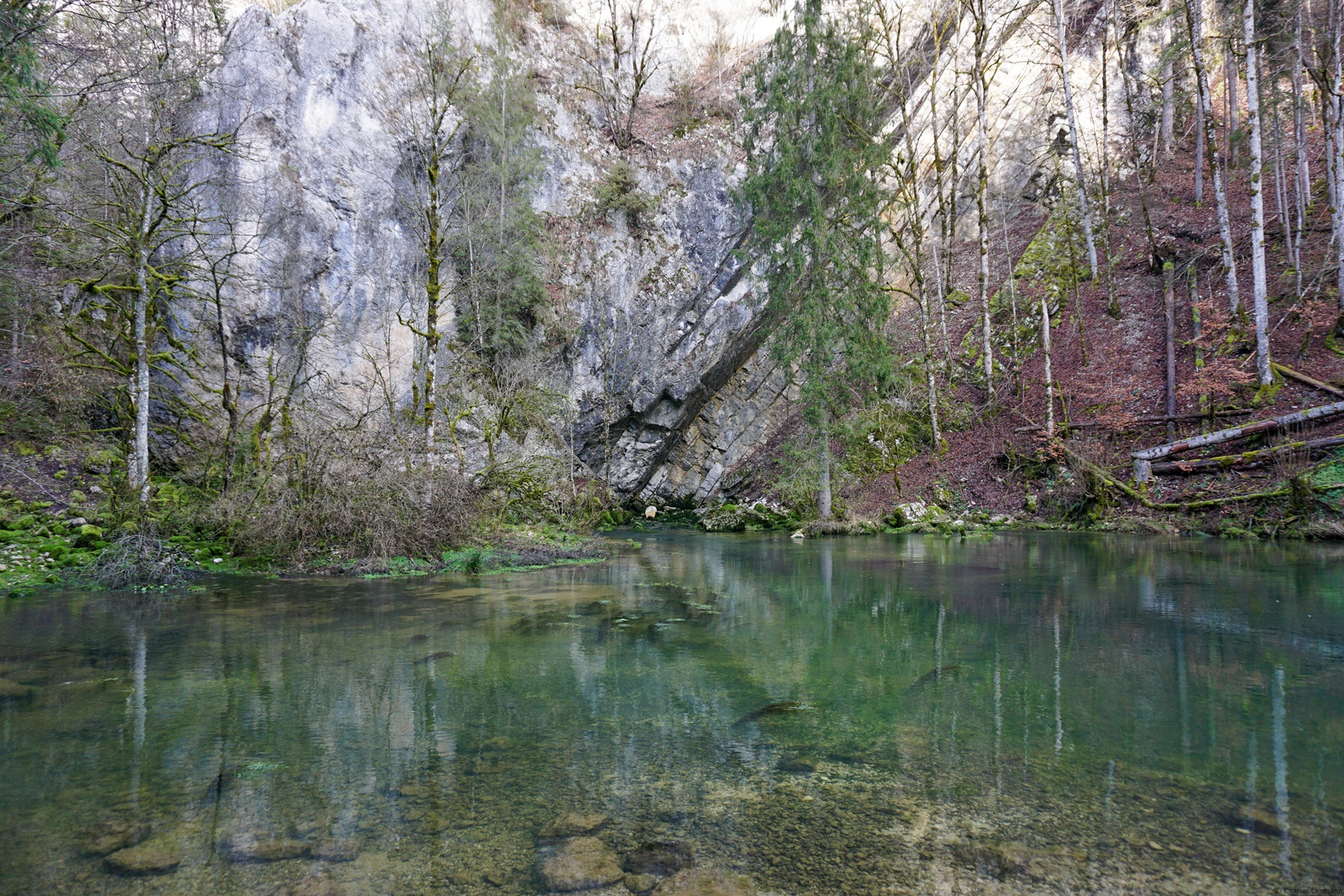 Plus bas, le sentier balisé quitte la route asphaltée pour descendre directement vers la Source de l’Areuse. L’endroit lui-même mérite qu’on s’y rende car, au pied d’une paroi imposante, on voit sortir l’eau qui a dû s’infiltrer à travers le calcaire un peu plus haut. Je peux imaginer qu’au plus chaud de l’été, les places doivent être chères au bord de ce plan d’eau. Même Jean-Jacques Rousseau y s’était rendu et avait décrit son aventure.