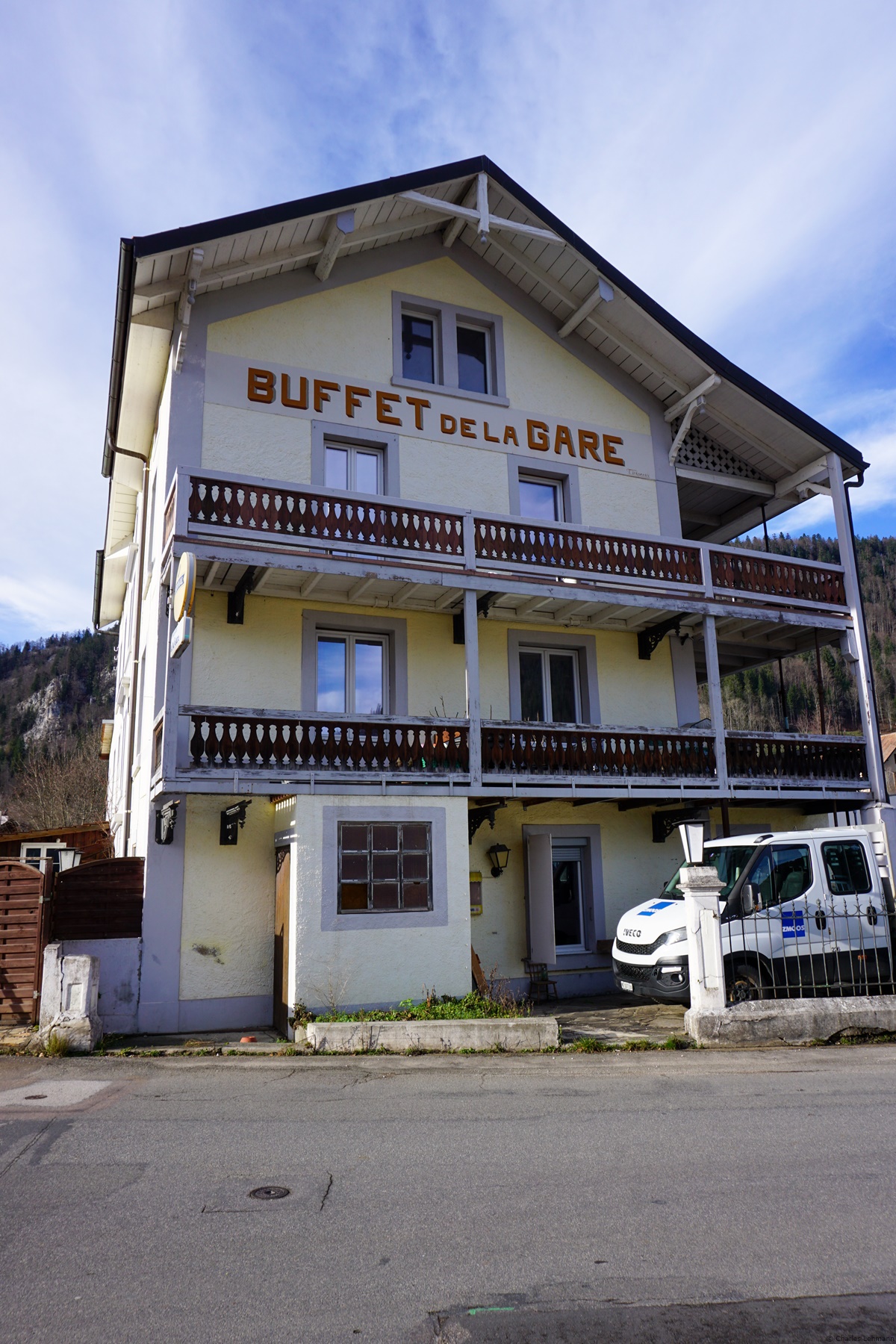 Plus bas, on ne tarde pas à entrer dans le village de Saint-Sulpice. On sera probablement surpris d’y voir un bâtiment avec une enseigne « Buffet de la Gare ». En y regardant de plus près, on constate qu’une voie de chemin de fer existent encore entre Fleurier et Saint-Sulpice. Quand on remarque que jusque dans les années 70 existait une cimenterie à Saint -Sulpice, on comprend mieux la présence des voies. Toutefois, le bâtiment du Buffet de la Gare semble bien plus ancien.