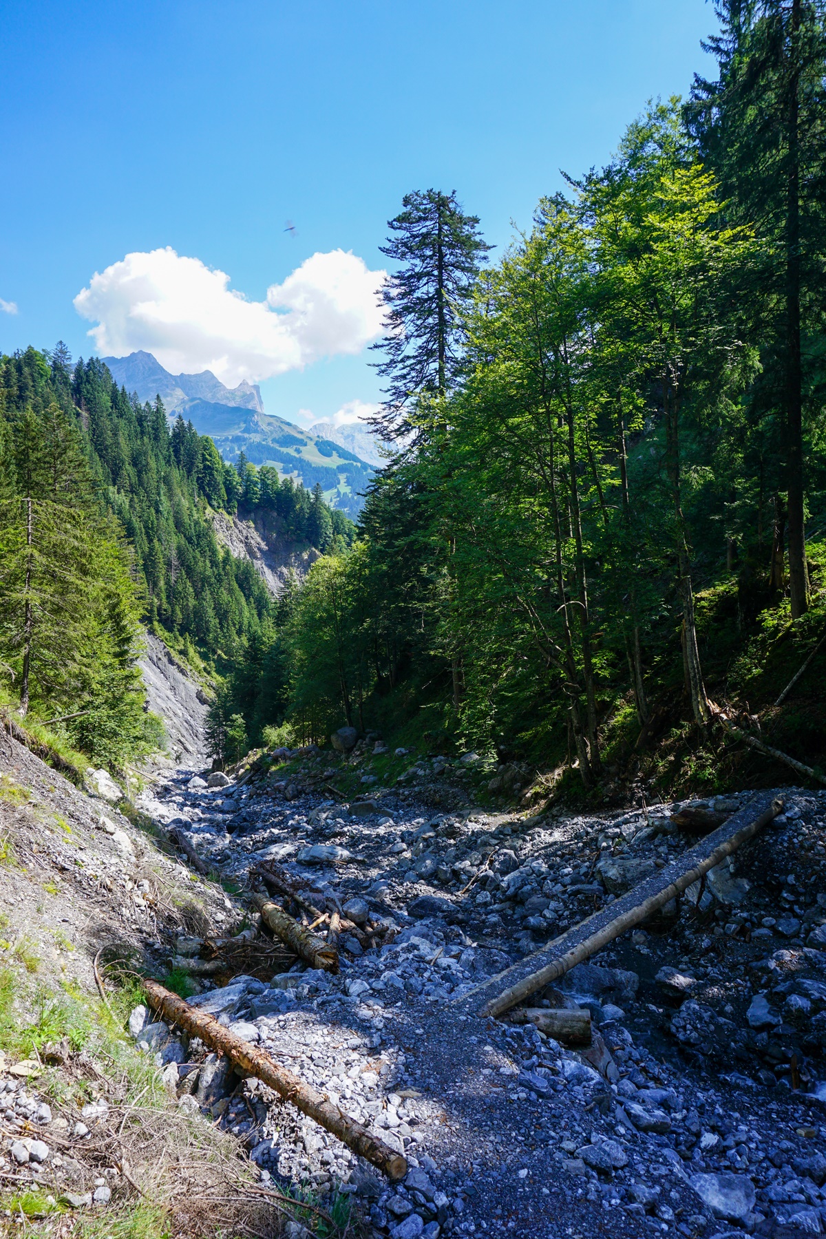 Le sentier de la gorge monte en rive droite de l’Arnibach toujours un peu plus haut que le torrent. A un moment, on se trouve en face d’une embouchure. C’est à ce moment que le sentier s’approche du torrent et traverse une zone encombrée de gros blocs entre lesquels il faut se frayer un chemin. Peu après, on traverse sur une passerelle le torrent descendant le Wangtobel. C’est cette passerelle qui est de temps en temps arrachée lors de fortes pluies. Sur l’autre rive, on monte légèrement à travers une zone souvent très humide avant d’entamer la dernière ascension assez raide jusqu’au pâturages.