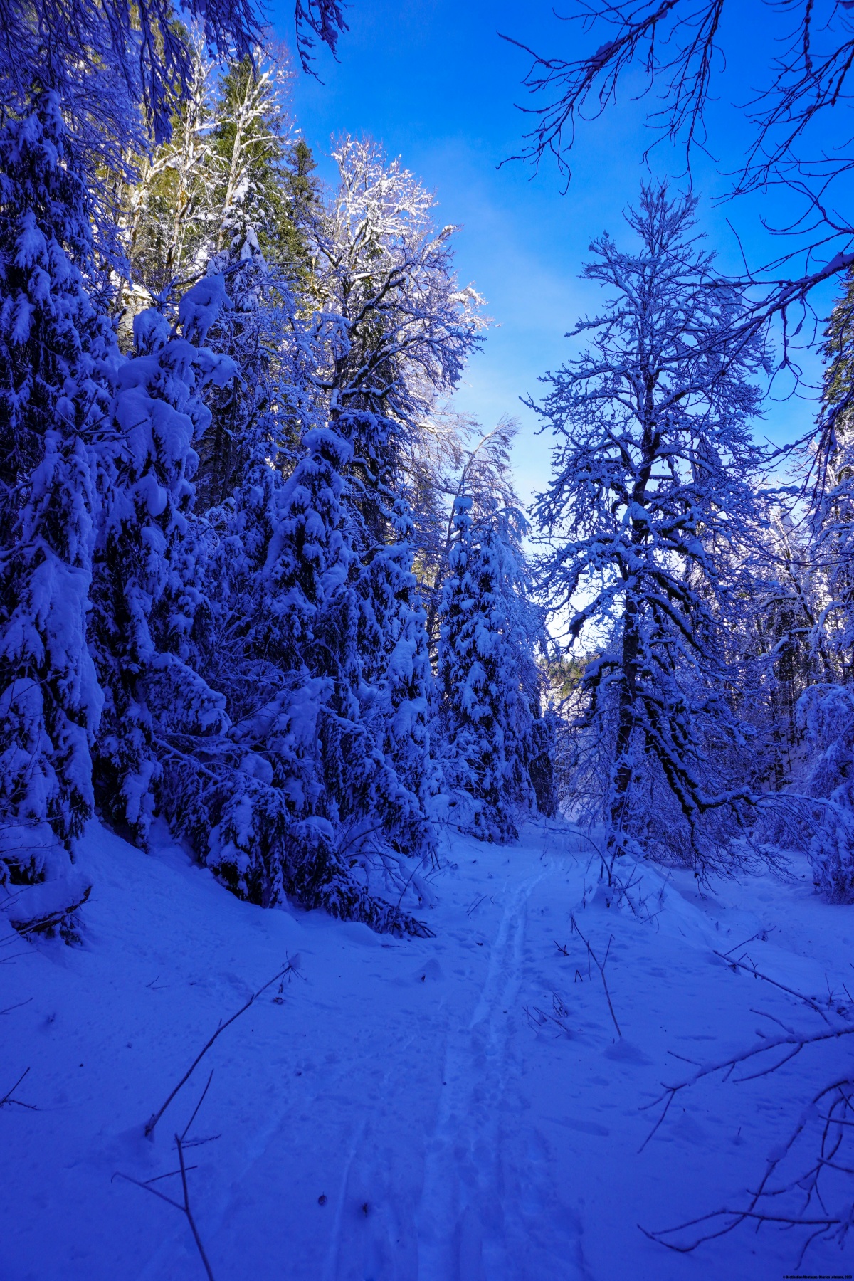 Als ich den engeren Teil der Combe du Valanvron hinter mir hatte, bin ich nicht an der Abzweigung des markierten Weges angehalten, sondern bin direkt über die Ronde gewandert, um einen Waldweg zu folgen. Dieser zwang mich zwar dazu, ein Stück bergauf zu gehen, um später wieder bergab zu laufen, aber er bot den Vorteil, dass ich mich im Unterholz bewegen konnte, wo die Schneedecke nicht so dick war.