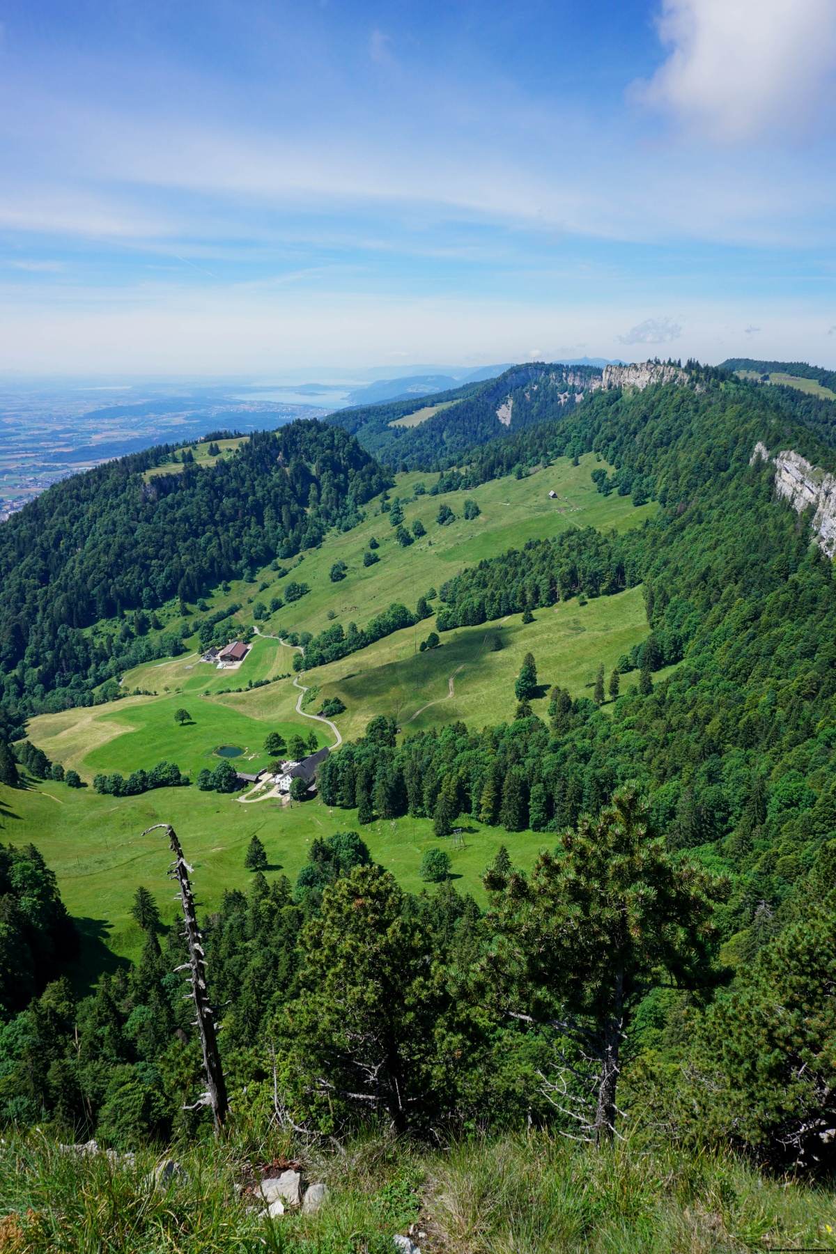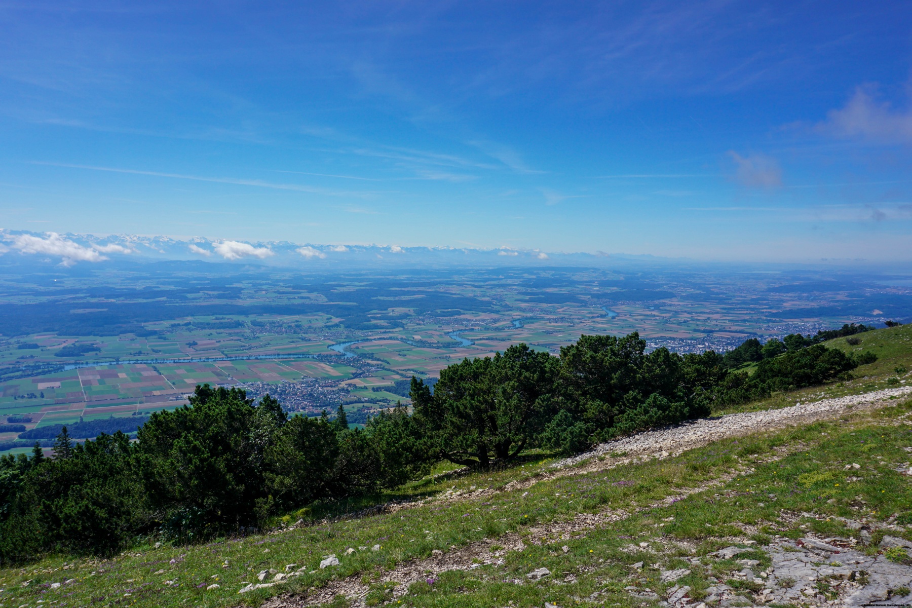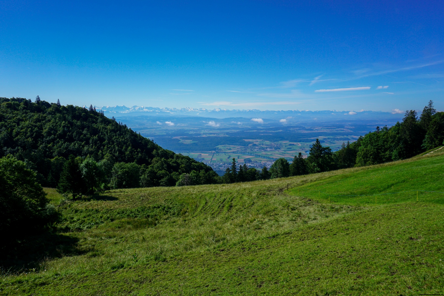 We took the cable car from Oberdorf to the Weissenstein Hotel, which is a white building that can be seen from a far distance. We then followed the Jura crest path past Hinterweissenstein and under the Gitziflue. We walked through the forest for a while before reaching the Hasenmatt. There, we entered the pasture, which provides an unobstructed view of the Alps and the Swiss Plateau. On the other side of the top, you can even see the tall towers of Basel.
