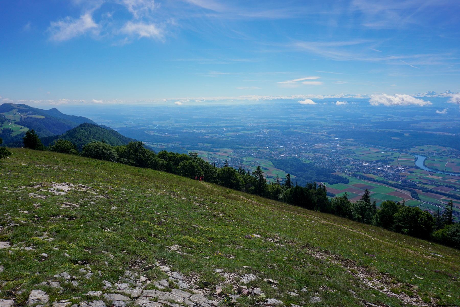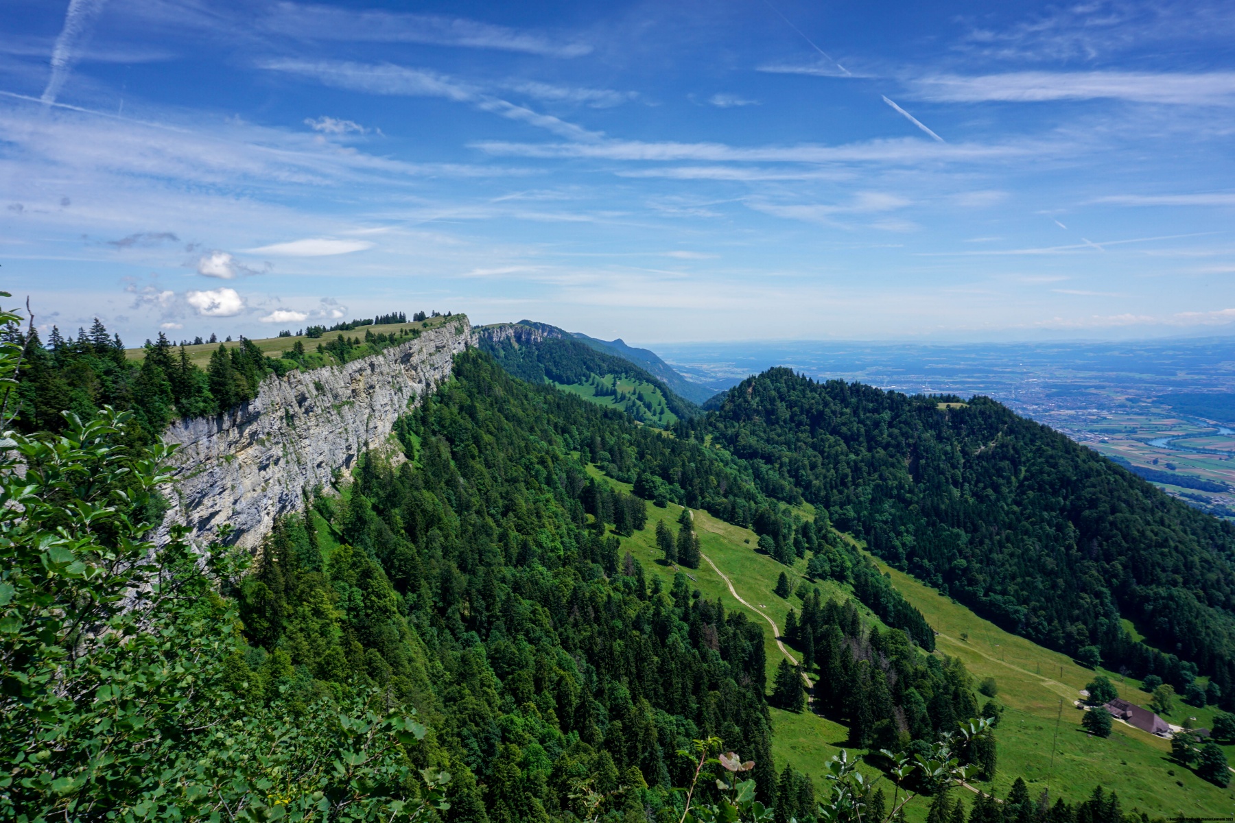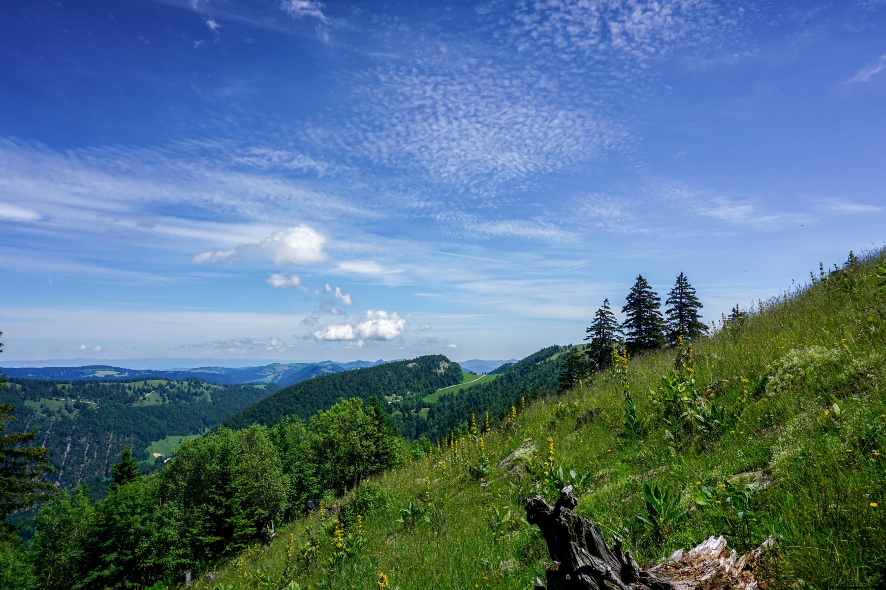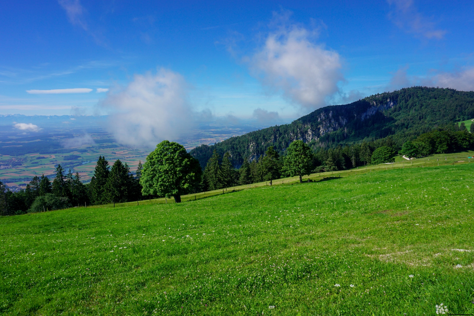 We took the cable car from Oberdorf to the Weissenstein Hotel, which is a white building that can be seen from a far distance. We then followed the Jura crest path past Hinterweissenstein and under the Gitziflue. We walked through the forest for a while before reaching the Hasenmatt. There, we entered the pasture, which provides an unobstructed view of the Alps and the Swiss Plateau. On the other side of the top, you can even see the tall towers of Basel.