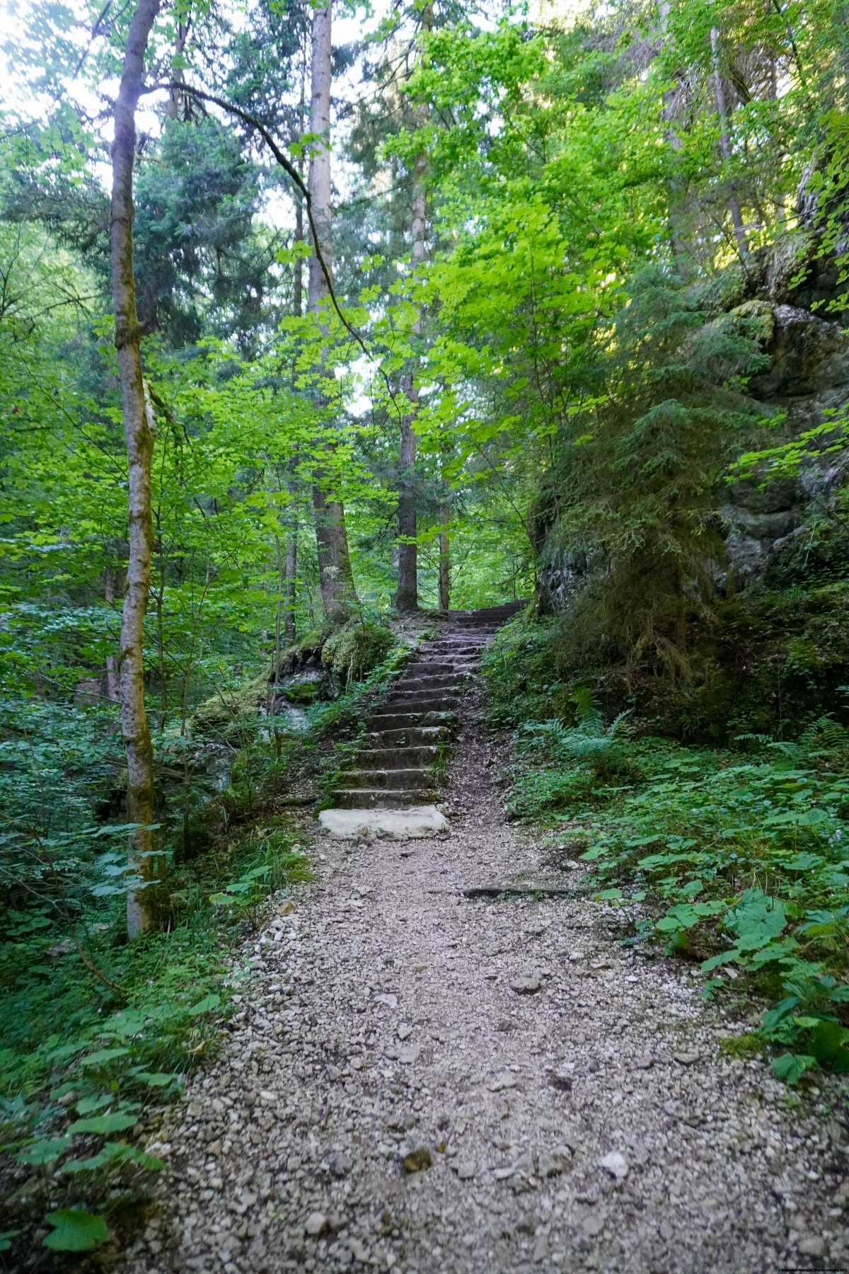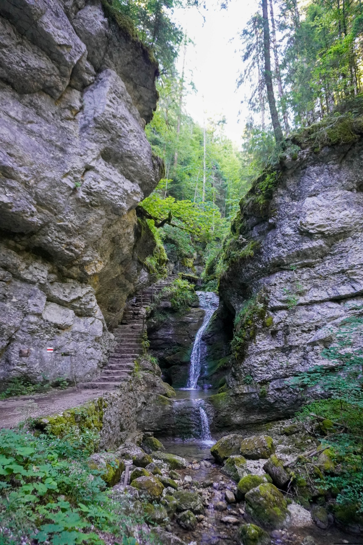 Ce jour-là, nous étions partis tôt, craignant la chaleur. Cela nous a également permis de pouvoir parcourir la Pouëtta Raisse sans rencontrer personne. En temps normal, et à d’autres heures, on a parfois de la peine de pouvoir croiser sur les tronçons très étroits du sentier. En quittant les gorges, nous avons été, comme à chaque fois, surpris par le contraste. On passe en effet en quelques mètres d’un environnement très vertical et humide à des sous-bois plus chauds. S’ensuit alors une montée assez monotone qui permet de rejoindre les prés de La Vaux.