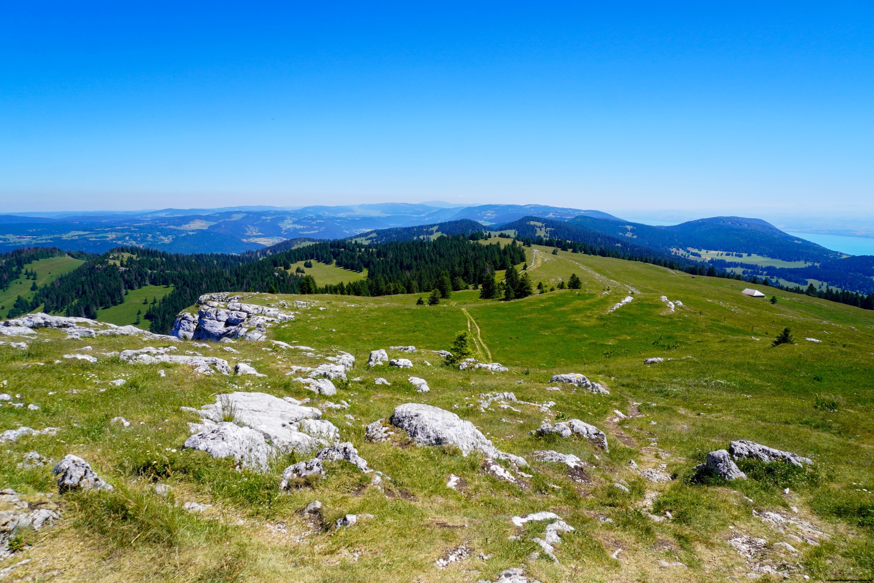 Après avoir traversés les prés, nous avons rejoint la route forestière, assez monotone également, qui permet de rejoindre les chalets des Cernets. Malgré la monotonie de ce chemin forestier, son tracé est plus agréable qu’à l’époque, où on suivait le fond de la combe. On se trouvait alors dans une zone très boueuse et humide. Après les Cernets, nous avons suivi le sentier balisé passant près du chalet de la Grandsonne et gagnant le sommet du Chasseron. Là encore, nous avions ressenti un fort contraste lié au nombre de personnes se trouvant au sommet.
