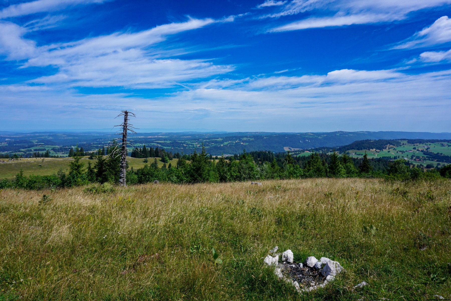 The Col de la Vue des Alpes is aptly named. Indeed, from the large car park of the pass, you can enjoy an unobstructed view of much of the Alps. If you follow the ridge starting from the pass, you can also find beautiful views, either going to the Tête de Ran or going the other way, towards Mont d’Amin. This top is also a nice destination for a hike, because you can make a loop through the Pertuis, especially since the route is obvious: you follow the crest to descend on the Pertuis and return by a vale.