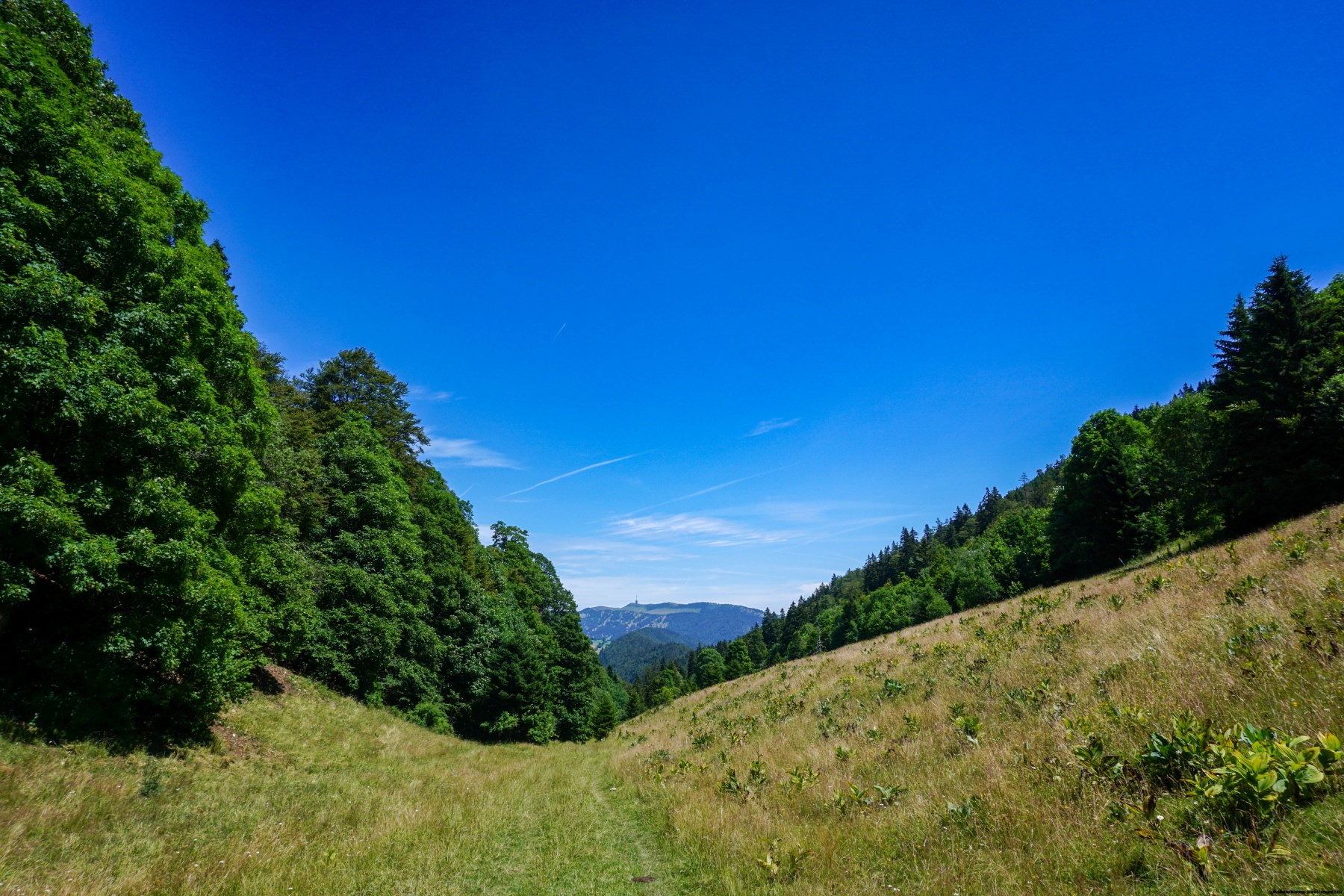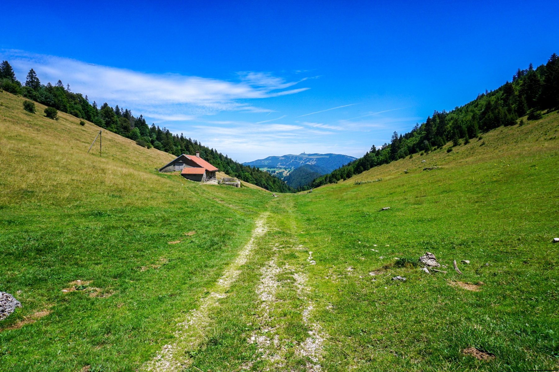 From the top, follow the strip of meadow running along the crest. From these pastures, you can directly see the top of the Chasseral. Before reaching the end of the meadows, follow the marked trail down to the Cernil-Chollet. There is certainly a small trail (the Sentier des Chamois, not indicated on the map) that leads directly to the Pertuis, but on the descent it is not recommended.