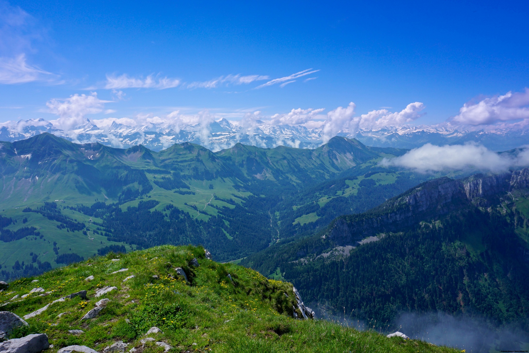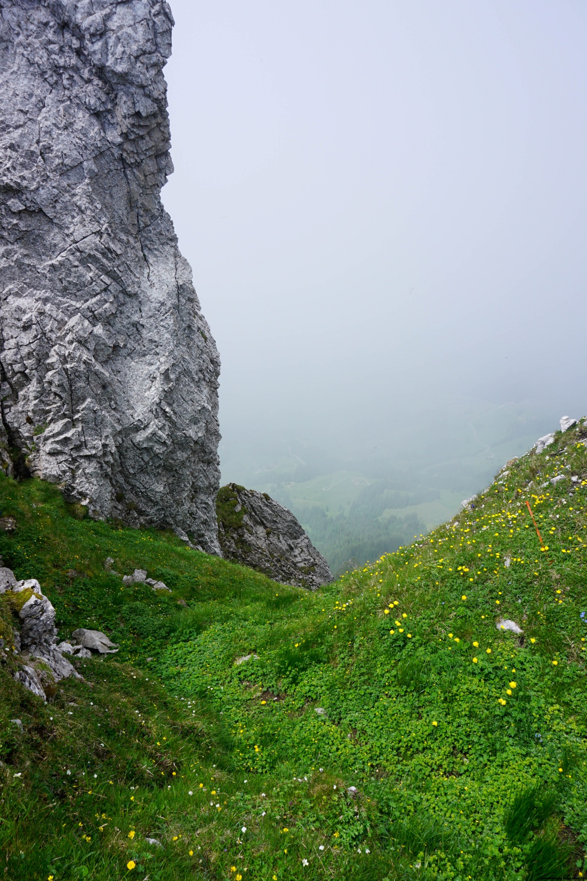 The Schrattenfluh is a small mountain range that is quite surprising. Its north-western side is a steep cliff that drops down into the Emme valley, while its south-eastern side is a huge, slightly sloping plateau with a well-known karrenfeld. So, if you climb the side facing Sörenberg, you can easily reach the crest. The only difficulties are the detours you must make to avoid crevasses and chasms. The crest is relatively flat, and the only thing that really stands out is the Schibegütsch. This peak, with its distinctive cliff, is the first elevation of the Schrattenfluh, directly opposite the Hohgant.