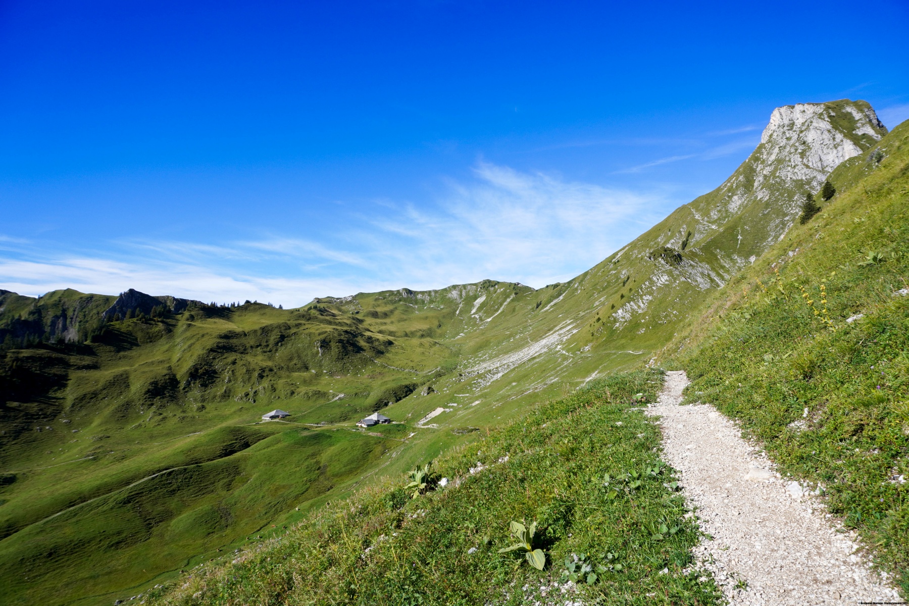 Auf der anderen Seite des Passes folgt man dem Weg, der sich den ganzen Berg hinunter bis zur Oberi Walalp schlängelt. Die Distanz zwischen Leiterepass und Walalp kann ein wenig abschreckend wirken, aber wenn man sich ruhig vorwärtsbewegt, ist es gar kein Problem. Zudem wechselt die Aussicht, je weiter man vorwärtskommt. So wandert man unter den Gipfeln der Grossi Nüneneflue und des Homad hindurch, nicht zu vergessen die beiden kleinen Gipfel Chatz u Mus (Katz und Maus).