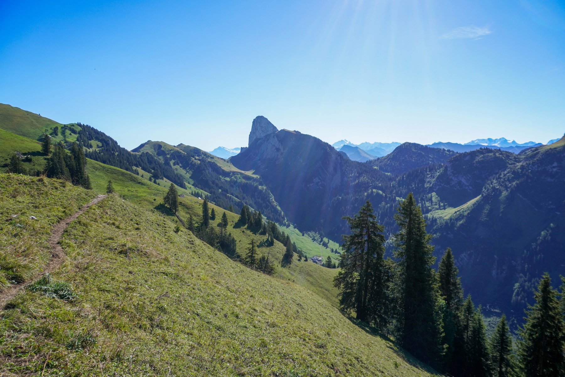Von Gurnigel aus geht es zunächst auf den Leiterepass. Dafür nimmt man den Alpweg, der nach Obernünene führt. In dieser Steigung muss man ein wenig aufpassen, da man noch ein wenig kalt ist, da es ziemlich steil bergauf geht. Bis zum Leiterepass trifft man noch ziemlich viele Leute an, da die Via Ferrata im Gantrisch nicht weit weg ist und auch ziemlich viele Leute auf den Gantrisch-Gipfel unterwegs sind.