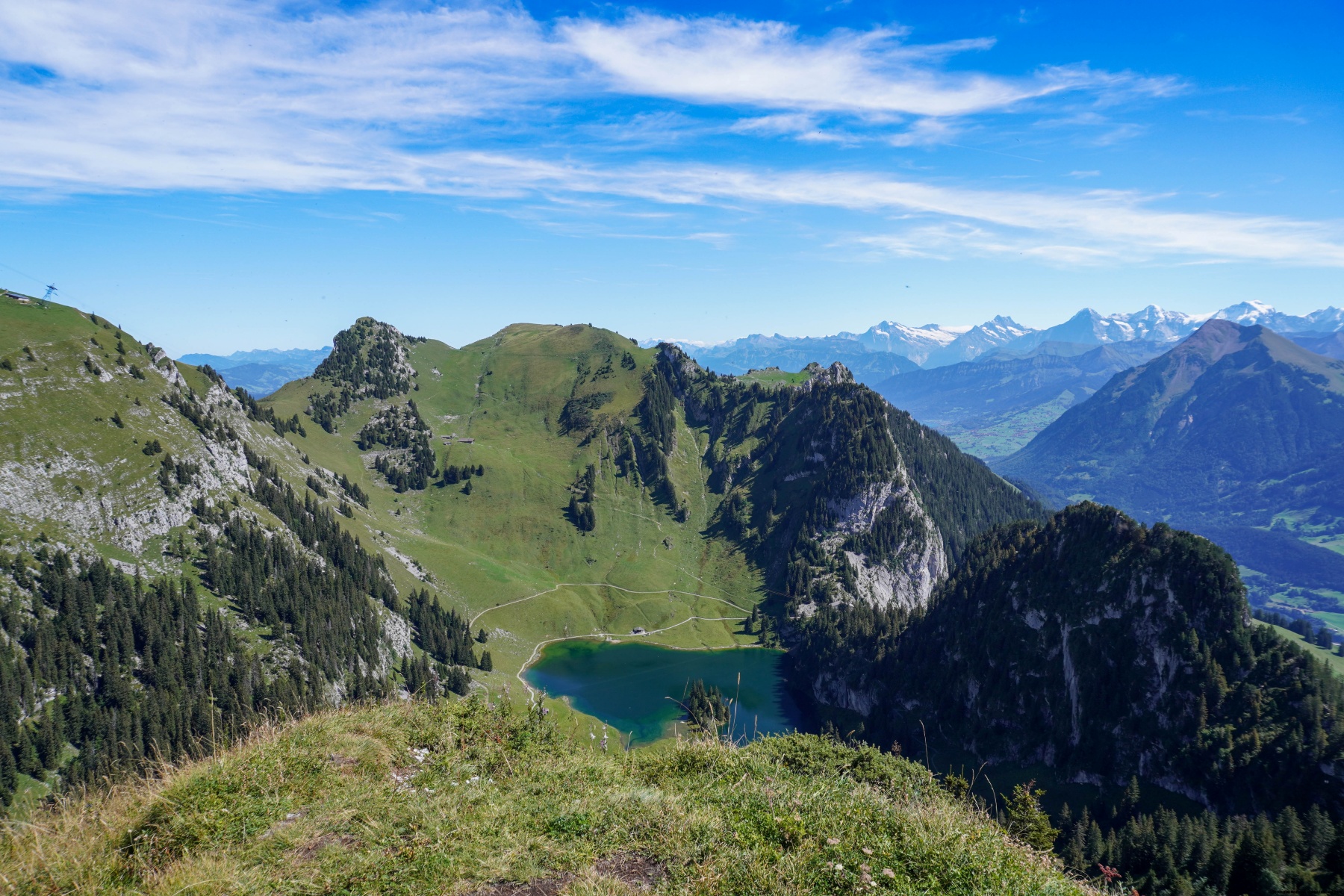 Von Oberstockesee aus waren wir noch auf den Cheibehore, einen Gipfel, der über den Hinterstockesee ragt, hinaufgestiegen. Von dort aus hat man eine wunderbare Aussicht auf die Berner Alpen und den Stockhorn, ohne von den vielen Leuten gestört zu werden. Der Aufstieg ist teilweise etwas unangenehm, da man teilweise durch die Tannen hindurchmuss. Der Abstieg erfolgt entlang einer steilen Spur durch ein steiniges Gelände. Interessant ist, dass der Abstieg vom Cheibehore nach Chrindi auf der Karte erst seit Kurzem als markierter Weg eingezeichnet ist. 2023 war er noch nicht eingezeichnet.