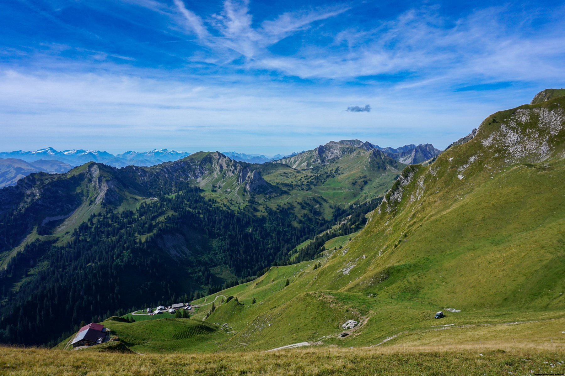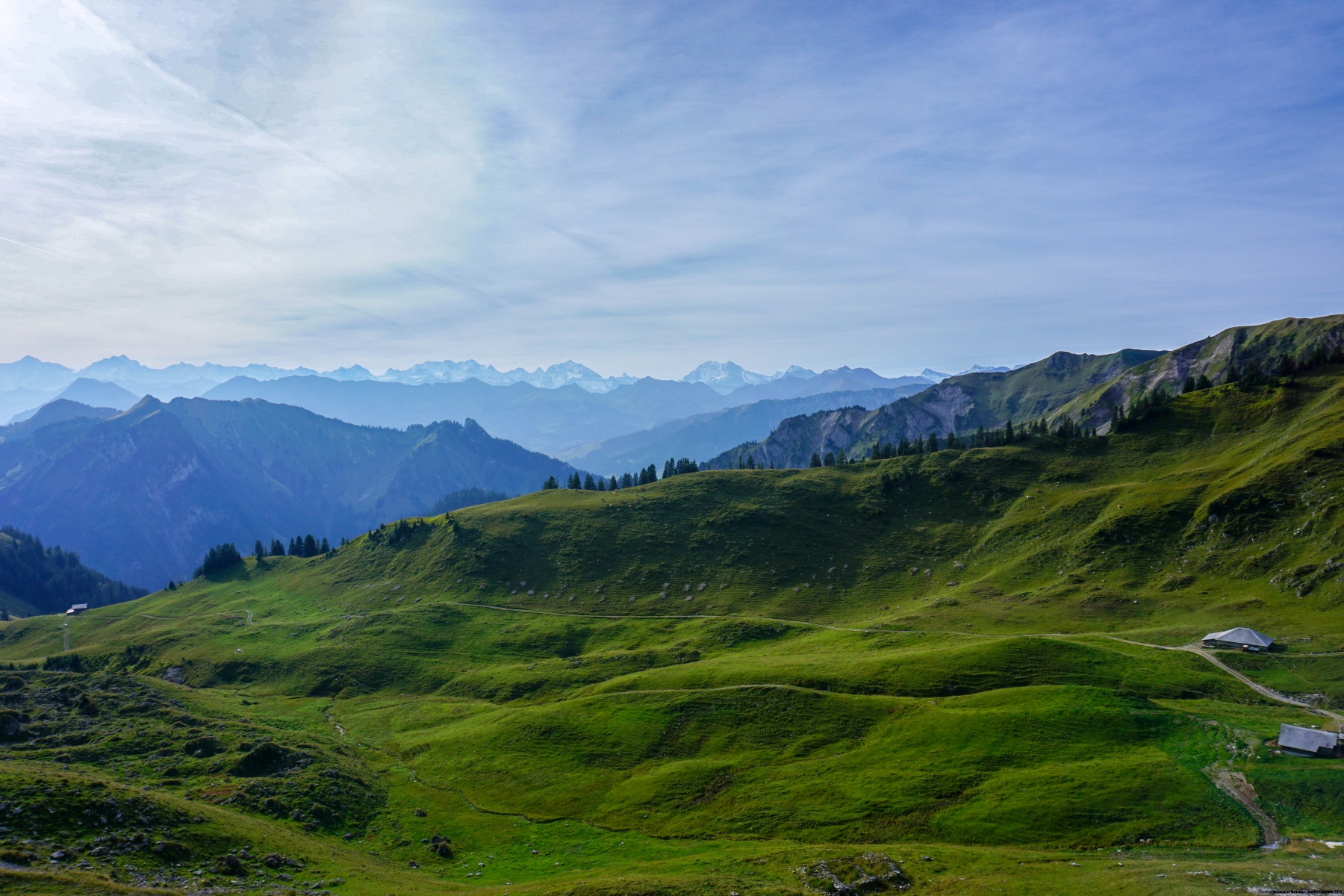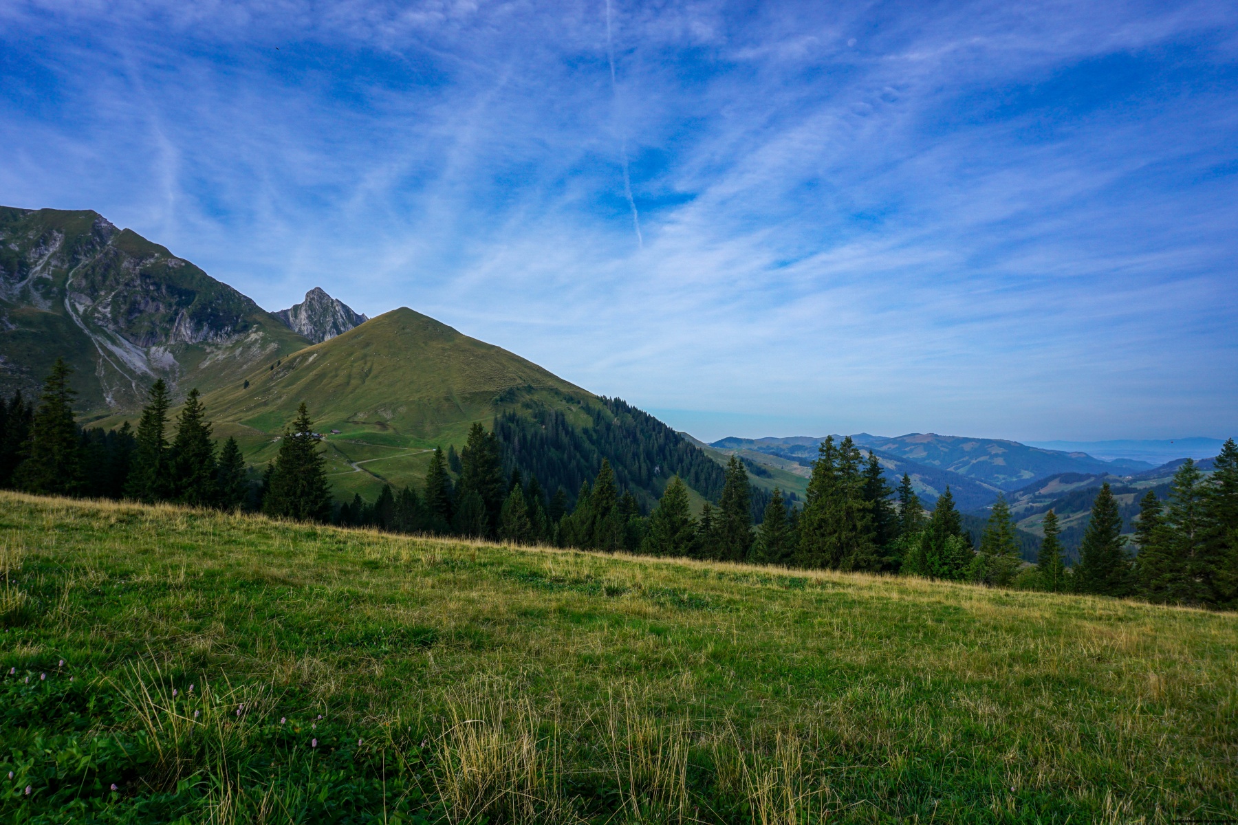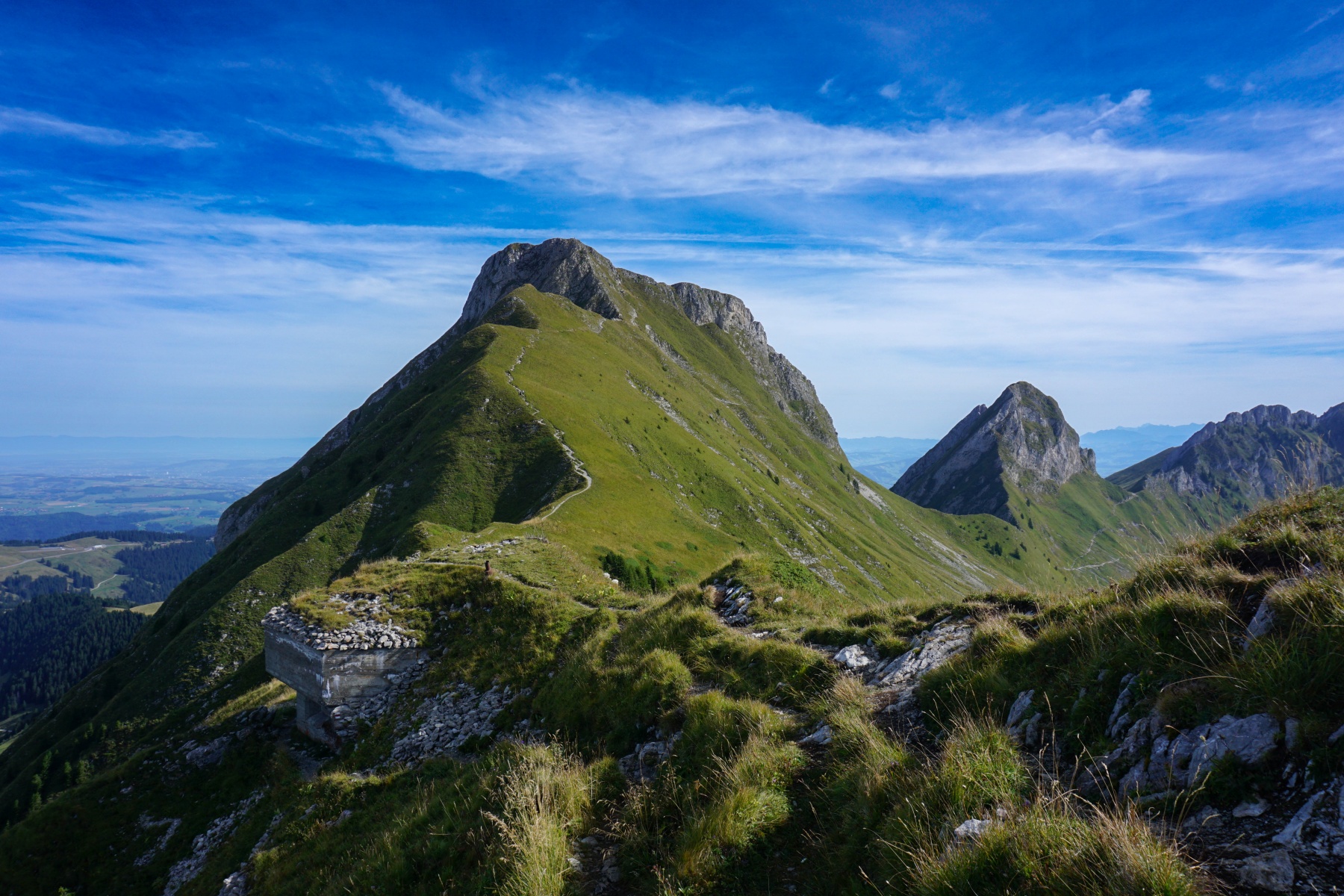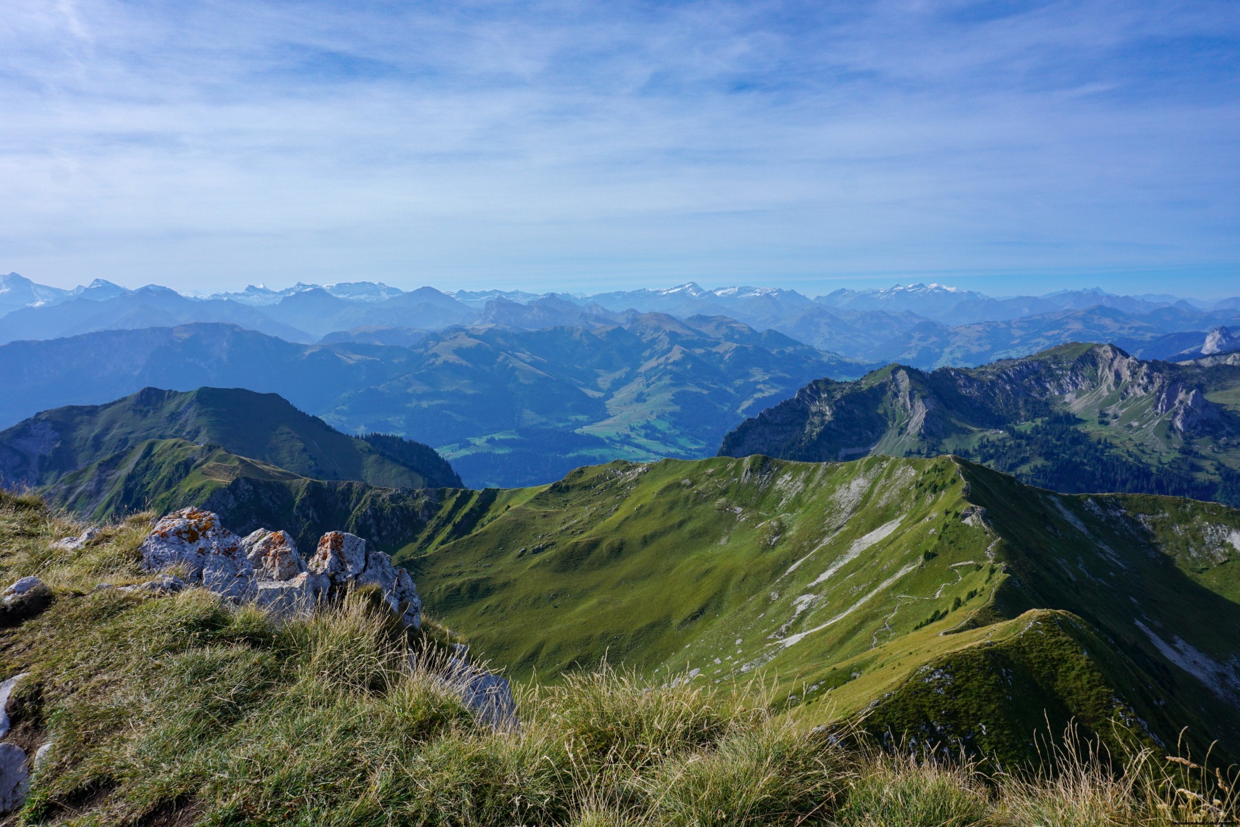 Der Gantrisch ist ein herrlicher Aussichtspunkt, dessen Lage dem Stockhorn ähnelt. Tatsächlich verbirgt im Norden kein Gipfel die Aussicht. Wir haben auch einen sehr schönen Blick auf die Alpen, von denen wir im Hintergrund den Mont Blanc sehen können.
