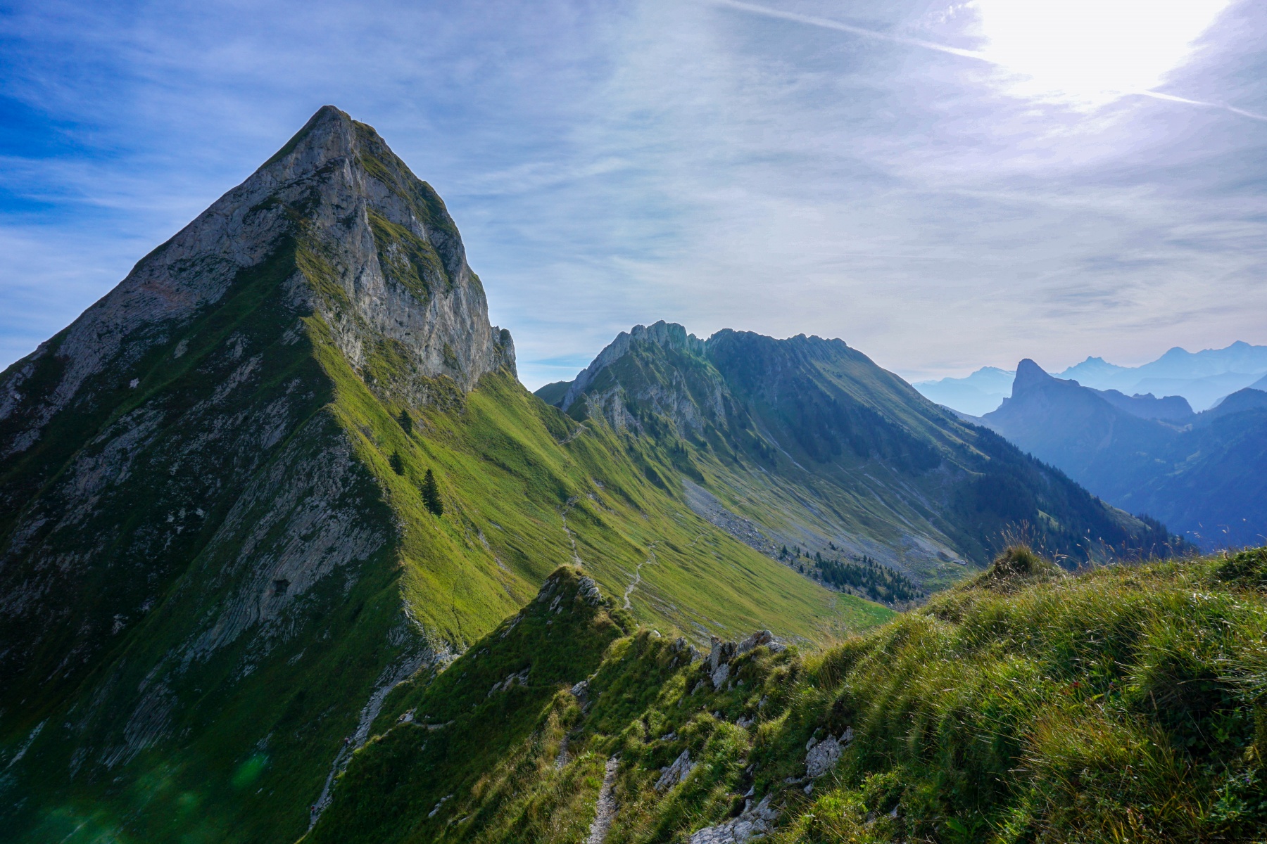 Der Gipfel des Gantrisch erfordert, auch wenn die auf der Karte eingezeichneten Routen als Bergwege gekennzeichnet sind, für die Besteigung einer gute Trittsicherheit. Von der Wasserscheide aus folgen wir zunächst einem guten Weg zur Obernünene-Hütte. Ab hier wird der Weg schmaler und immer steiler. Am Ende geht er ostwärts in Richtung Leiterepass.