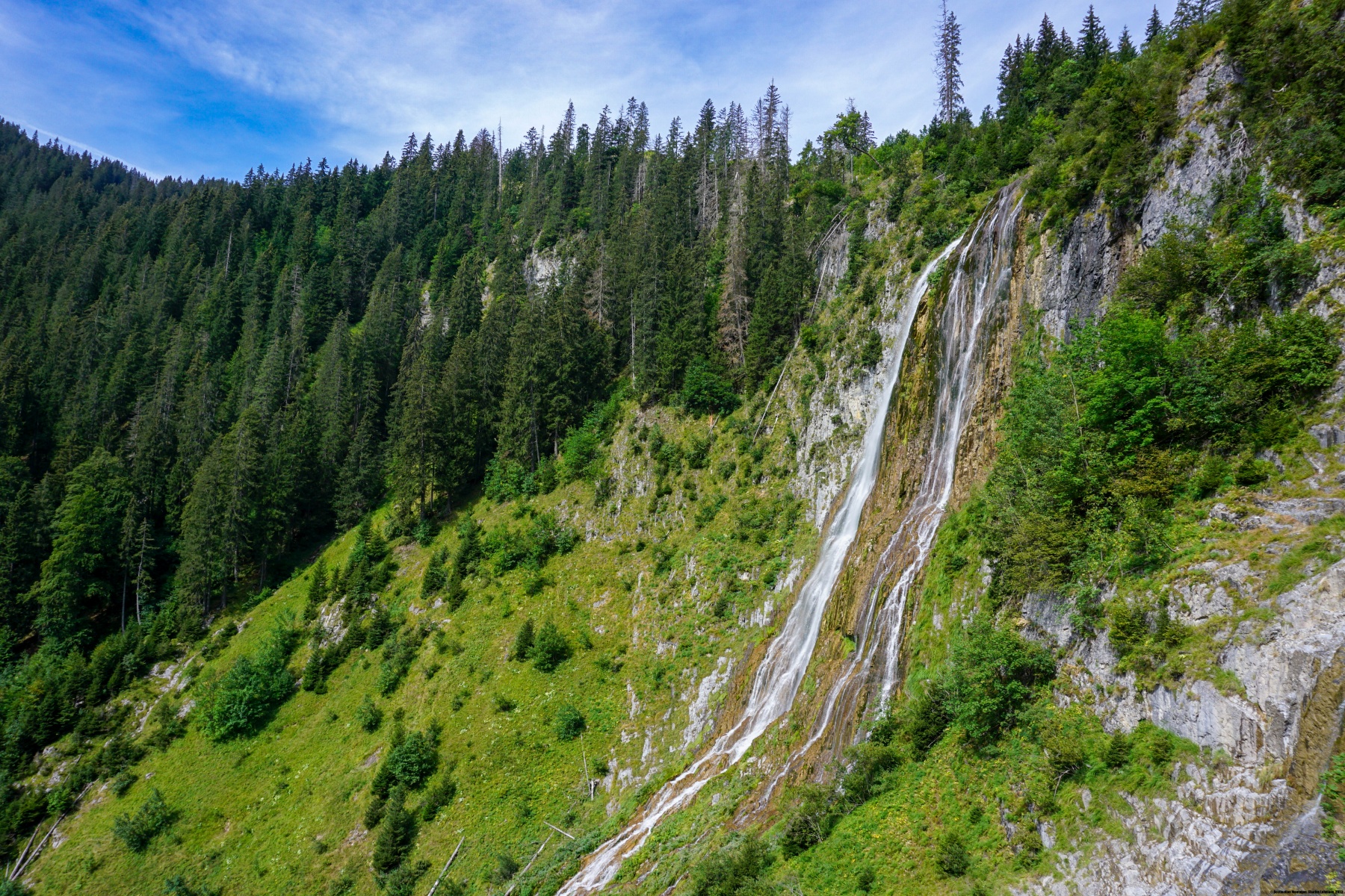 Für den Rückweg entschied ich mich für den Abstieg Richtung Weissenburg. Dazu überquerte ich den Grat, um den Morgetepass zu erreichen und stieg entlang des Morgetebachs ab. Dabei passieren wir die spektakulären Faal-Wasserfälle. Der einzige Nachteil ist, dass man lange Zeit der staubigen Strasse von Morgete entlang wandern muss. Wenn ein Auto von Zeit zu Zeit vorbeifährt, atmen wir eine Menge Staub ein.