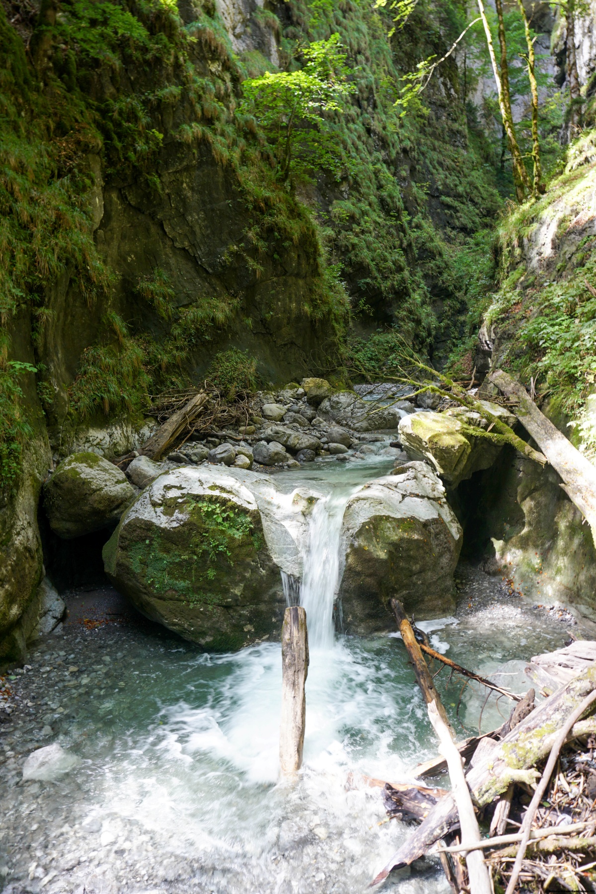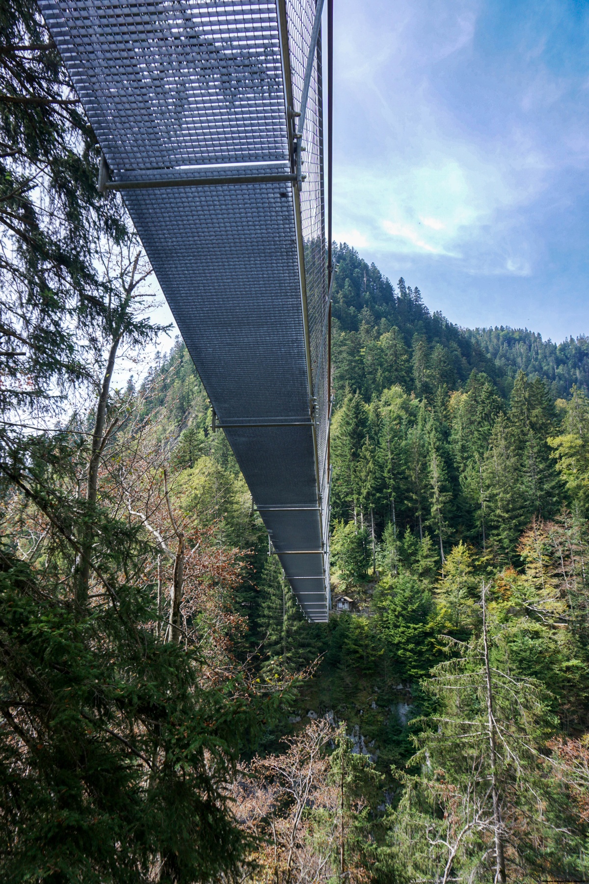 Weiter unten, nach einer Strassenecke, überqueren wir eine spektakuläre Hängebrücke, um das andere Ufer des Morgetebachs zu erreichen. Vom anderen Ufer aus ermöglicht ein mit Leitern ausgestatteter Weg den Abstieg ins Buuschetal unweit der Mündung des Morgetebachs. Nachdem wir diesen Wildbach erneut überquert haben, folgen wir einem deutlich flacheren Weg, um zur Ruine des ersten Weissenburger Bads zu gelangen. Weiter geht es vorbei an der Ruine des zweiten Weissenburgbades und entlang der Talseite zum Bahnhof.