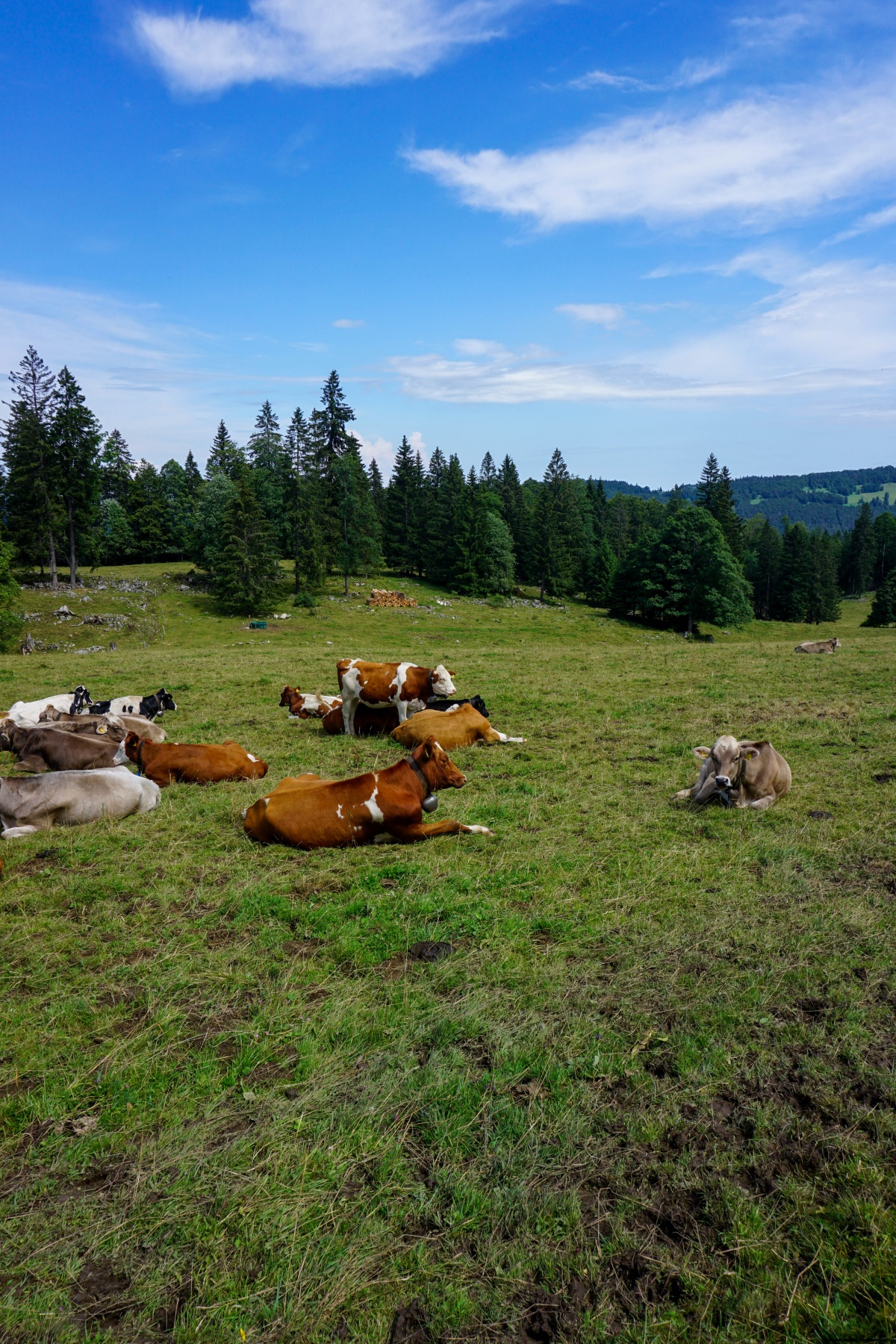 Depuis Court, nous n’avions pas trop envie de passer par le Pré Richard, car lors d’un dernier passage, le pâturage de Sous Pré Richard était occupé par un troupeau de vaches-mères accompagnés des taureaux. C’est pourquoi, à la bifurcation cotée 1083m, nous avons suivi le sentier de gauche qui longe un bout de route et traverse un petit pâturage. Depuis là, nous avons suivi le sentier balisé pour nous rendre à la Bluée.