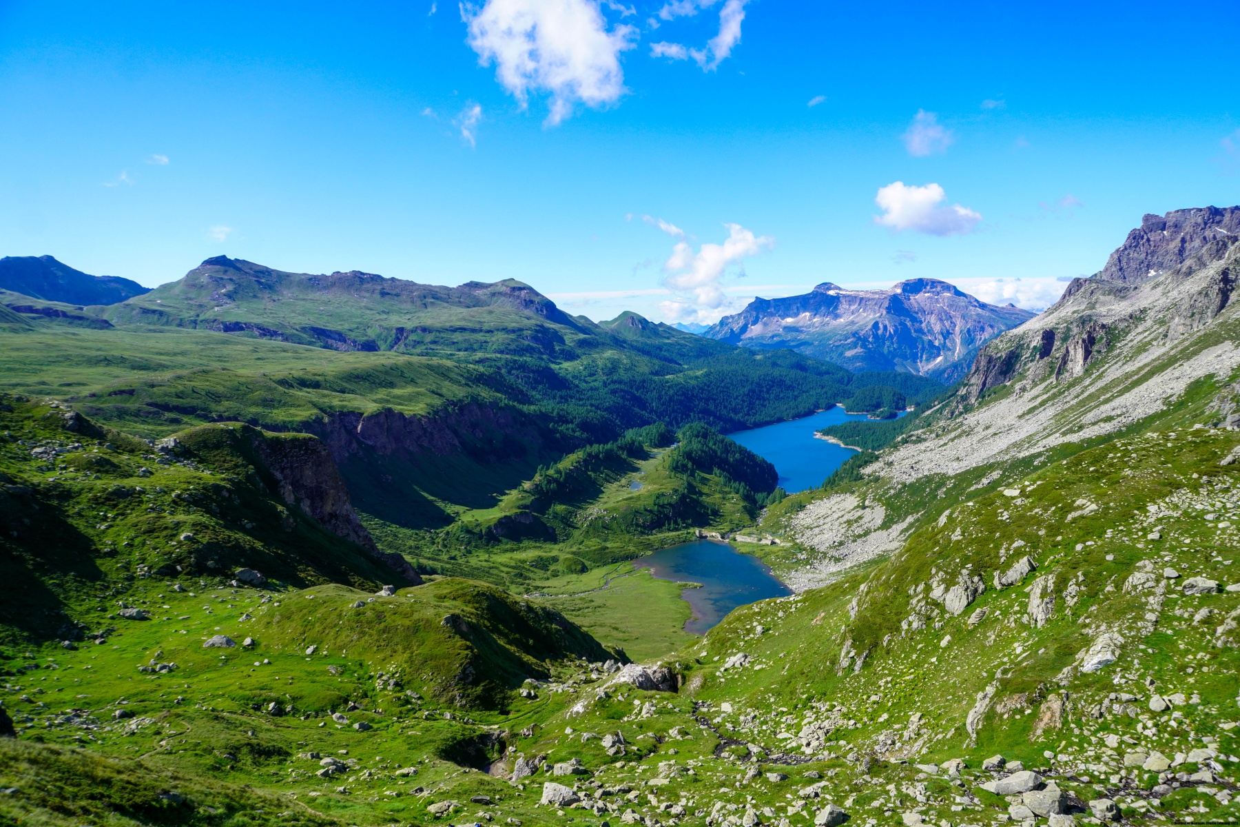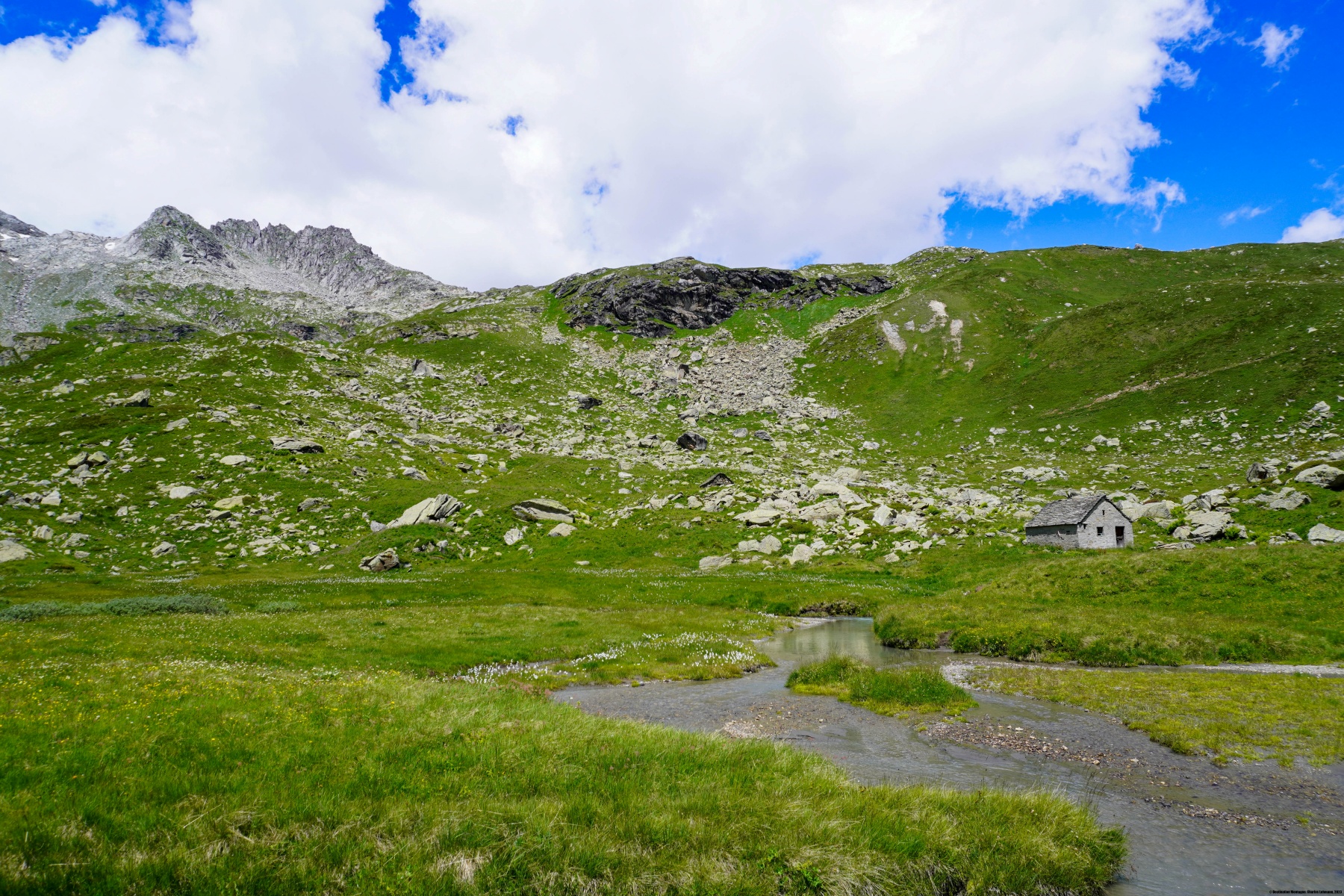 The first few hundred meters of the itinerary below the pass requires crossing a field of large boulders where the path is not always easy. Further down, we found the grass of the pastures before having to cross the marshy area of the Alpe Curzalma. We soon reached the Vannino dam. This dam, built in the 1920s, allowed the volume of a pre-existing natural lake to be increased and that is called the Lebendun.
