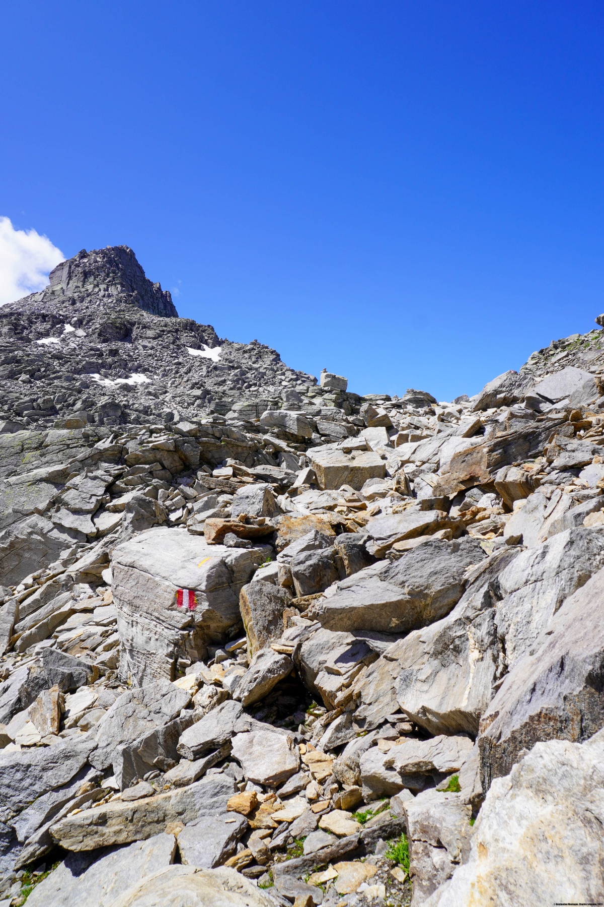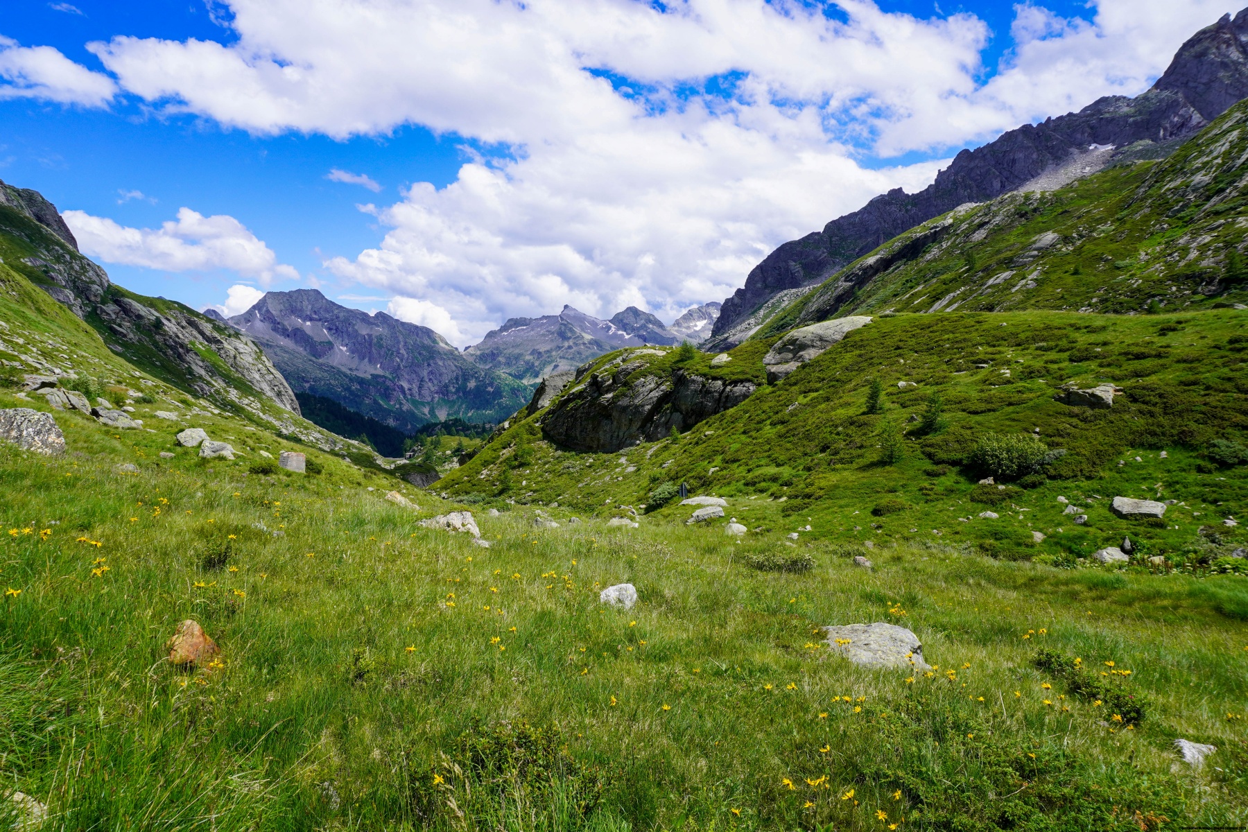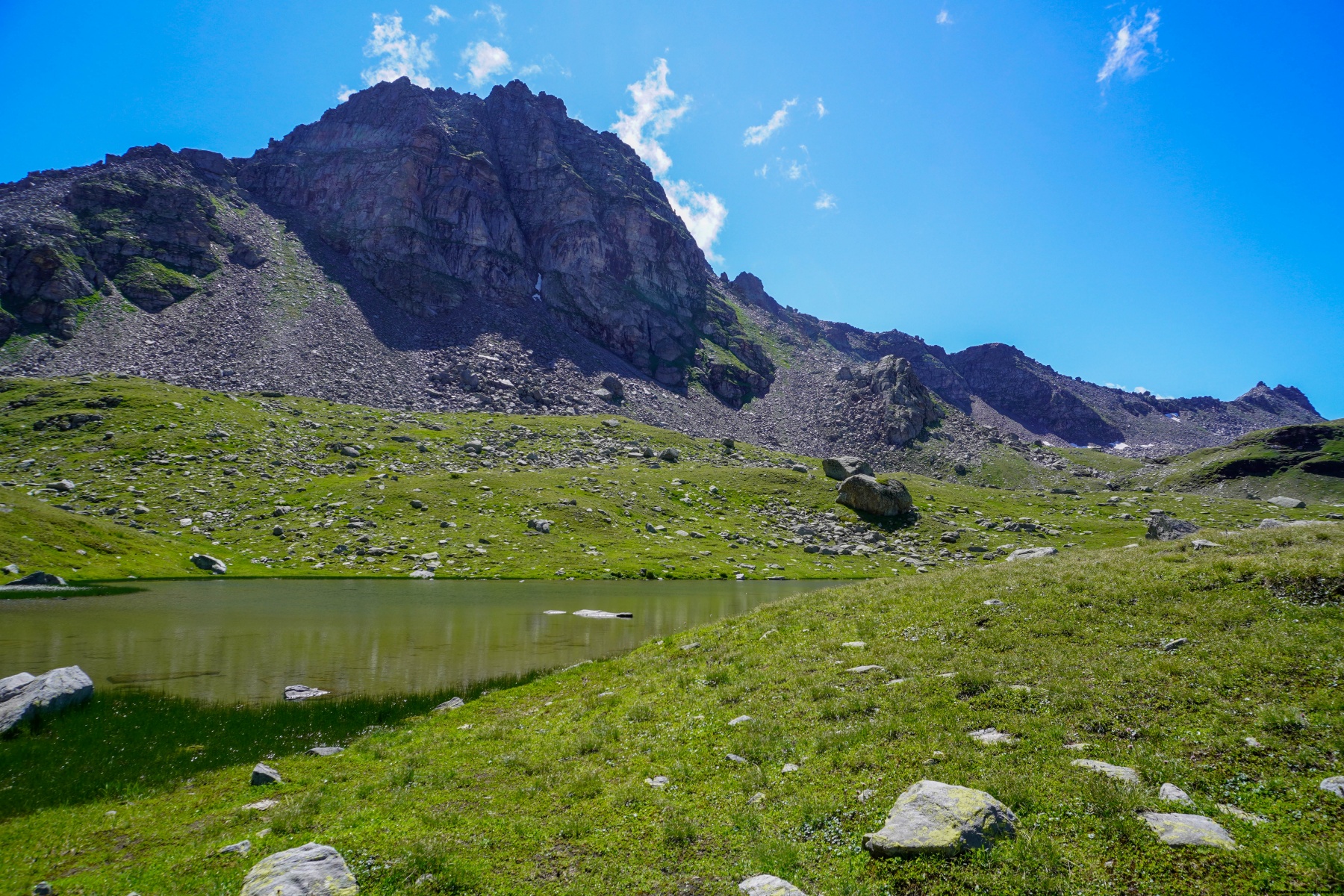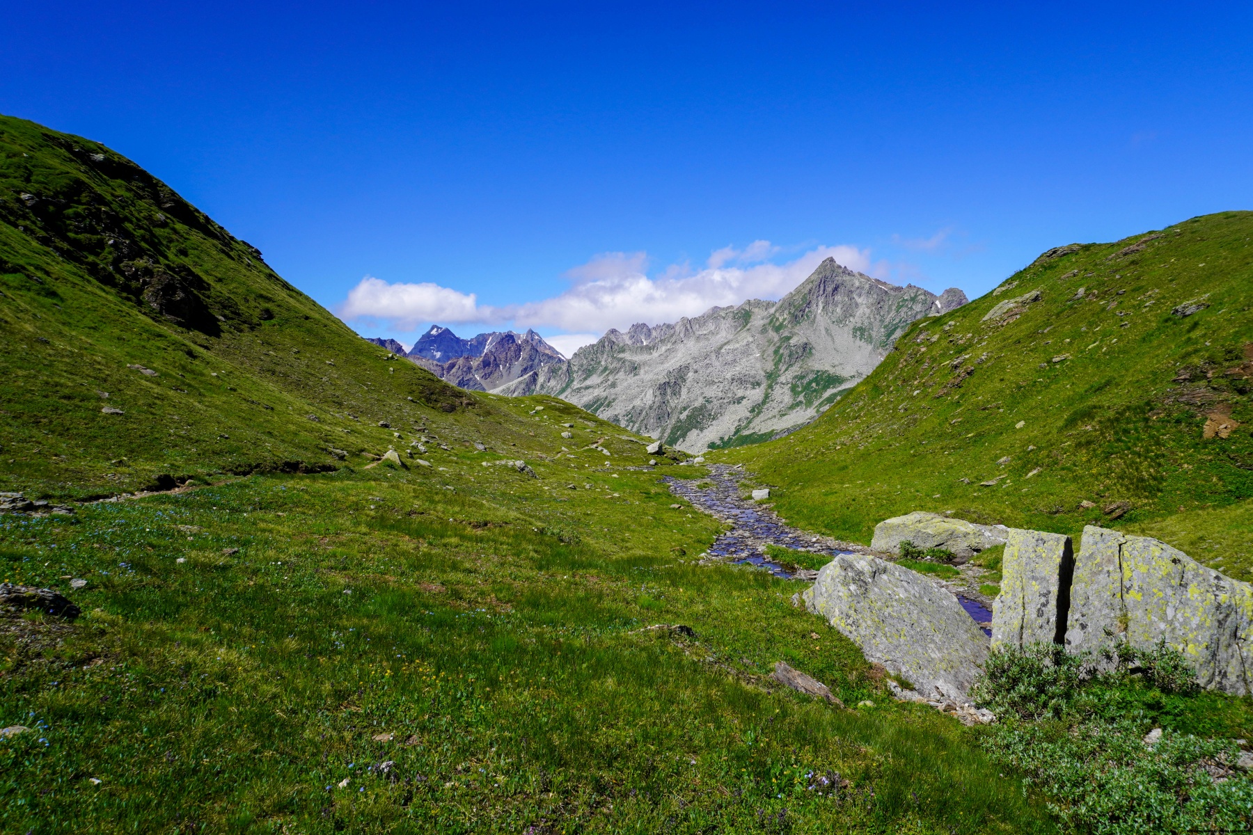 From the mountain pasture, the path climbs along a ridge before entering a small valley leading to the Scatta Minoia. A short passage through large boulders allowed us to reach the mountain slope that we crossed to reach the pass.
