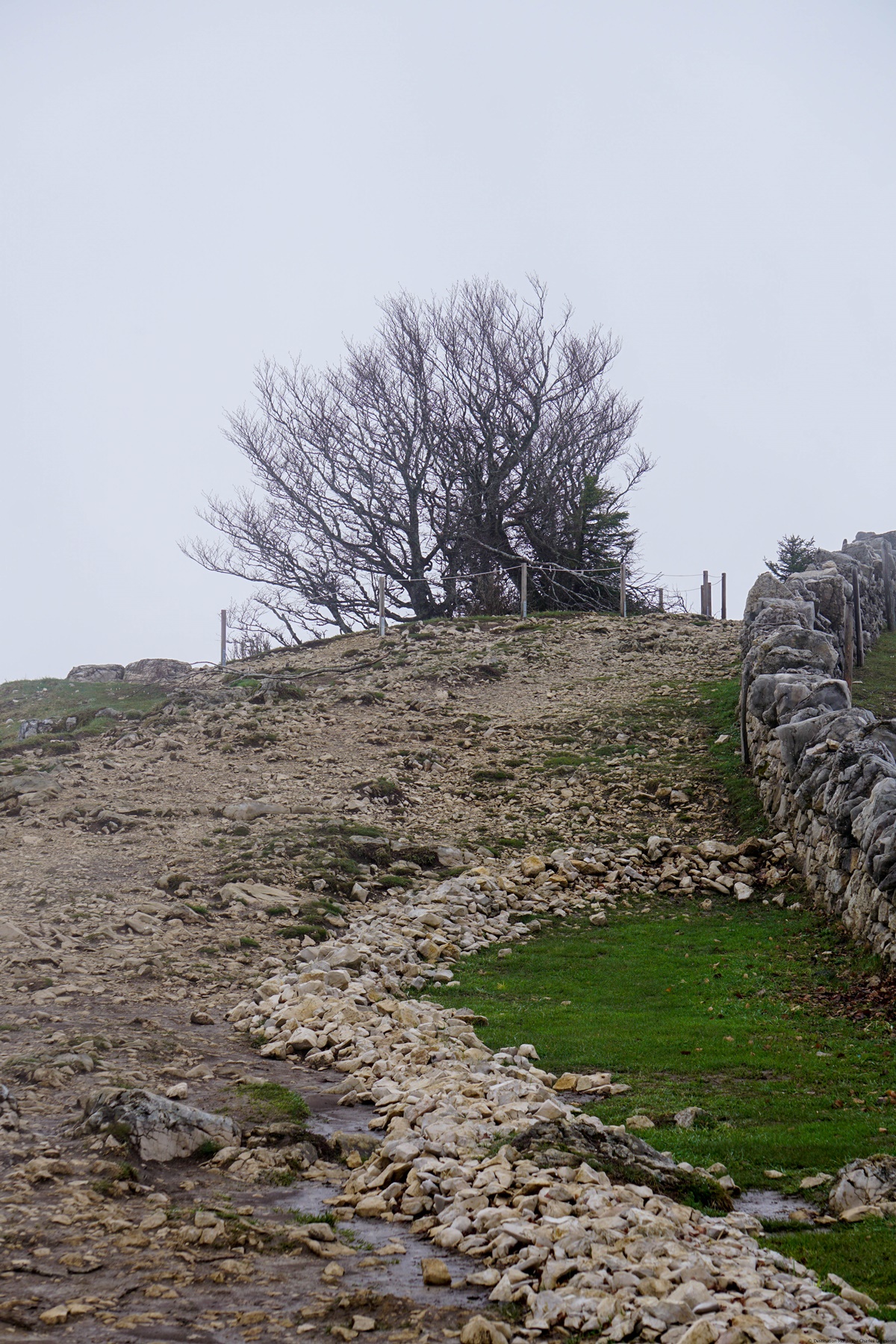 Depuis Noiraigue, j’ai suivi le chemin menant aux Oeuillons, mais pas selon l’itinéraire du Chemin des Crêtes du Jura qui monte d’abord en direction de la Ferme Robert pour traverser sous le Dos d’Ane. J’ai opté pour le chemin forestier qui part sous le fortin et rejoint le sentier susmentionné au-dessus de la ferme des Oeuillons. A partir de là, j’ai suivi le Sentier des Quatorze Contours. Vous n’avez pas à compter : le numéro de chaque contour est peint sur les arbres dans l’ordre croissant à la montée. Au départ, c’est assez déprimant car les sections entre les contours sont longues. A partir du cinquième toutefois, les contours sont de plus en plus rapprochés ce qui fait que l’on passe assez rapidement d’un contour à l’autre. Au quatorzième, on a pratiquement atteint le bord de la paroi du Creux du Van.
