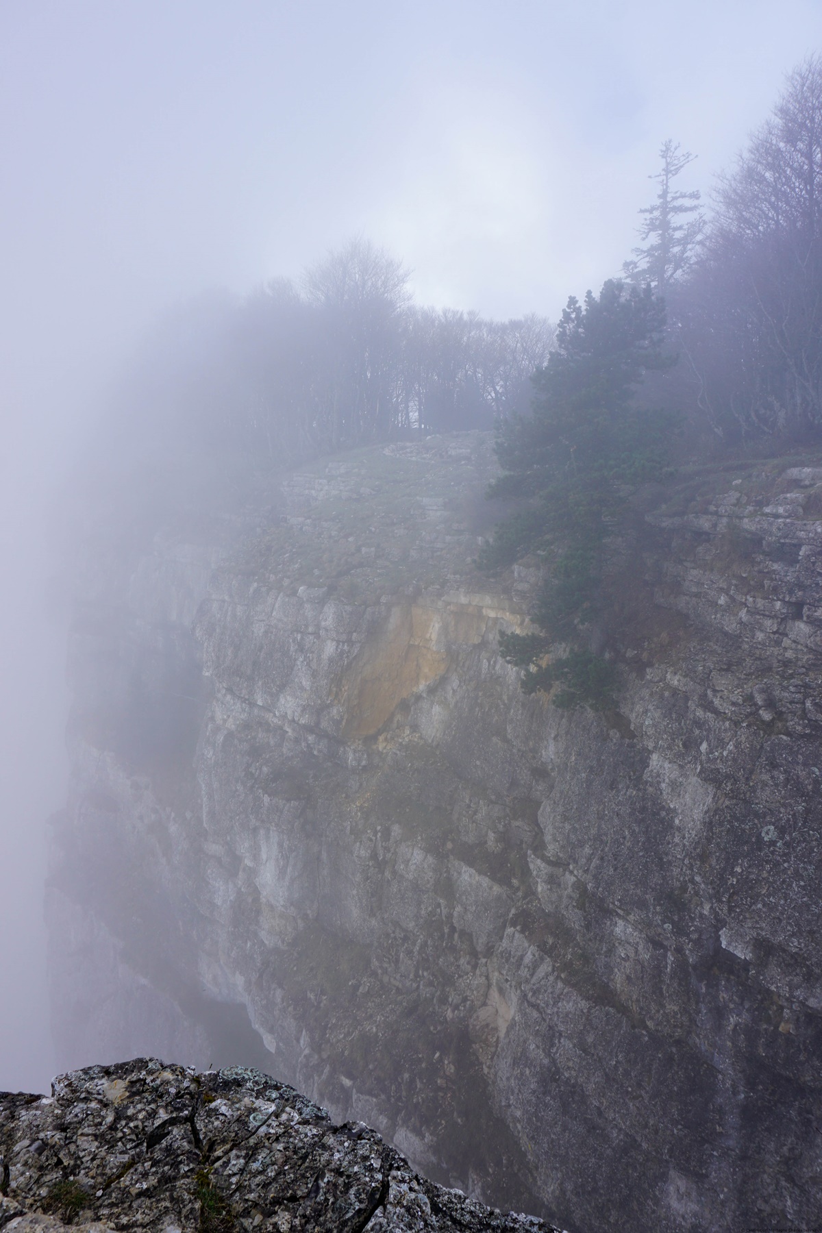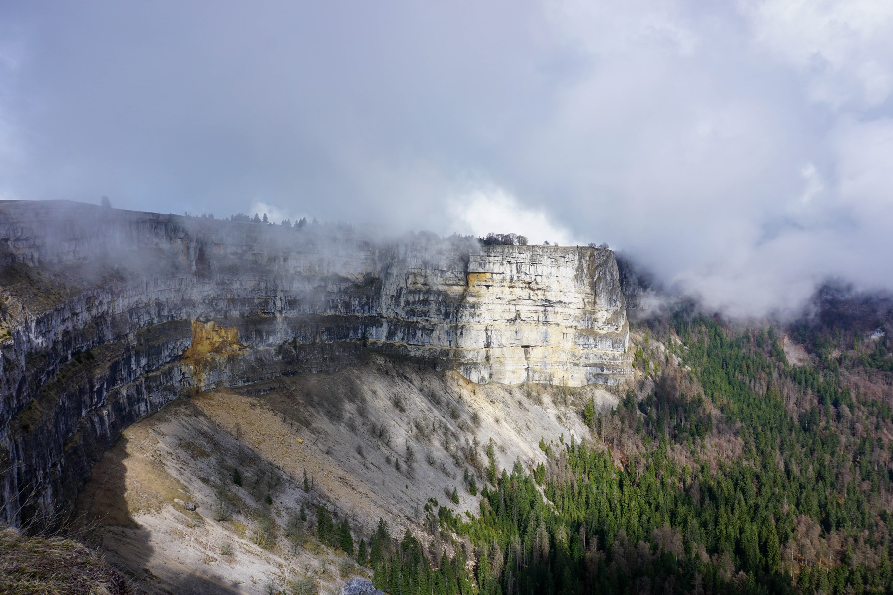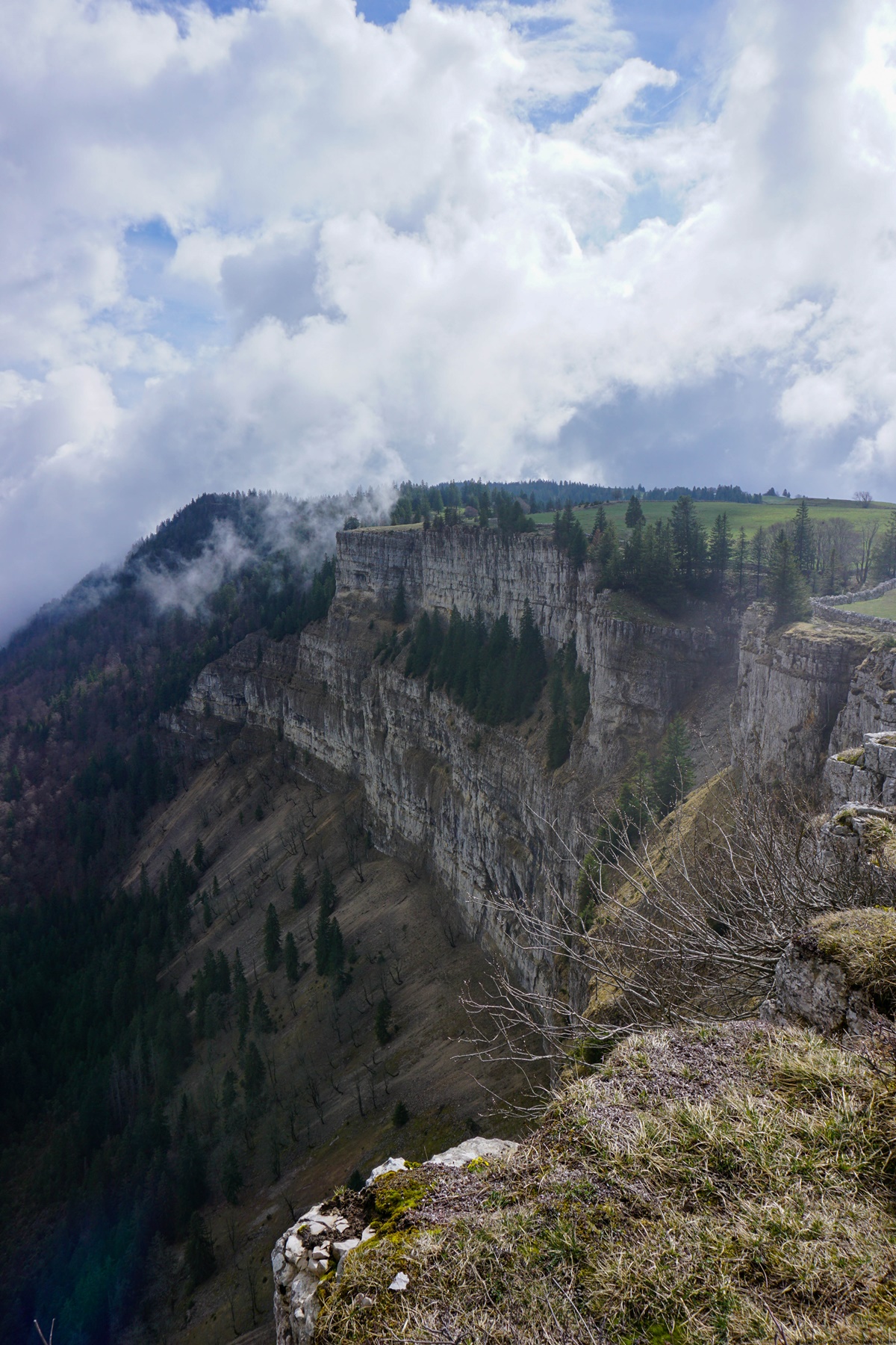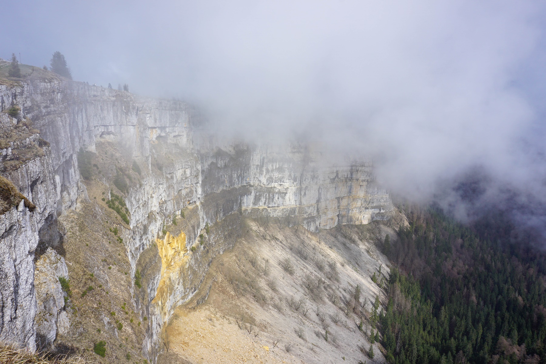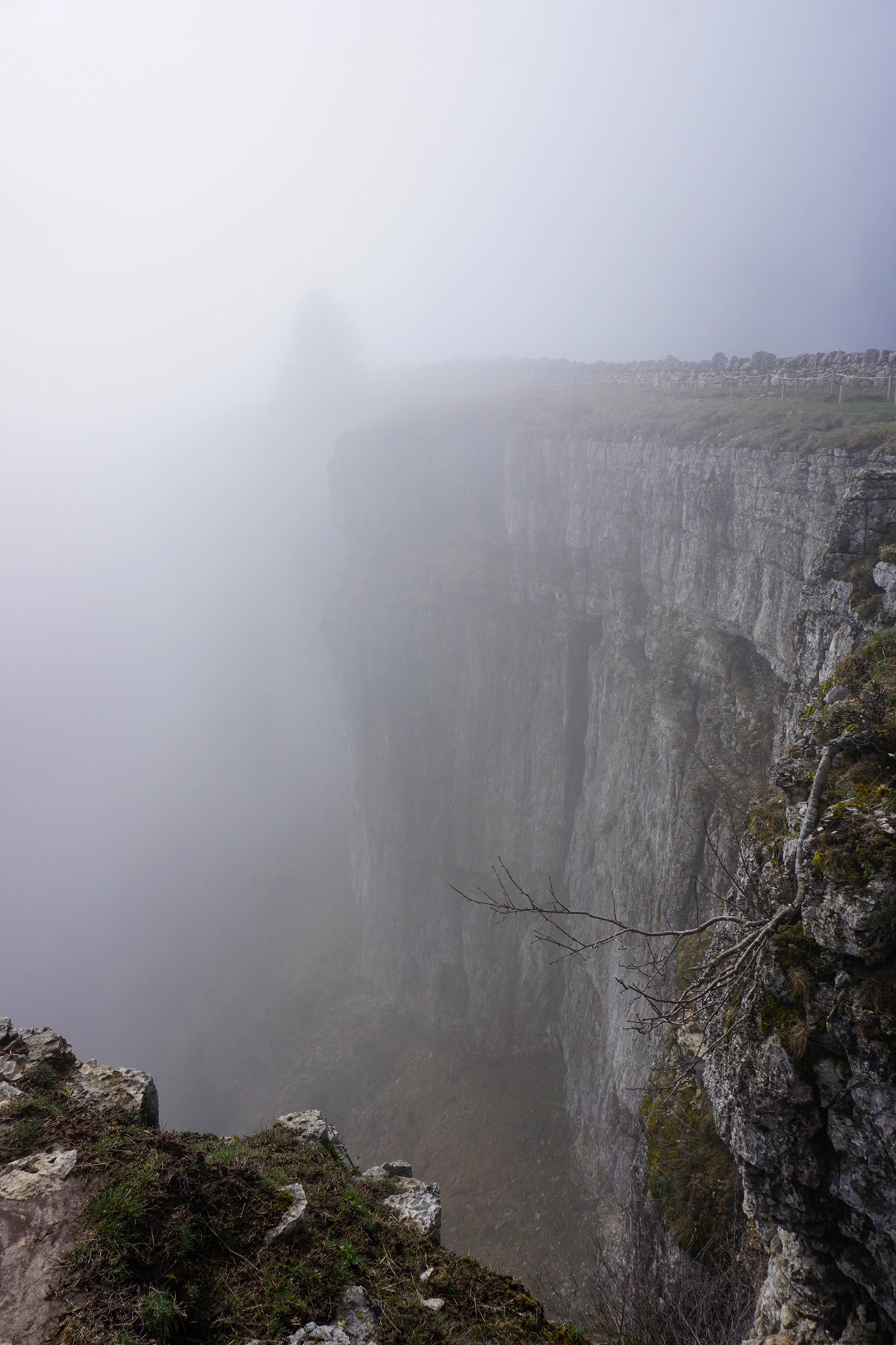 Arrivé au bord du Creux du Van, j’ai pu constater la tragique conséquence de la sur-fréquentation du site. Elle est bien loin l’époque du début des années 2000 où l’on trouvait de l’herbe jusqu’au bord des rochers. La fréquentation incontrôlée a résulté en une destruction quasi totale la flore et de la fine couche de terre végétale. A tel point que certaines zones ont été interdites d’accès afin de permettre au biotope et à la flore associée de pouvoir se régénérer. Quoi qu’il en soit, cela reste un endroit spectaculaire, même s’il faudrait rendre plus difficile les possibilités d’accès.