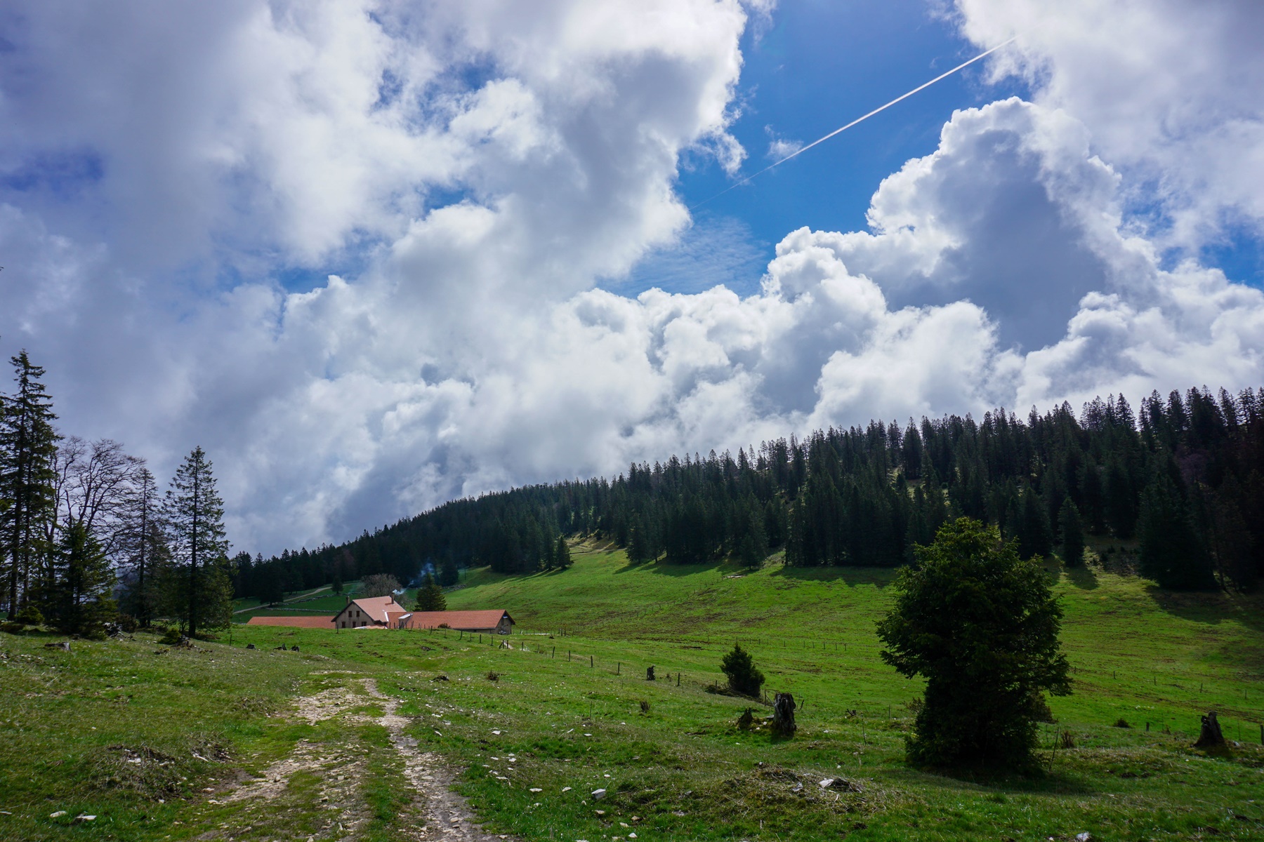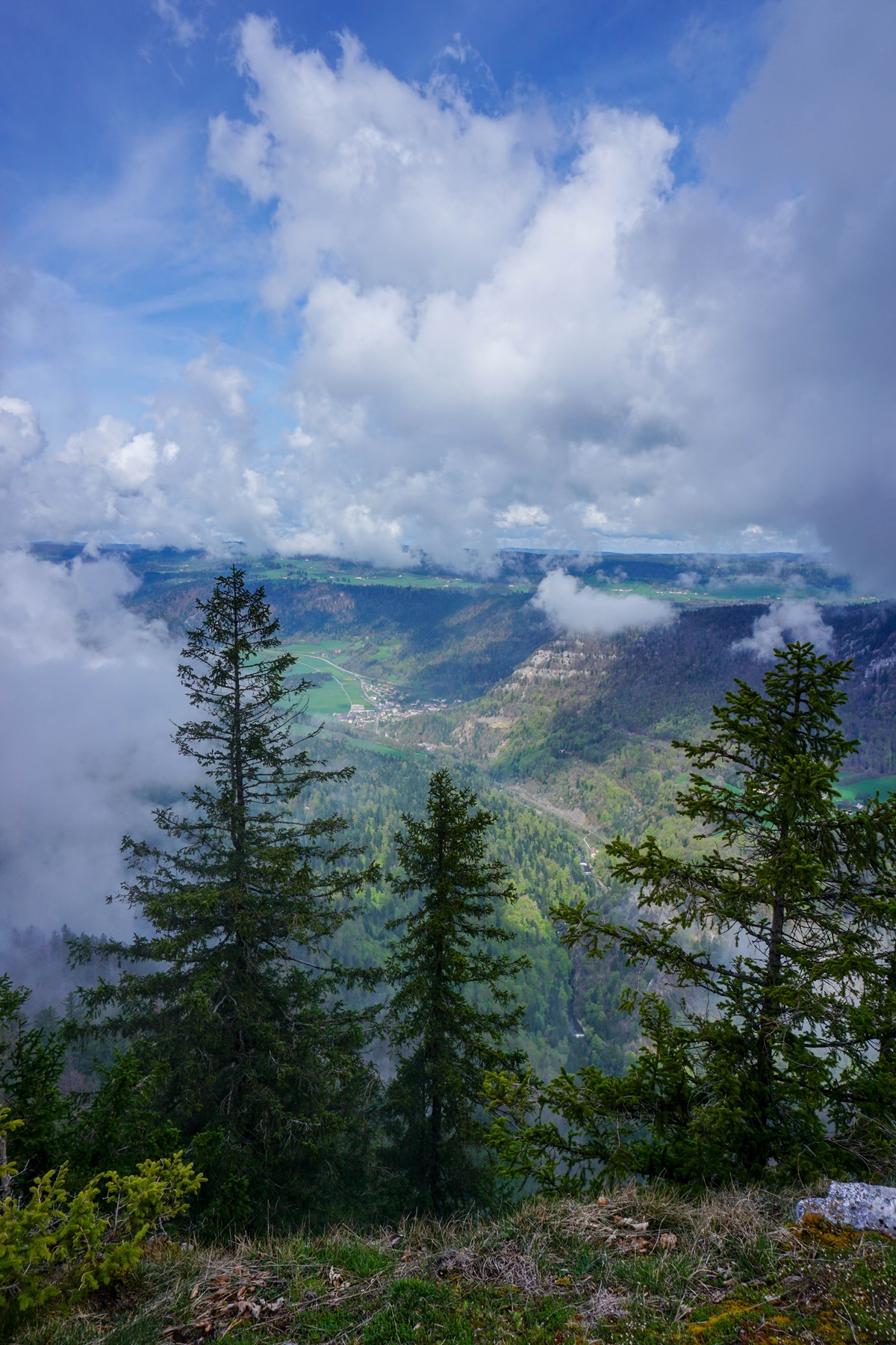 Pour poursuivre, j’ai suivi le sentier qui continue au bord du Creux du Van et j’ai continué au-delà de la bifurcation en direction de la Ferme Robert pour atteindre la Grand Vy. Plus loin, et après être descendu vers le Pré au Favre, je suis monté au Lessy. Là, j’ai eu la surprise d’apercevoir une marmotte. Certes, je savais qu’il y avait des marmottes dans la chaîne du Jura, mais je ne m’attendais pas à en trouver ici. Le sentier passe alors au Signal du Lessy d’où la vue sur Noiraigue et la vallée de l’Areuse est magnifique.