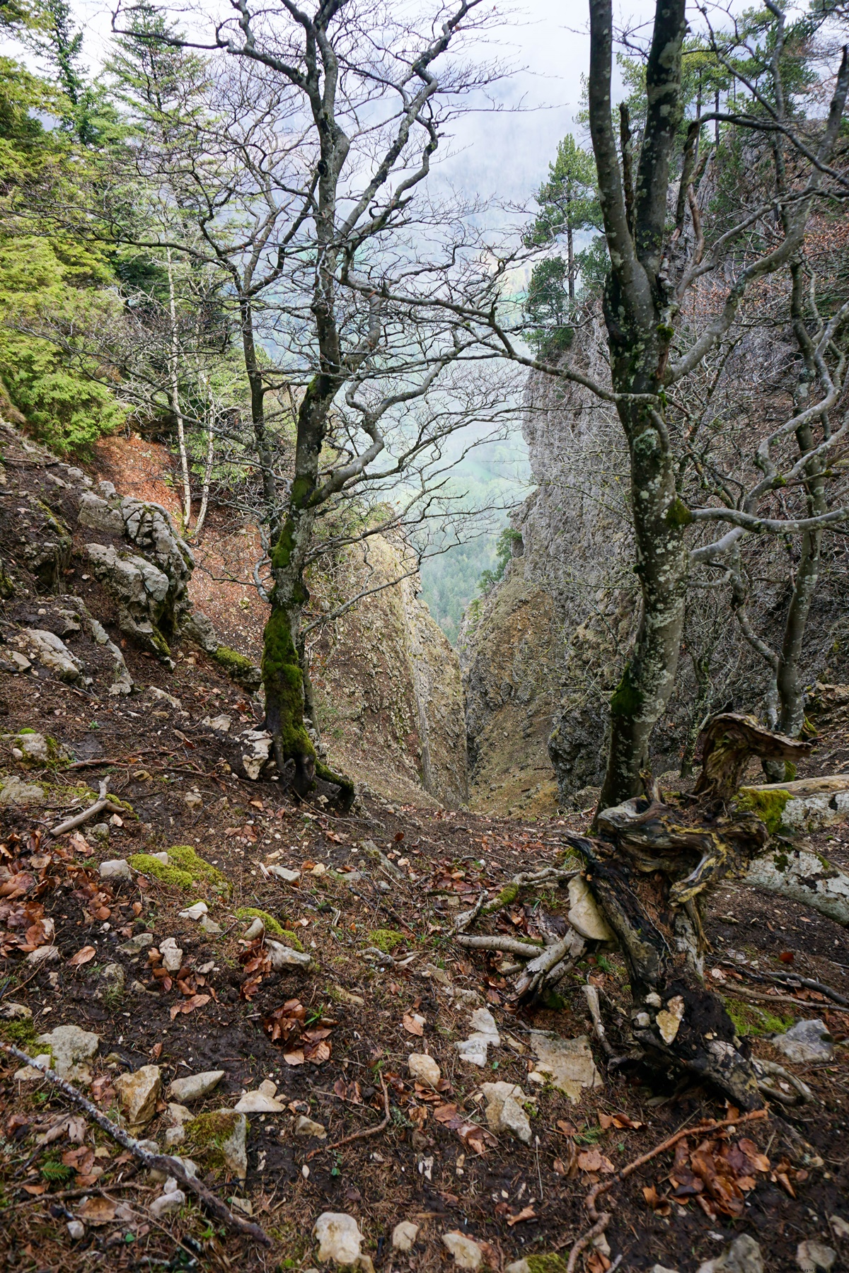 En continuant le long du sentier on passe près de la Petite et de la Grande Ecoeurne. Il est intéressant de noter que beaucoup interprètent l’Ecoeurne comme étant un promontoire alors qu’en fait, ce toponyme désigne une entaille. Et c’est bien ce dont il s’agit. En allant voir au bord de la Grande Ecoeurne, je me suis demandé comment ont pouvait passer par là. Car, il semblerait que la montée ou la descente par cette gorge soit effectuée encore régulièrement. Du reste les cartes historiques indiquent un sentier montant jusqu’au pied de la Grande Ecoeurne.