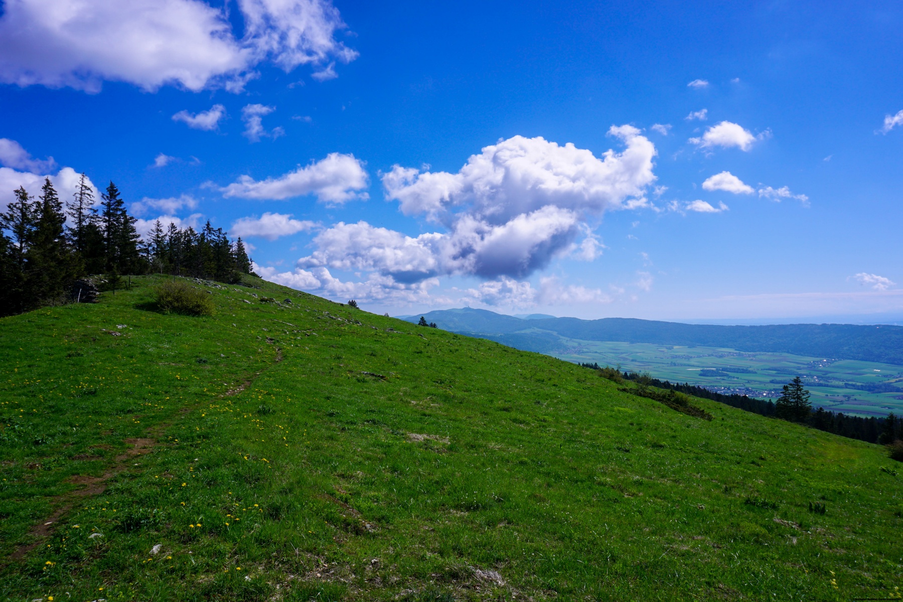 En suivant la crête, on commence par descendre vers un petit col avant de monter à travers bois. Sur cette partie, il n’y a pas de vue. En revanche, on ne tarde pas à aboutir dans les pâturages près de la Pradière où l’on bénéficie à nouveau de la vue sur le plateau et les Alpes.