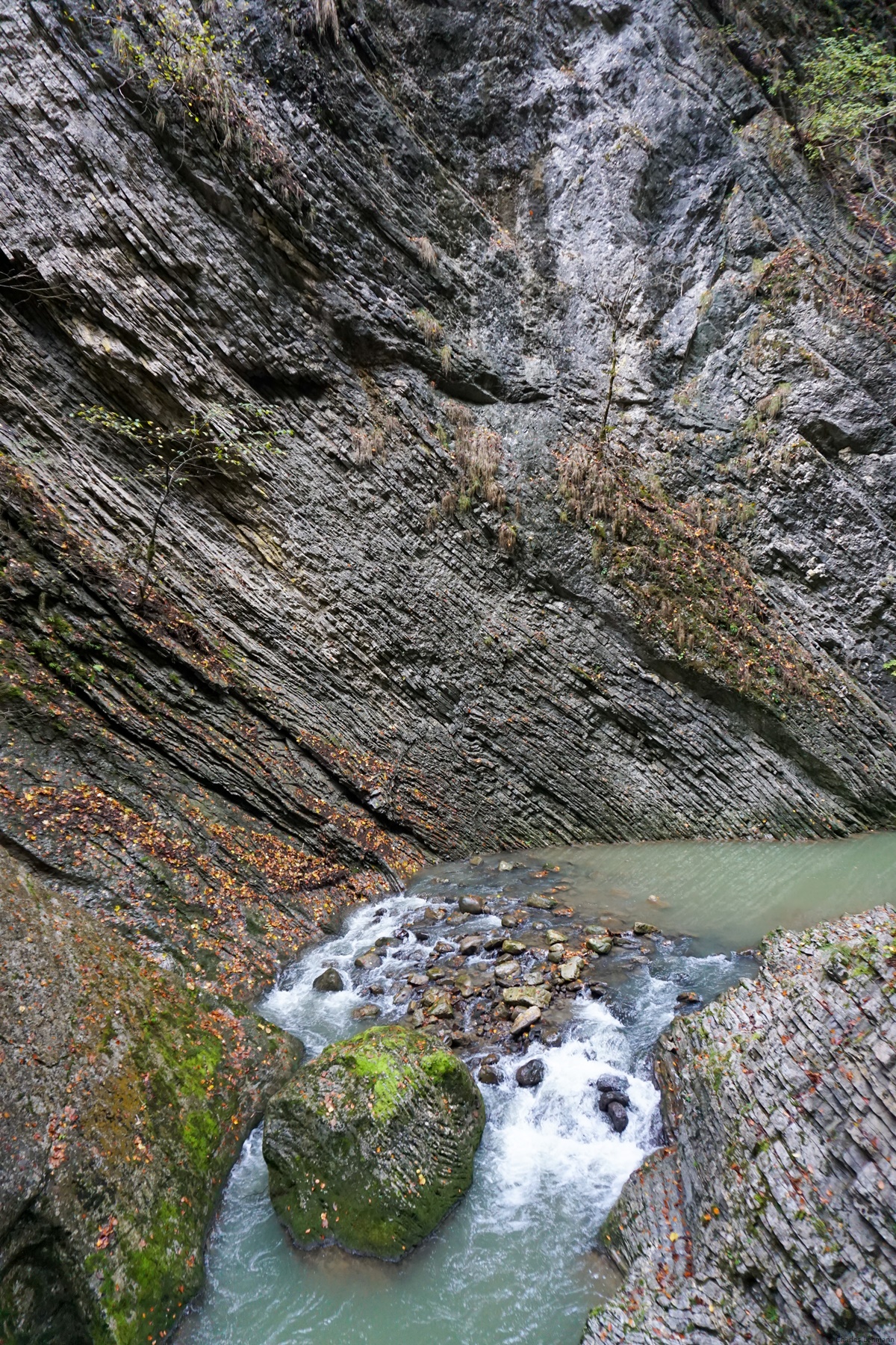 A partir de là, le sentier évolue un bon bout sur la rive droite de la Jogne, face à d’impressionnantes parois calcaires. Arrivé près d’un second verrou rocheux, le sentier traverse encore une fois une courte galerie avant de descendre en direction de la rivière qui se franchit sur une autre passerelle. La montée, en face, est raide et pénible, mais on ne tarde pas à comprendre pourquoi il faut autant monter : on doit, en effet, dépasser la hauteur de la couronne du barrage.