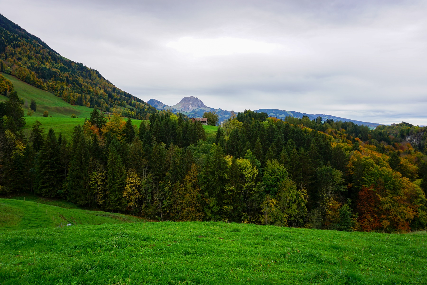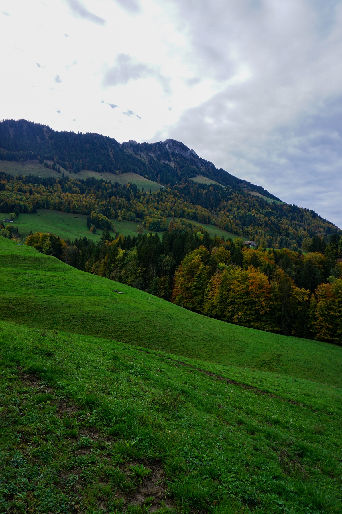 Le Chemin du Panorama Alpin franchit le barrage et évolue en rive droite du Lac de Montsalvens, avant de traverser un bras du lac sur un pont suspendu. Mais dans mon cas, j’avais suivi la rive gauche du lac pour pénétrer un bout dans la Vallée du Motélon. Lorsque l’on s’est engagé un bout de chemin dans cette vallée, on rejoint la route du Pessot qu’il faut alors suivre un moment pour revenir en arrière sur l’autre rive. On peut ainsi rejoindre la belle chapelle de la Monse.