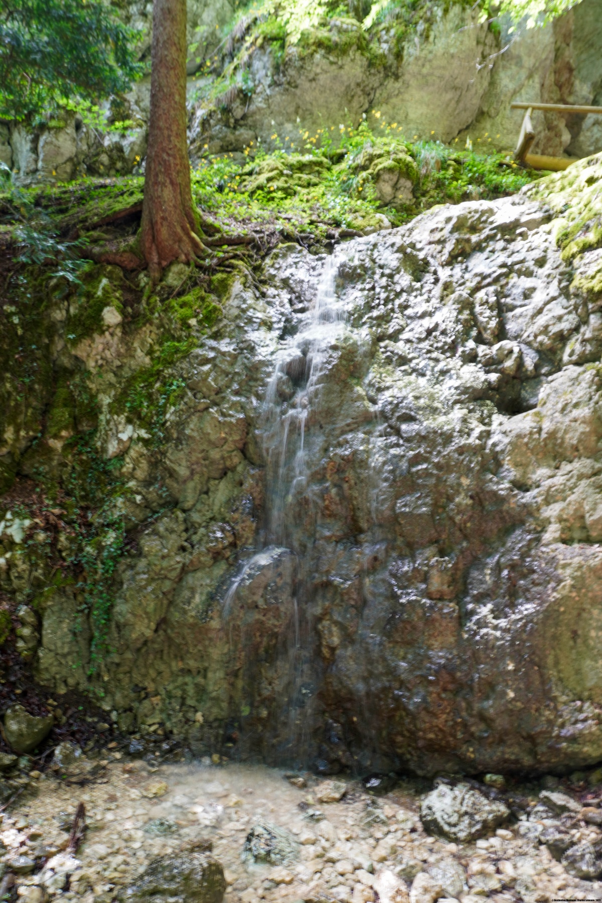 Depuis Nesselboden, nous avions suivi le sentier indiqué comme balisé sur la carte topographique. En réalité, celle-ci est fausse et l’itinéraire balisé se trouve sur le chemin forestier passant un peu plus haut. Après avoir contourné l’arête descendant du Balmfluechöpfli, nous avions repéré le début du Clubwägli, marqué par deux grands cairns. Le sentier descend à travers des pentes assez raides tout en décrivant quelques lacets permettant de contourner des parois de rocher. Bie que ce sentier ne soit pas officiellement balisé, on retrouve quand même quelques traces de peinture rouge, notamment à deux endroits où on pourrait avoir un doute quant à la suite. A la fin du sentier, on atteint le pied de la paroi et on longe le petit ruisseau du Chesselbach dans une curieuse gorge. Je coterai aussi le Clubwägli en T4, mais en précisant que c’est peu soutenu. En effet, seuls deux courts passages nécessitent l’usage des mains pour la progression.