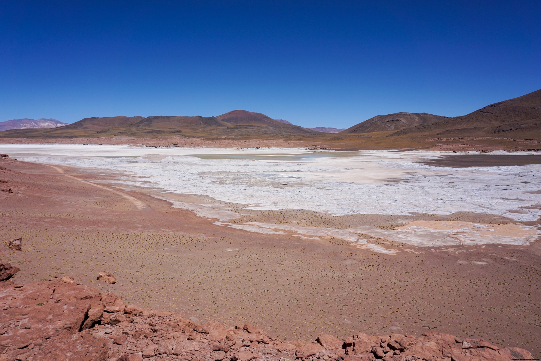 En ce premier jour complet au Chili, nous sommes partis au sud en longeant le Désert d’Atacama pour monter aux différentes lagunes se trouvant sur les hauts. Les contrastes de couleurs sont saisissants, en particulier aux Piedras Rojas. Celles-ci portent bien leur nom puisque l’on se trouve dans un environnement très minéral de roches rouges entrecoupées de lagunes de sel, donc blanches.