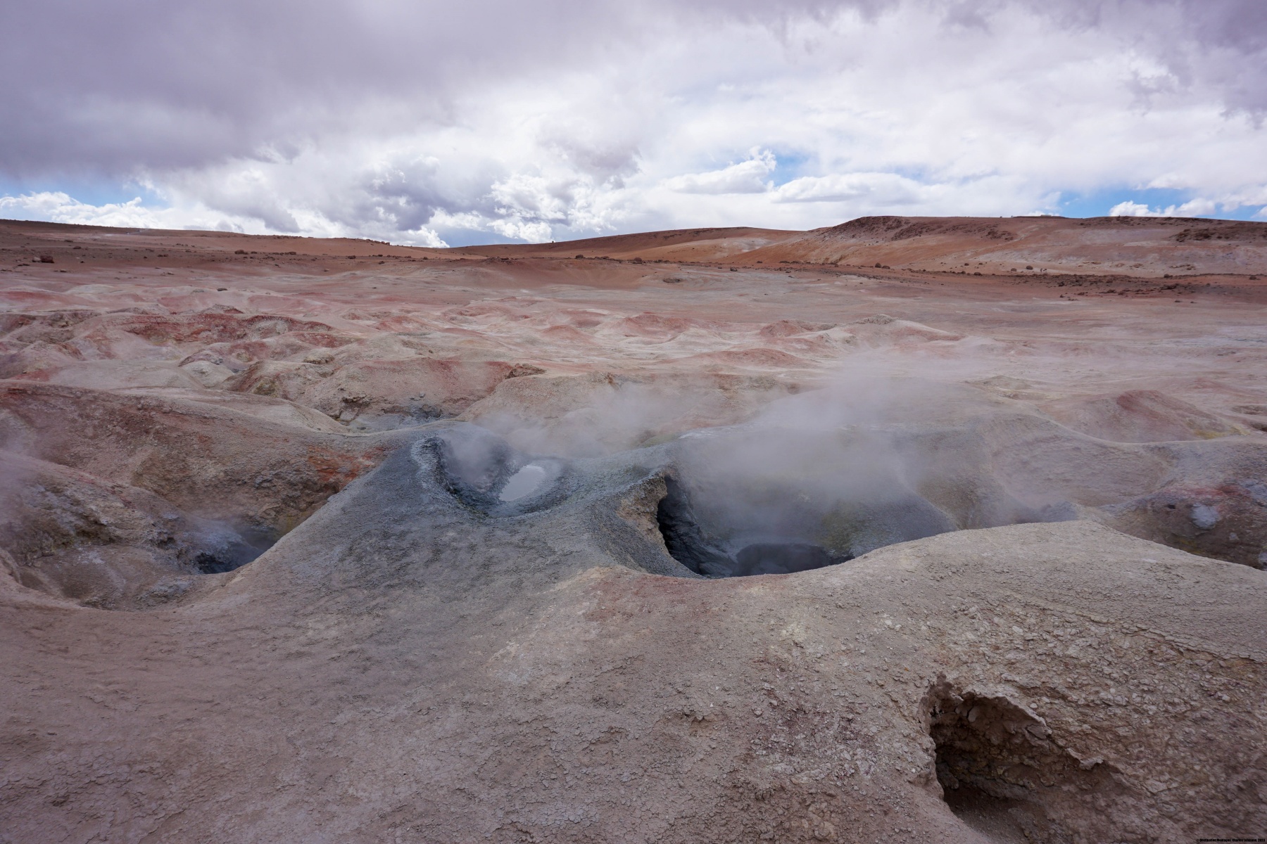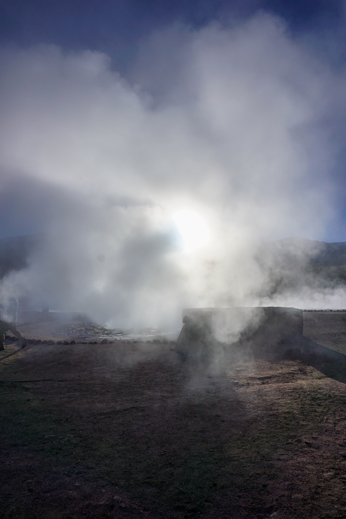 En ce jour, nous sommes partis tôt le matin en direction du nord, alors qu’il faisait encore nuit. Le but était d’arriver aux Geysers du Tatio avant que le soleil n’illumine le fond de la caldeira, car plus tard, avec l’augmentation de la température, la vapeur d’eau est nettement moins visible. Il est saisissant de mettre la main au sol à certains endroits et de sentir la chaleur, ainsi que le gargouillement de l’eau sous-jacente.
