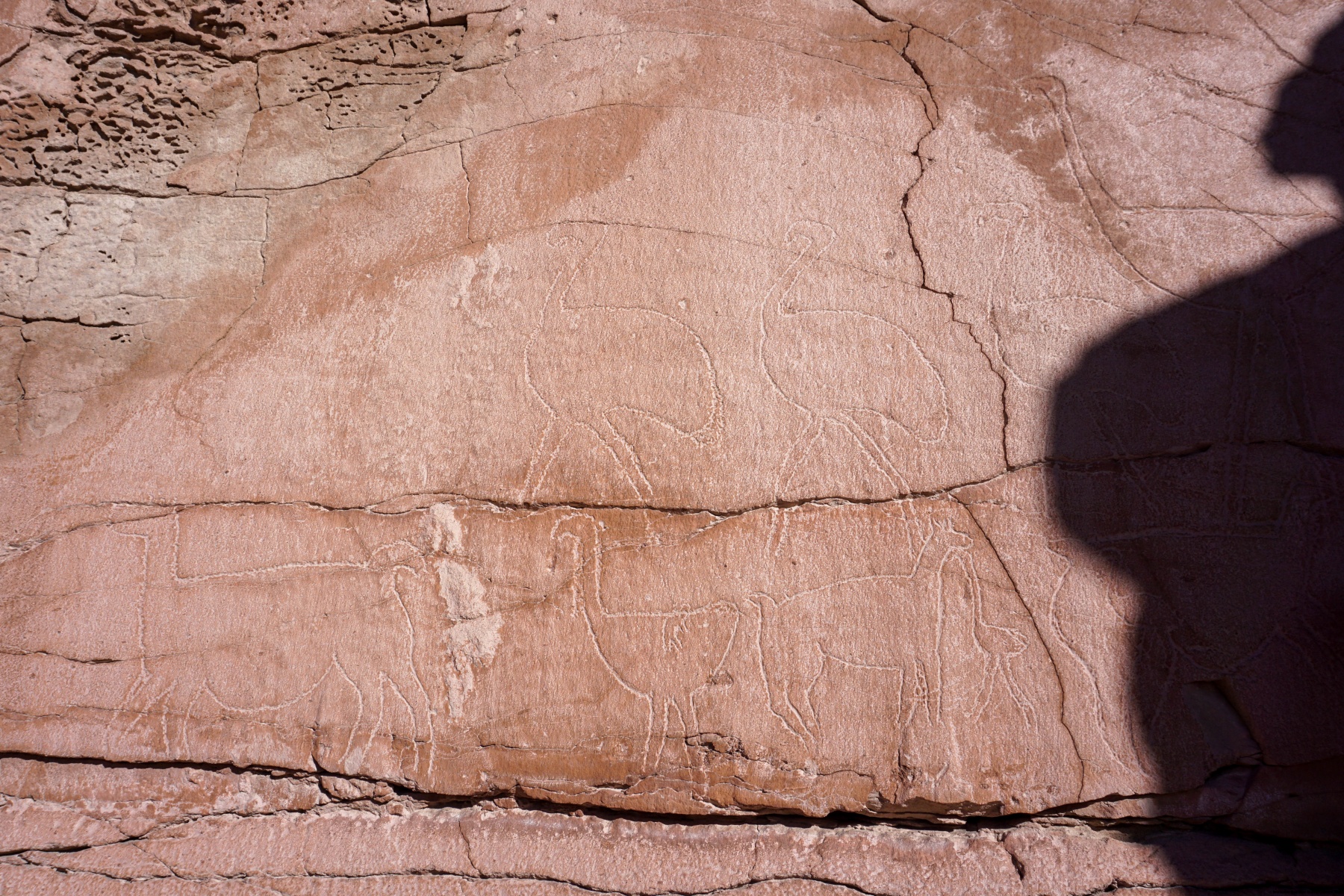Au retour à Talabre, et avant le souper, nous sommes encore allés visiter les pétroglyphes de Talabre. L’âge de ces pétroglyphes n’est pas clairement établi, mais ils établissent une fréquentation régulière depuis des temps reculés. Les gravures représentent non seulement des animaux que l’on peut rencontrer localement, soit domestiques, soit sauvages. On peut mentionner les flamands, les lamas et le puma. On y trouve également des représentations schématiques de chamanes.