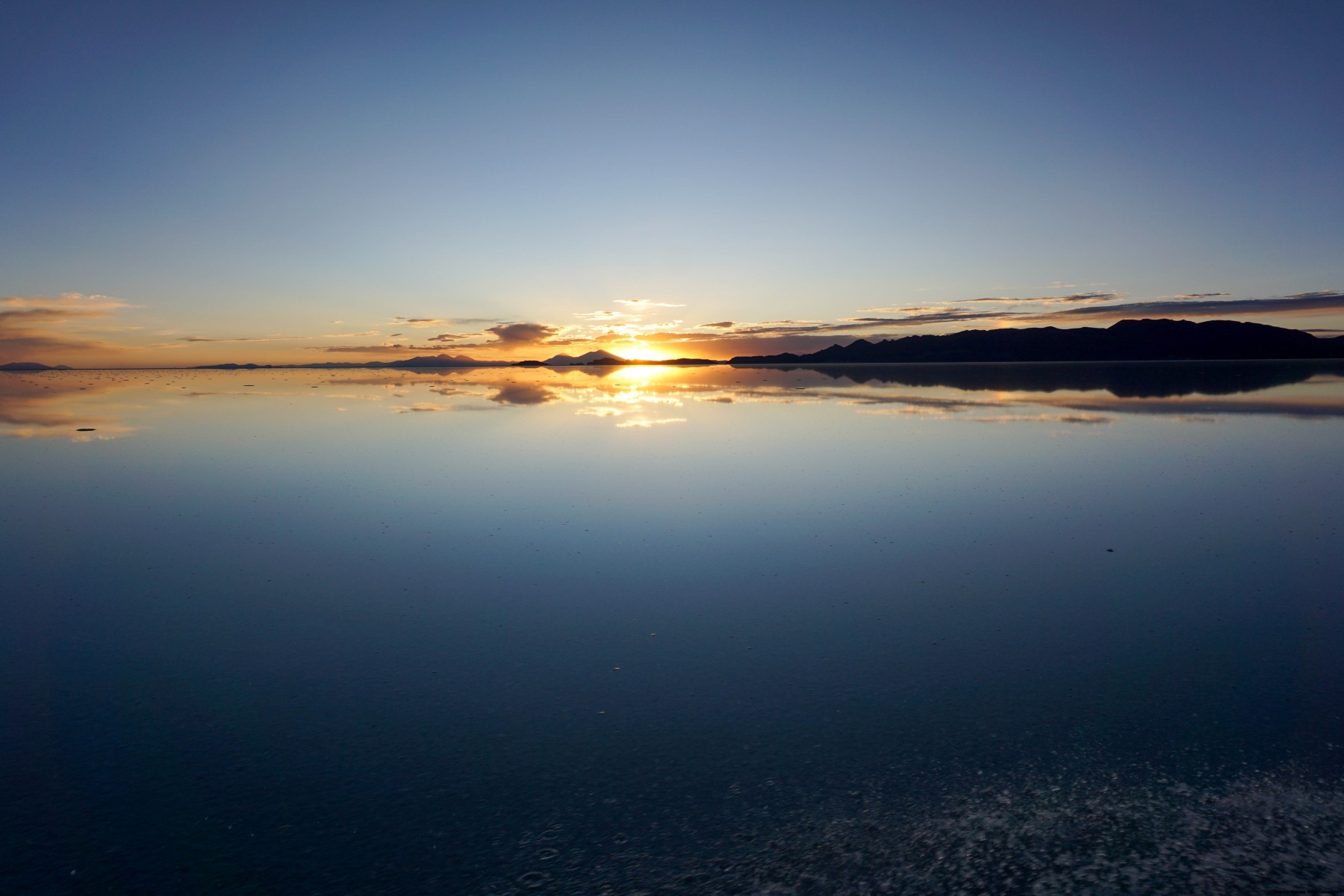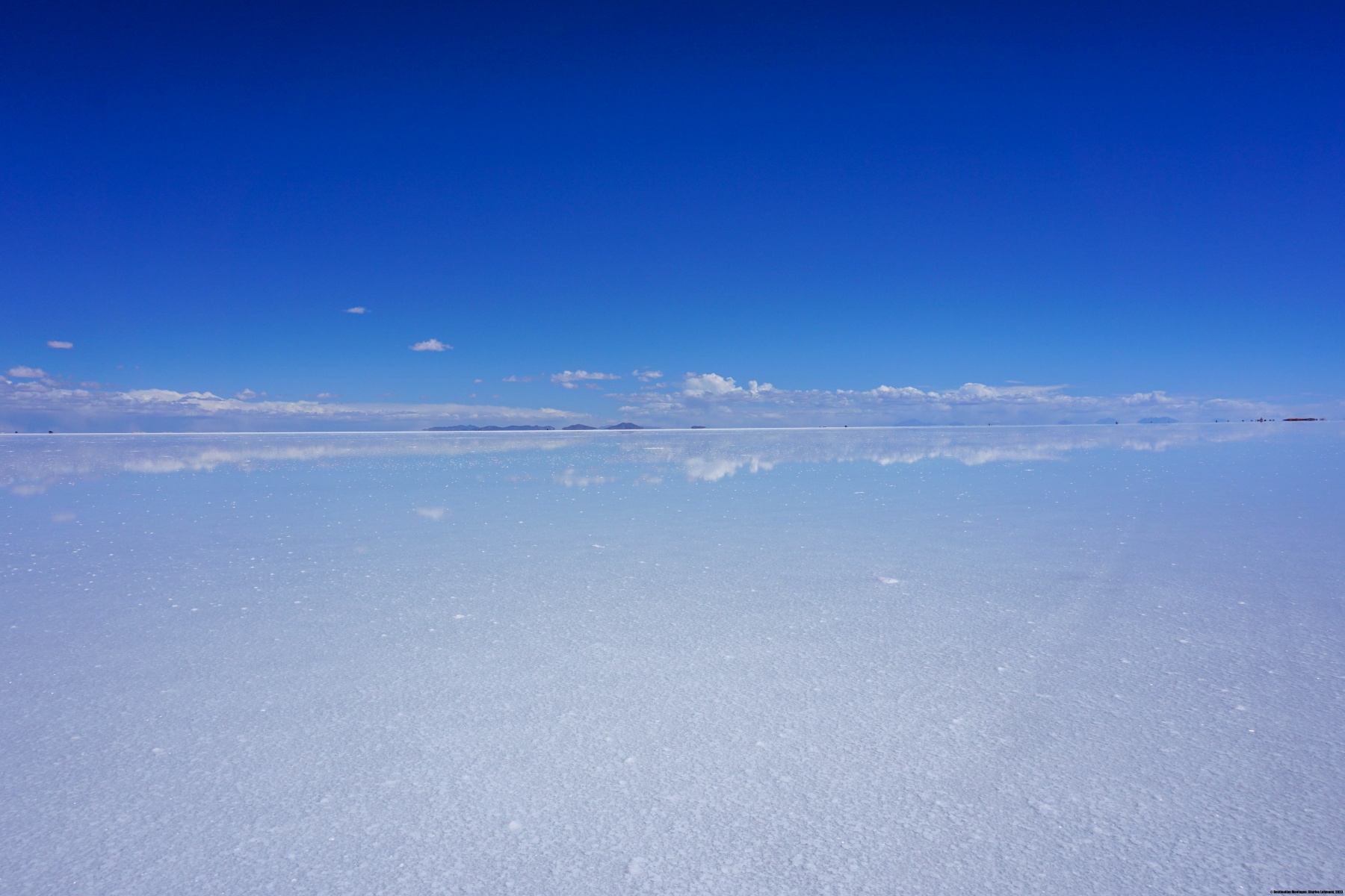 Le périple n’était pas terminé pour autant : il nous fallait traverser le Salar d’Uyuni. Ce « lac de sel » a des dimensions énormes : grosso-modo 80Km de large sur 100Km de long. Cette traversée a été une expérience totalement déroutante pour moi. D’abord parce qu’avec de telles dimensions, on commence à prendre conscience de l’effet de la courbure de la surface terrestre. En effet, ce qui apparaît au loin comme des îles sont en réalité les montagnes se trouvant sur l’autre rive. Il existe certes quelques îles (dont la fameuse Incahuasi) mais la plupart des « îles » que l’on voit sont des sommets. Ensuite, la traversée nous a pris plus de 4 heures. Cette durée est le résultat de la faible vitesse imposée par moment, car il se trouvait entre 10 à 20 centimètres de saumure par endroits. On a vraiment l’impression de ne pas avancer : on roule des heures et les montagnes à l’horizon ne semblent pas vouloir s’approcher. C’est pourquoi nous sommes arrivés à Tahua alors que la nuit était déjà tombée.