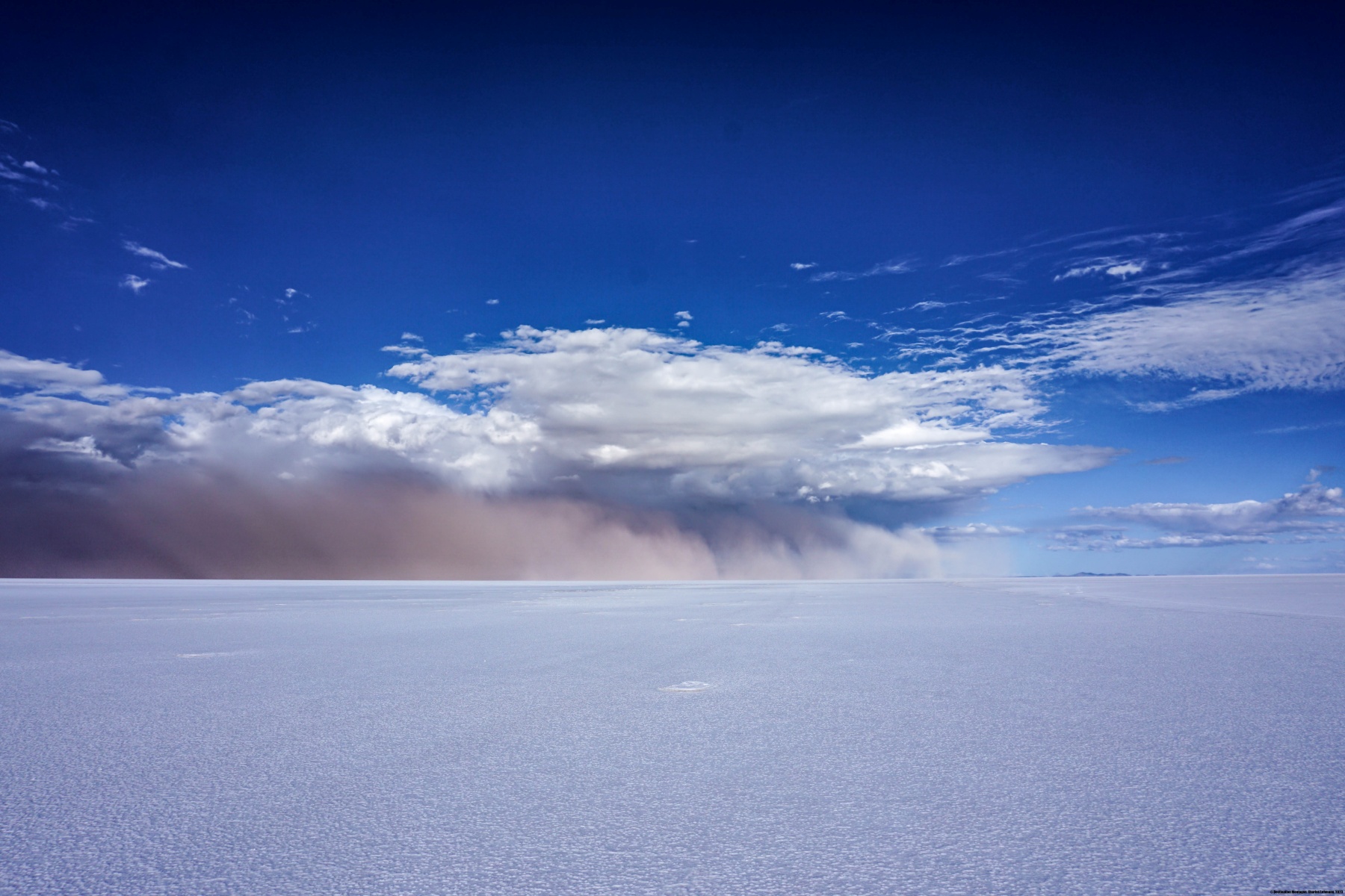 Au retour à Coqueza, nous avons retraversé le Salar dans l’autre sens. Nous avons pu assister à un spectacle saisissant : une tempête de sable passant par-dessus le Salar.